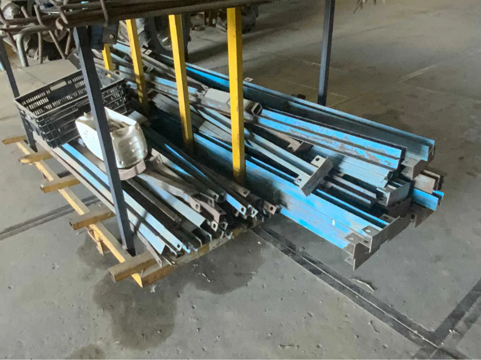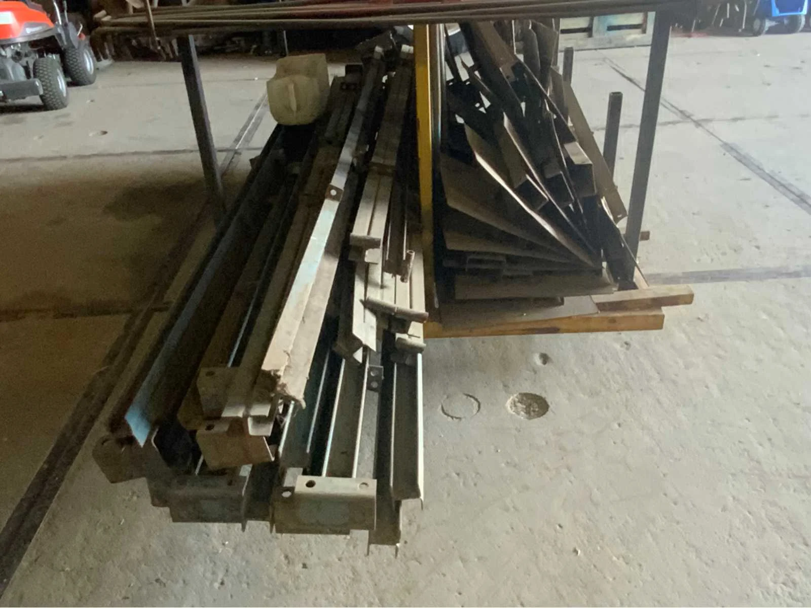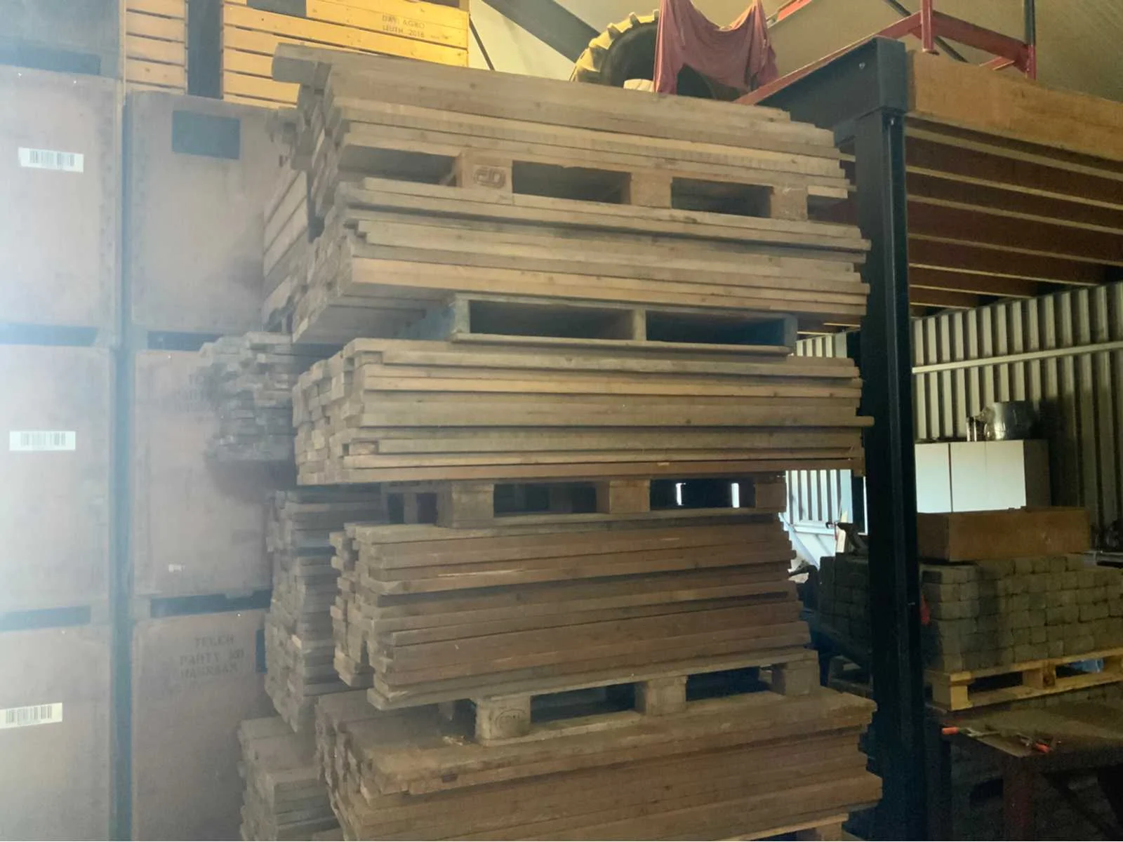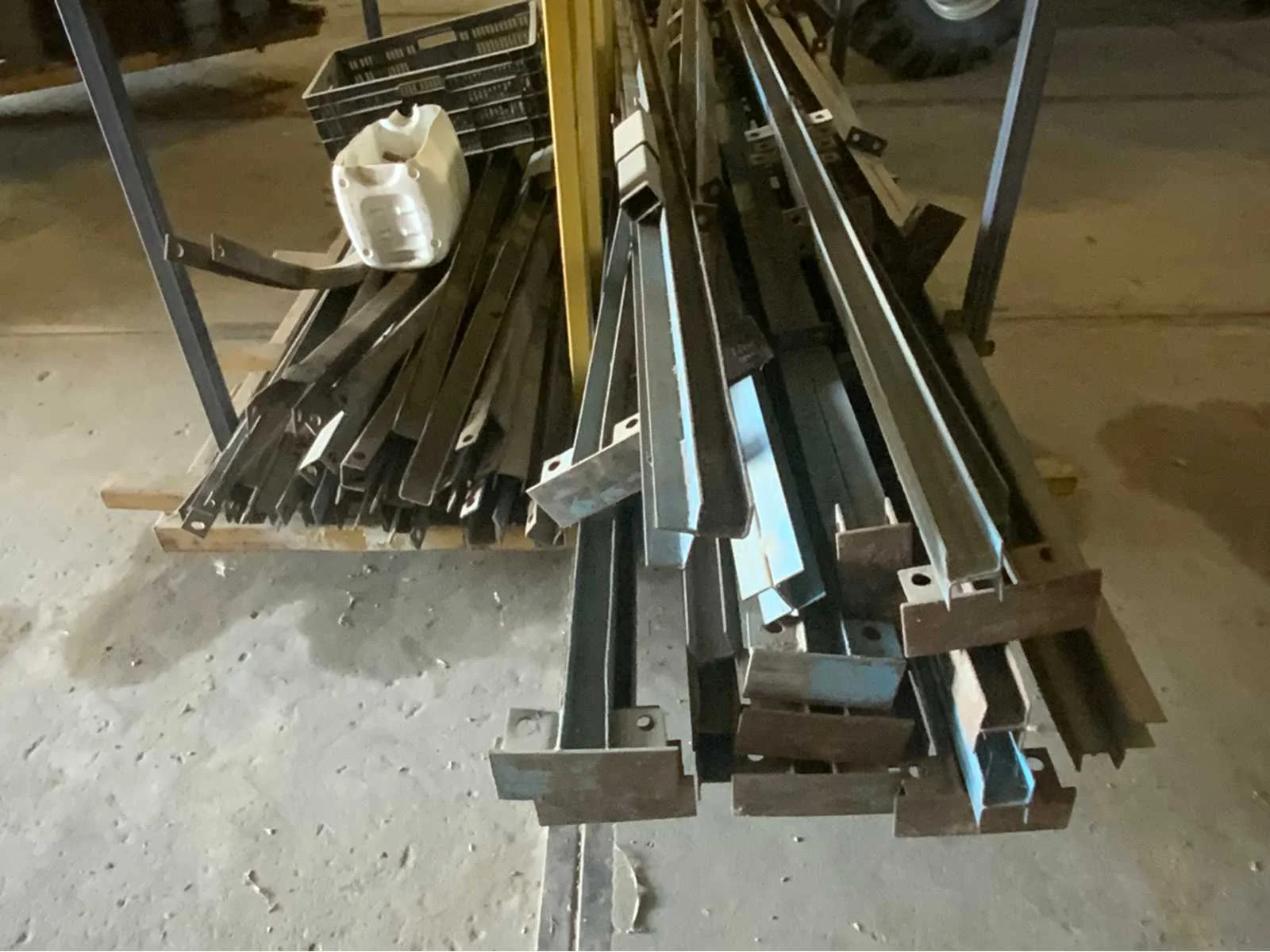 Bestaande uit 2 verbouwd glasbokken met staanders, voetplaten, schoorstangen en keerwanden, 9 pallets met keerwand planken, 2 hoeken, diverse lengte planken tot circa 180cm, planken gesorteerd op lengte met kleur. Nee