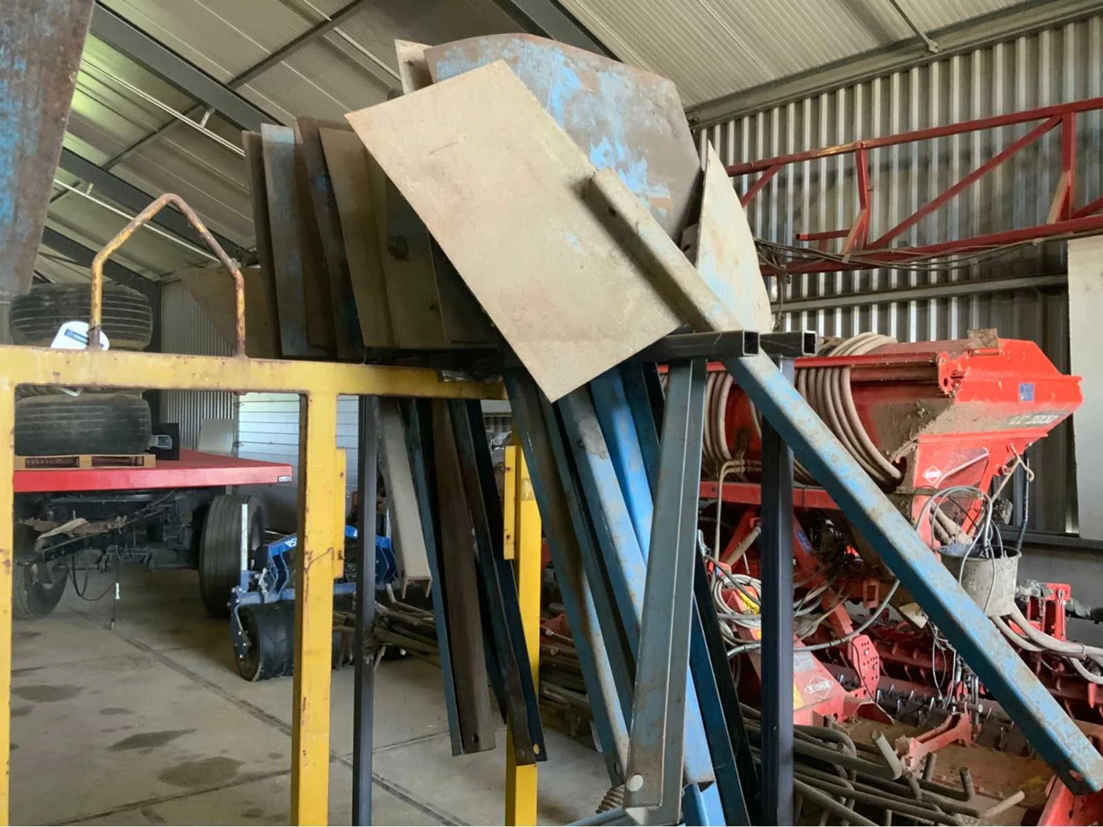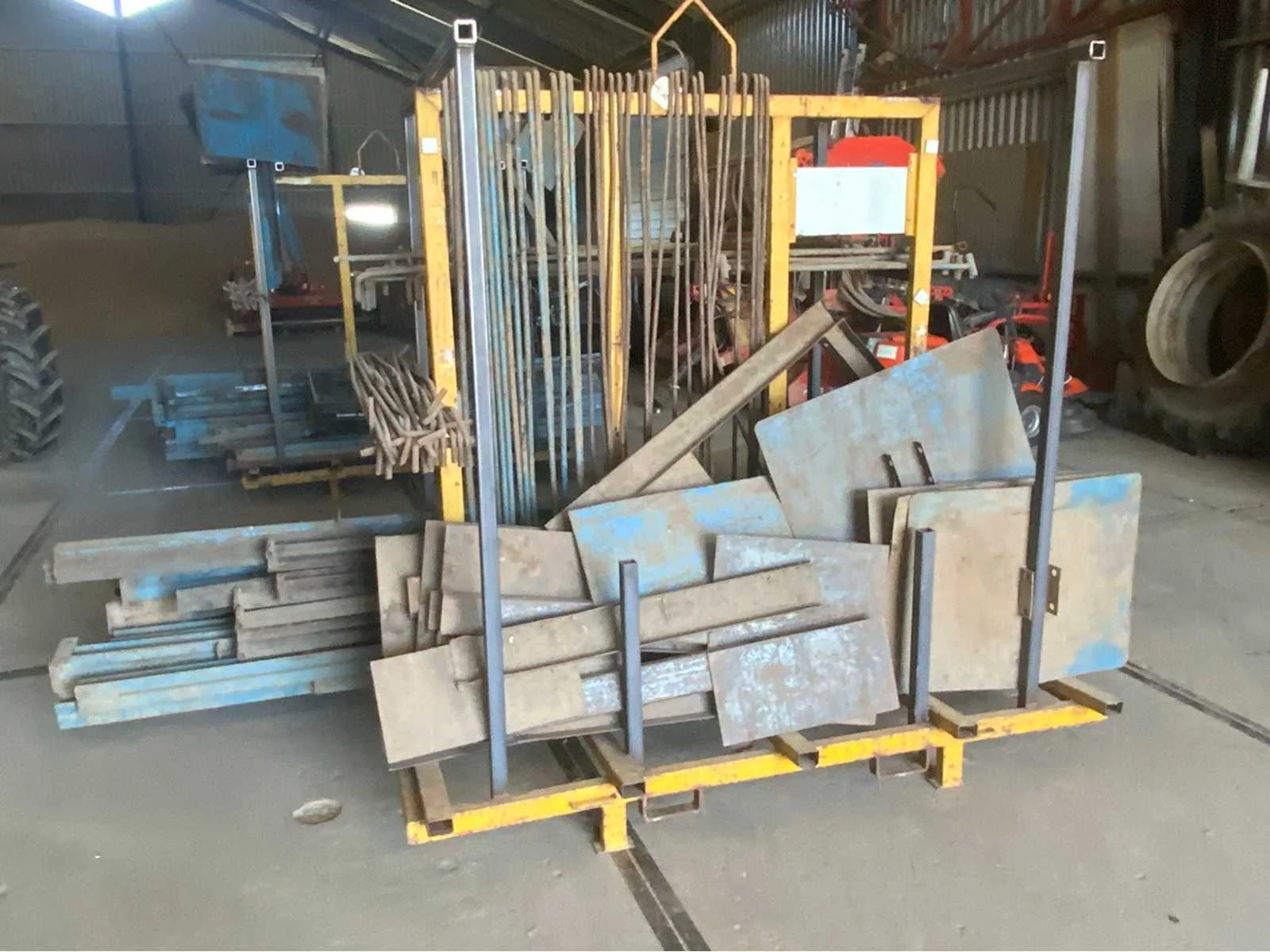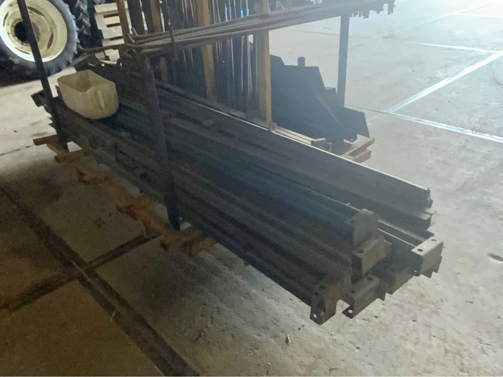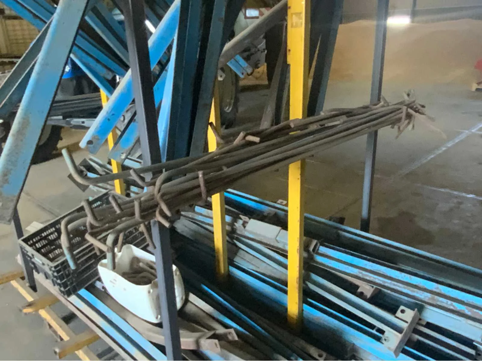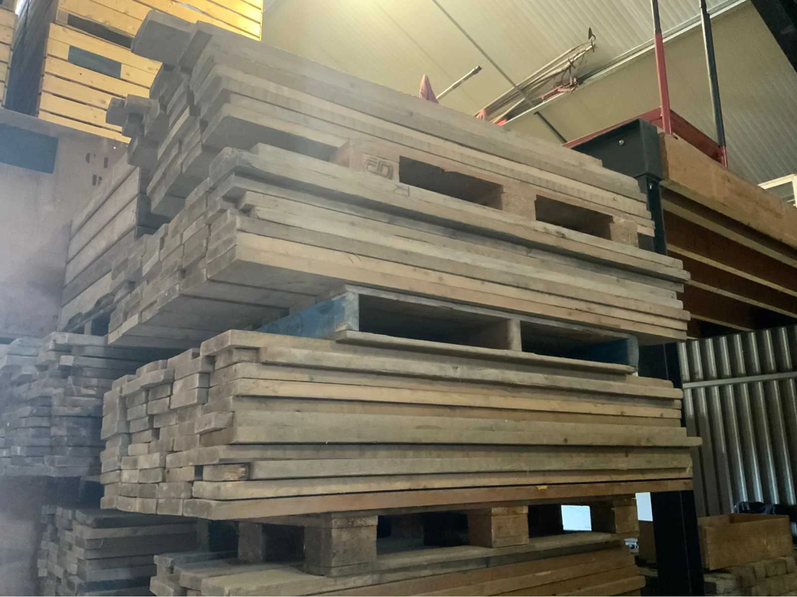 Bestaande uit 2 verbouwd glasbokken met staanders, voetplaten, schoorstangen en keerwanden, 9 pallets met keerwand planken, 2 hoeken, diverse lengte planken tot circa 180cm, planken gesorteerd op lengte met kleur. Nee