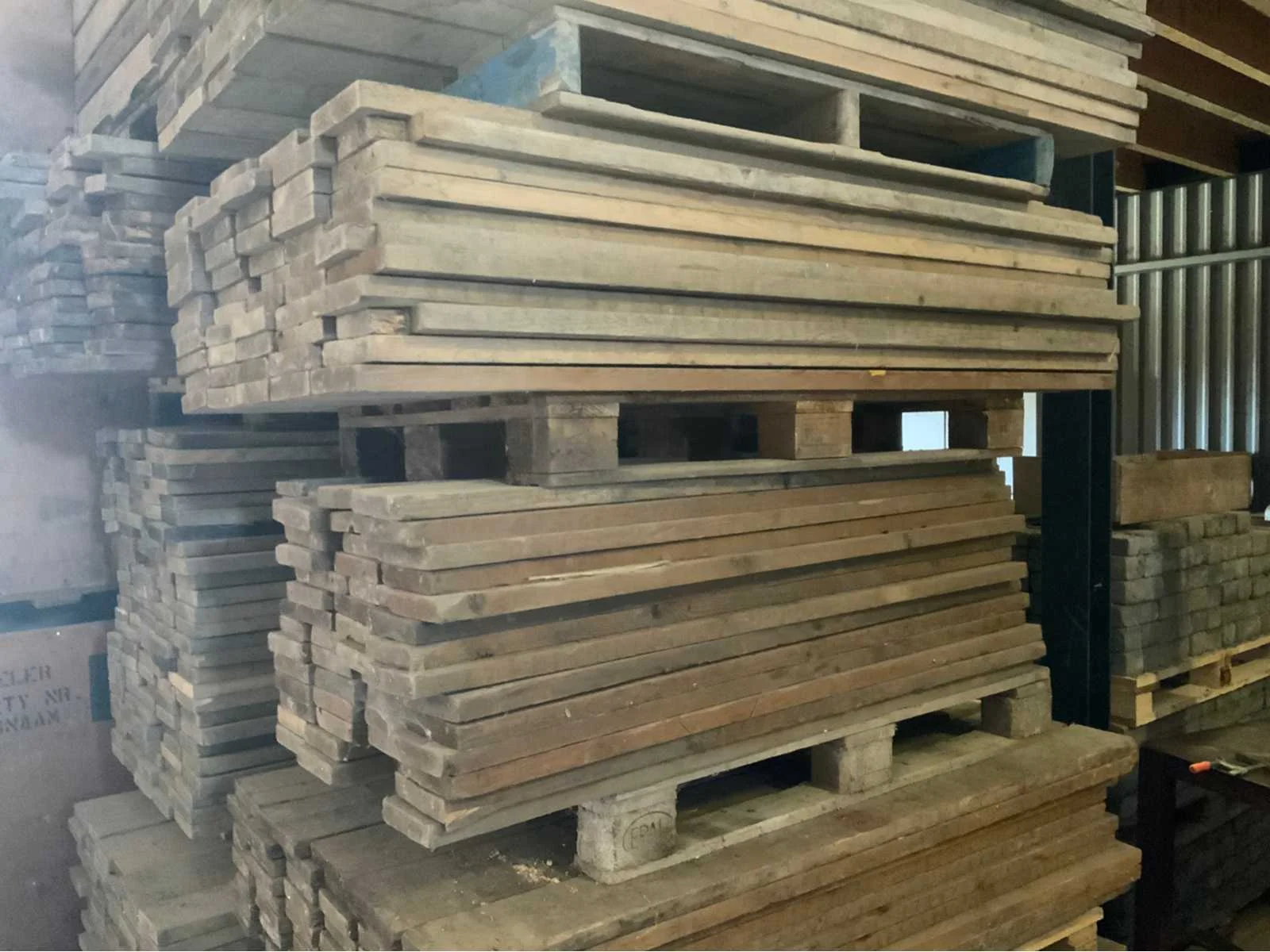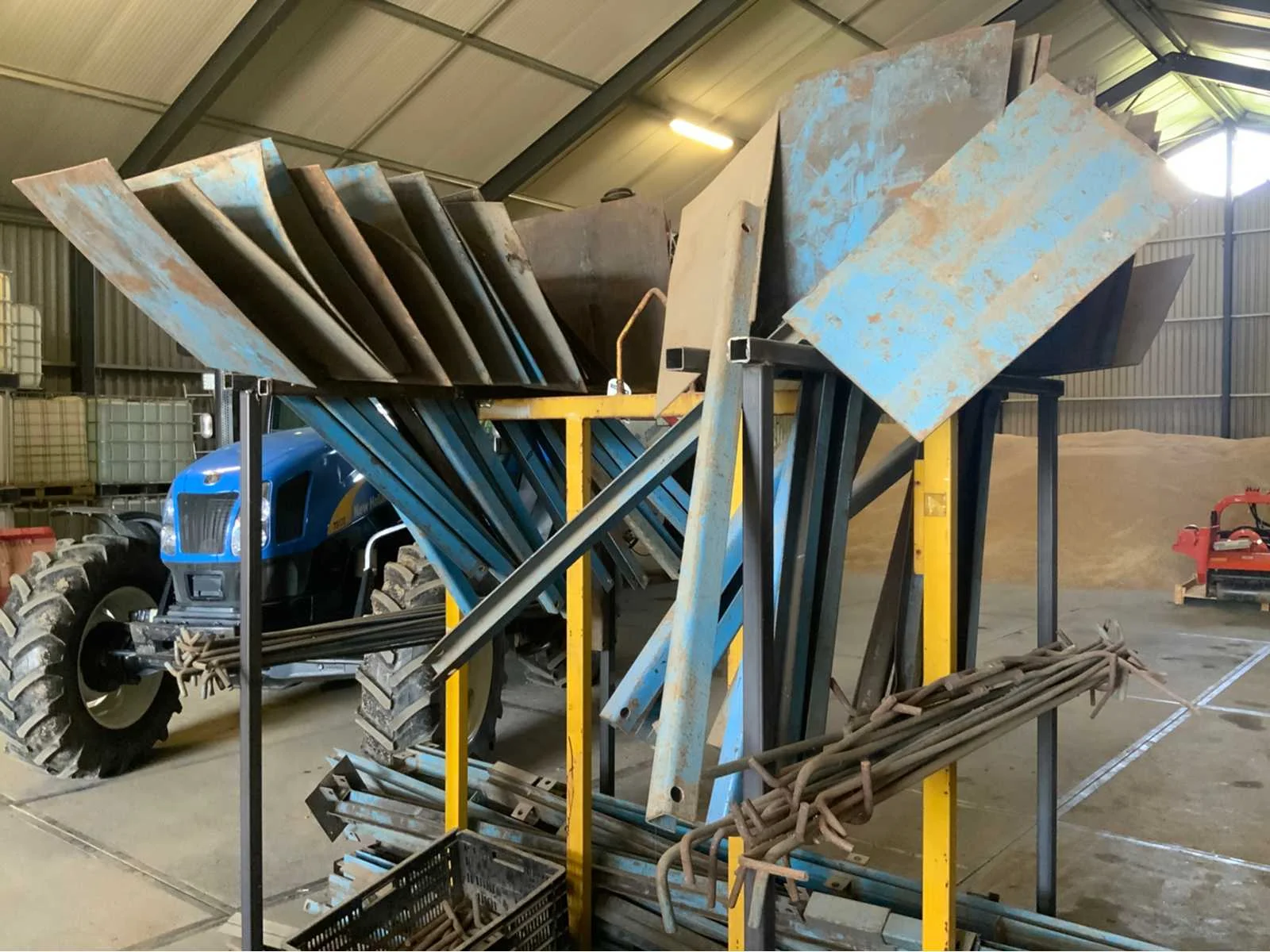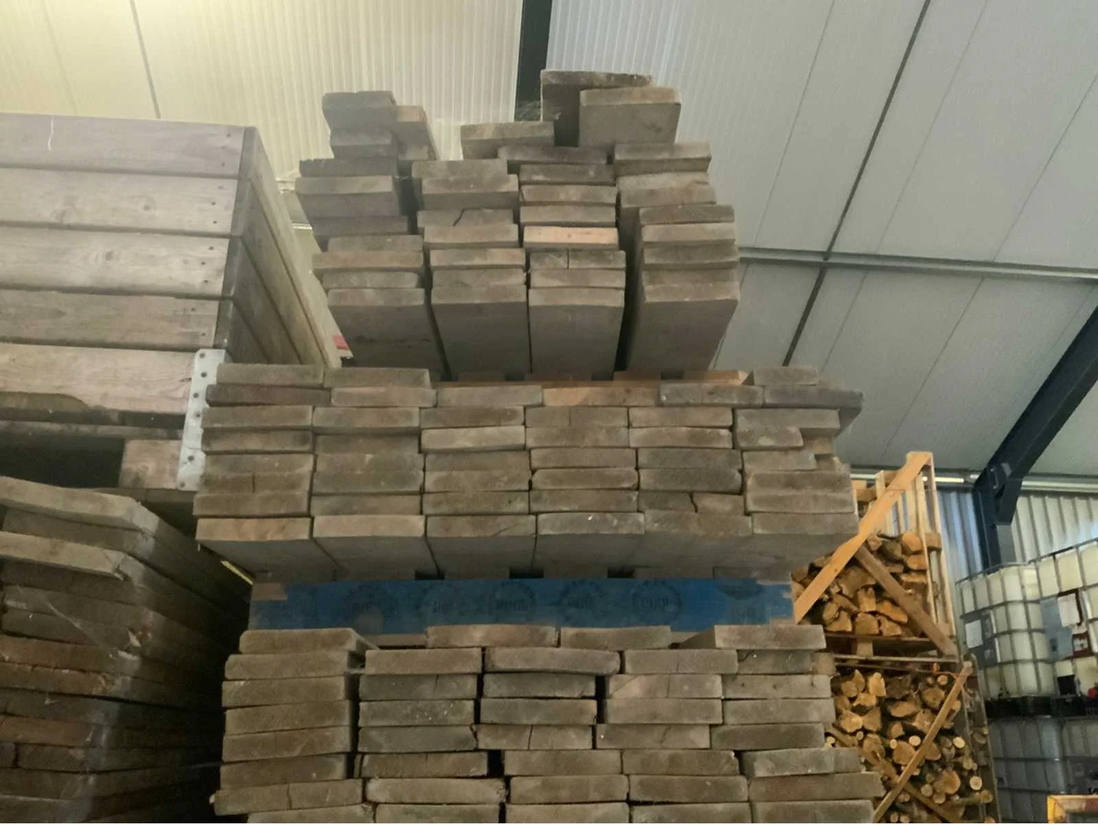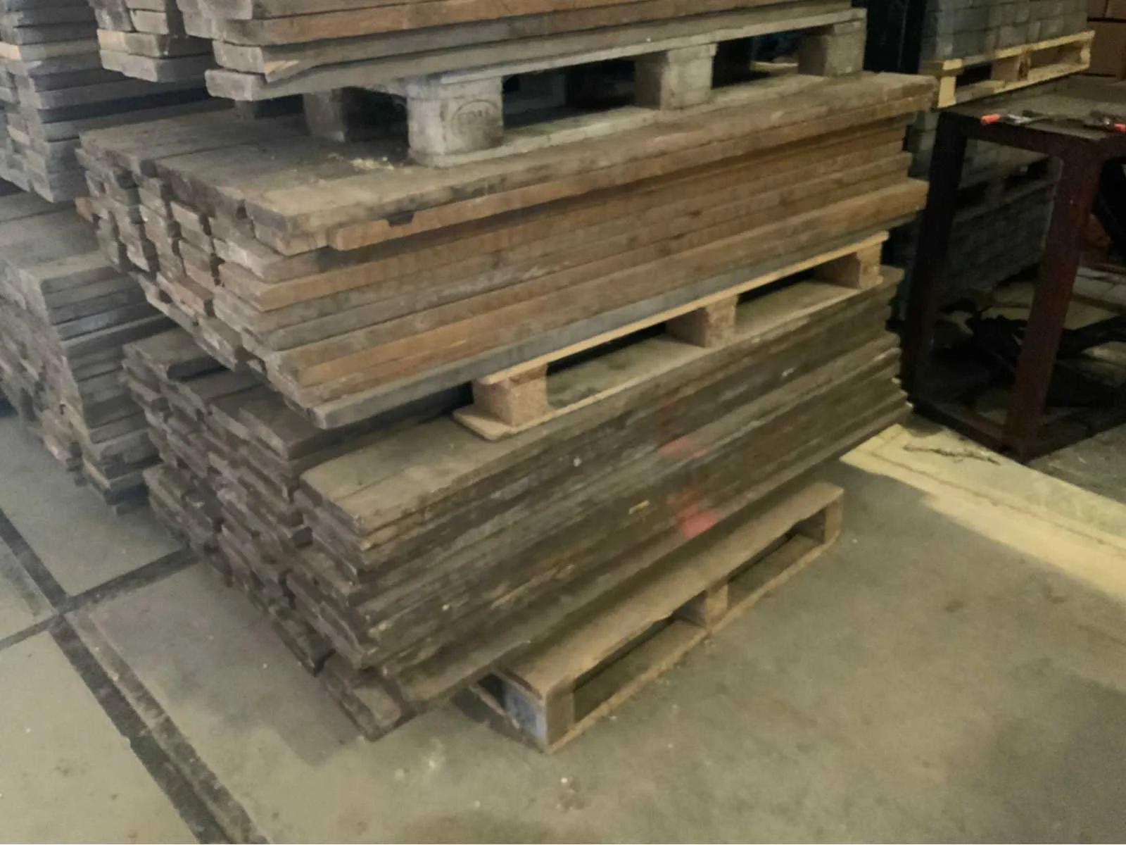 Bestaande uit 2 verbouwd glasbokken met staanders, voetplaten, schoorstangen en keerwanden, 9 pallets met keerwand planken, 2 hoeken, diverse lengte planken tot circa 180cm, planken gesorteerd op lengte met kleur. Nee