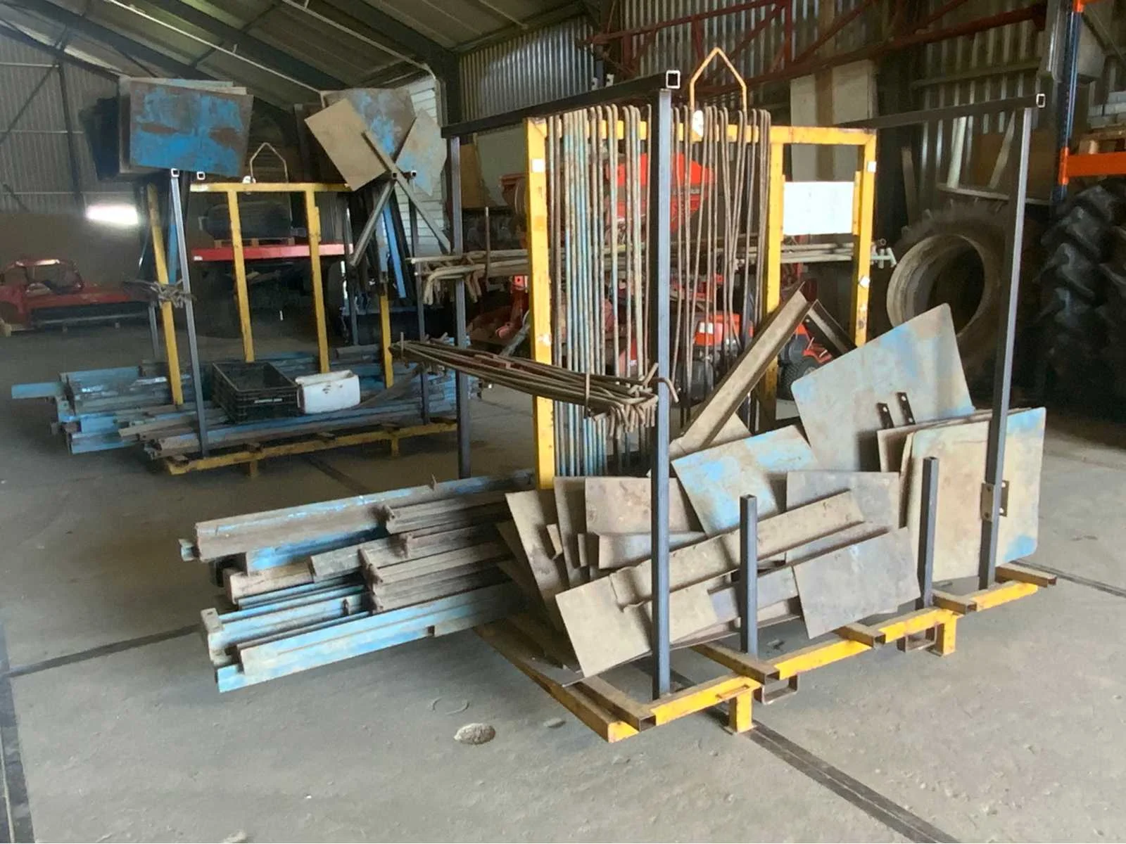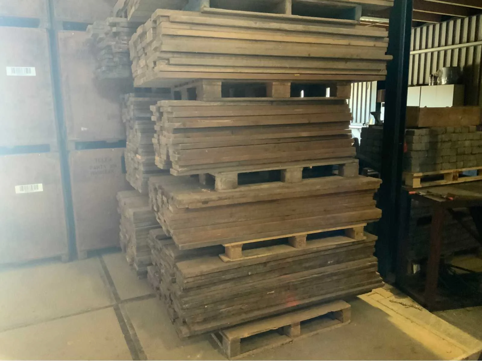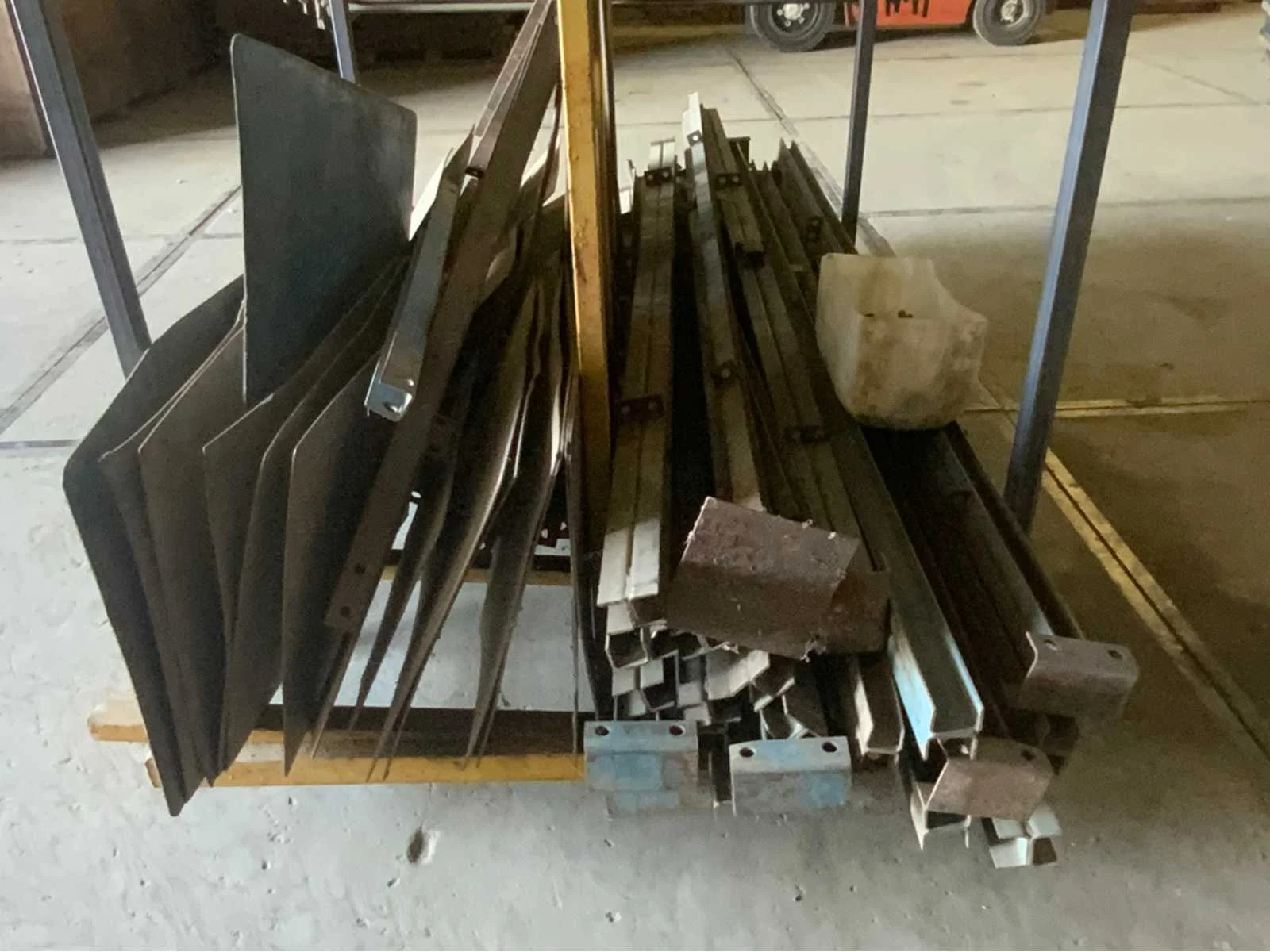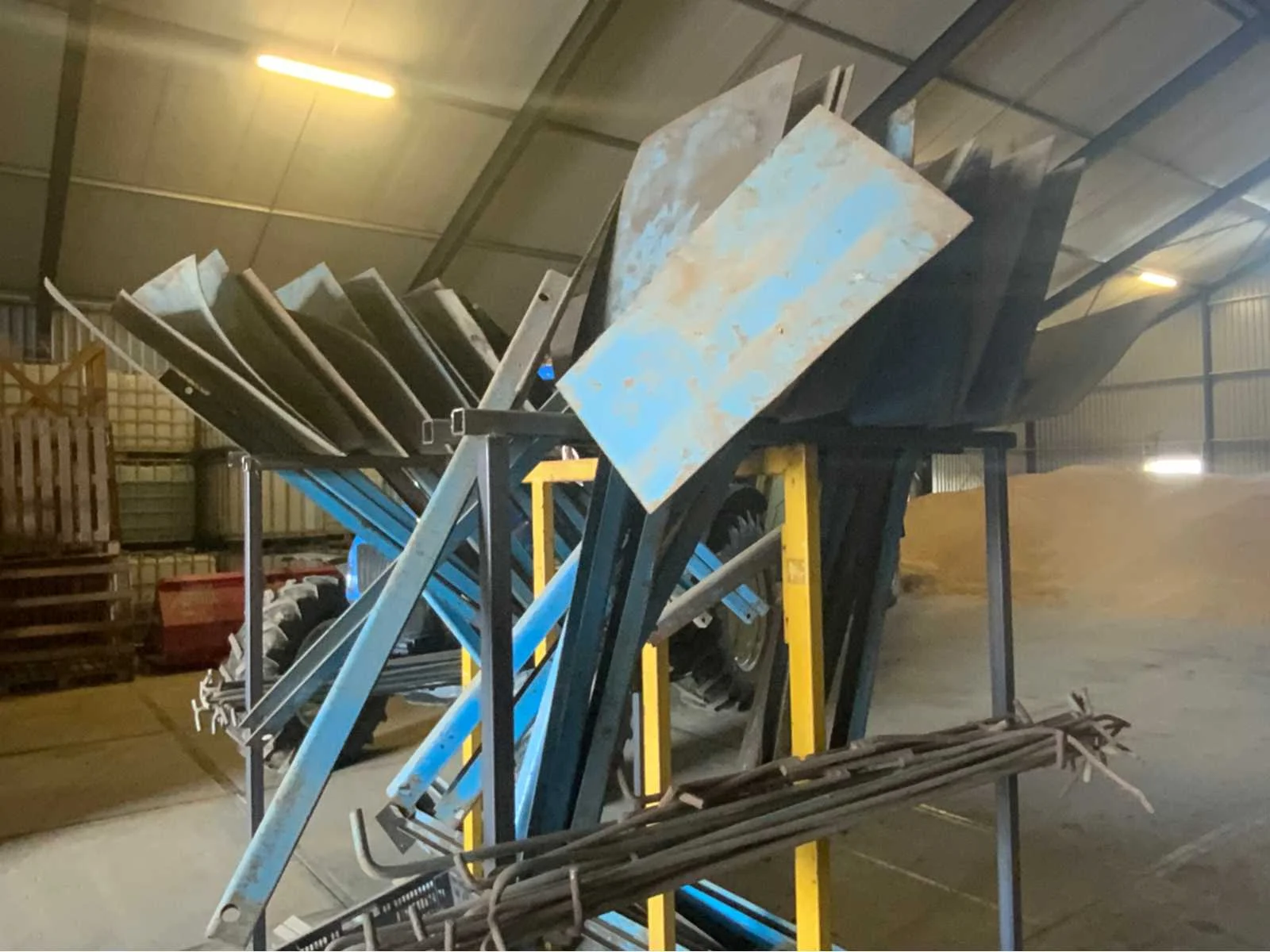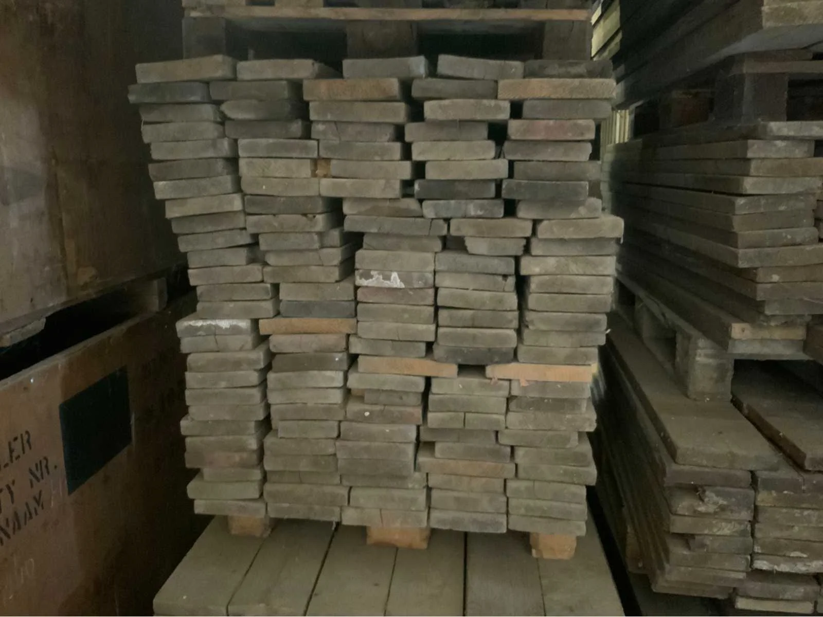 Bestaande uit 2 verbouwd glasbokken met staanders, voetplaten, schoorstangen en keerwanden, 9 pallets met keerwand planken, 2 hoeken, diverse lengte planken tot circa 180cm, planken gesorteerd op lengte met kleur. Nee
