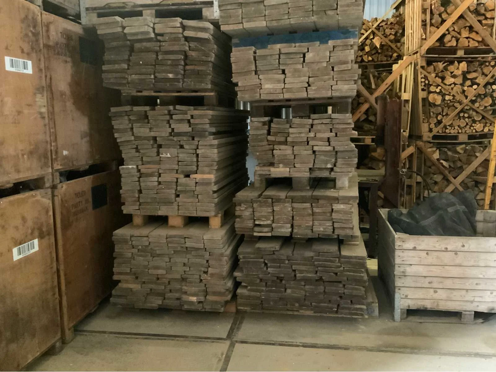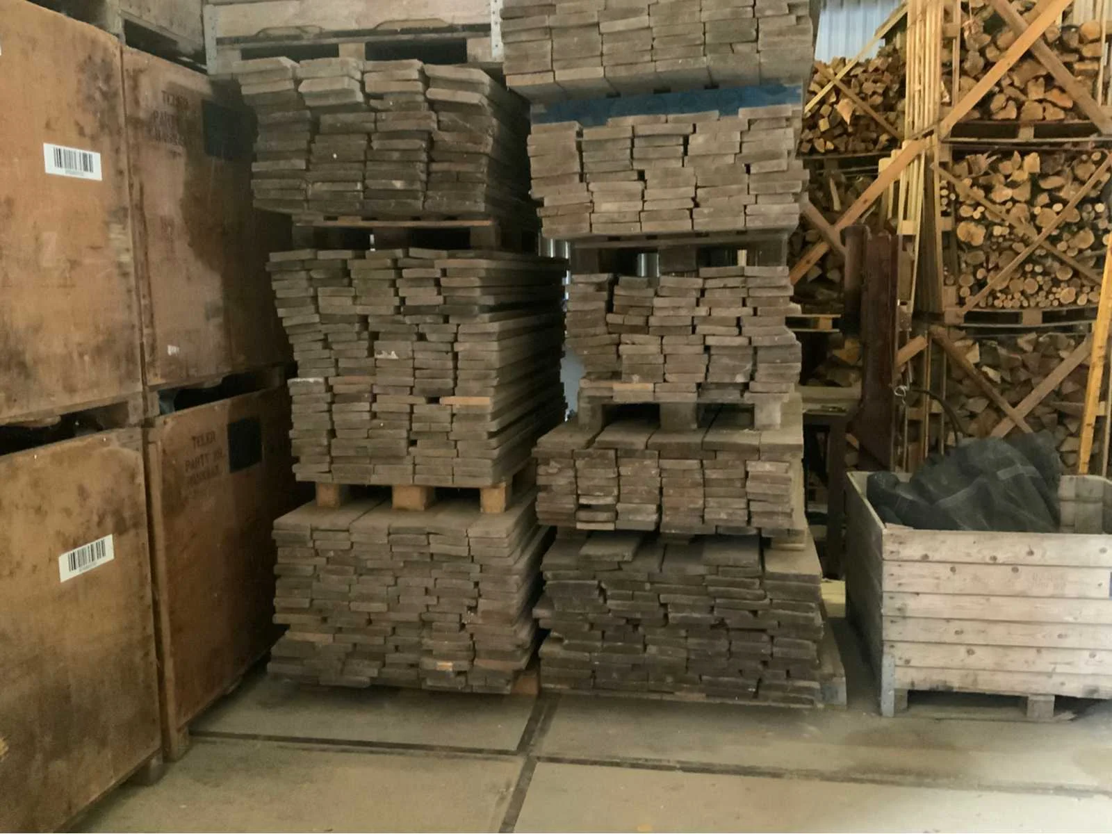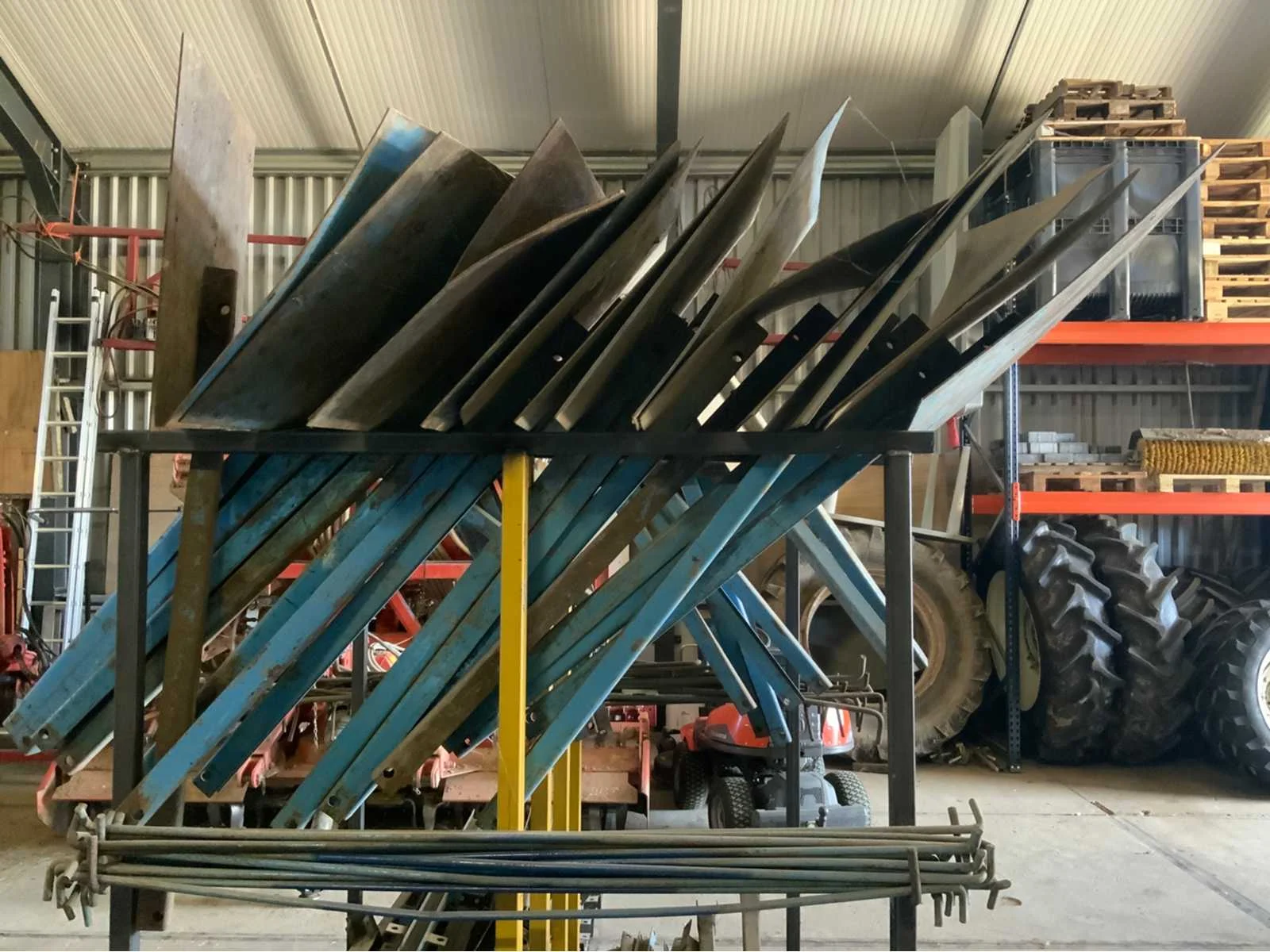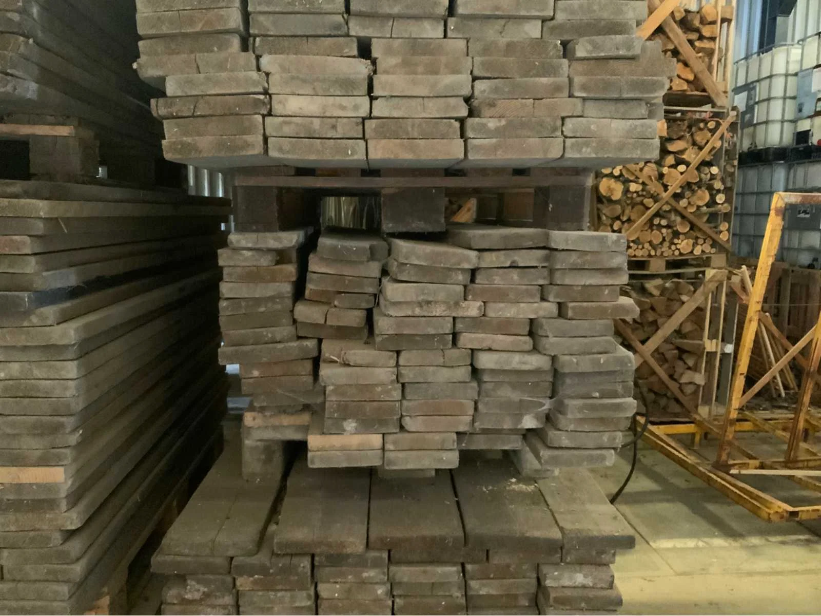 Bestaande uit 2 verbouwd glasbokken met staanders, voetplaten, schoorstangen en keerwanden, 9 pallets met keerwand planken, 2 hoeken, diverse lengte planken tot circa 180cm, planken gesorteerd op lengte met kleur. Nee