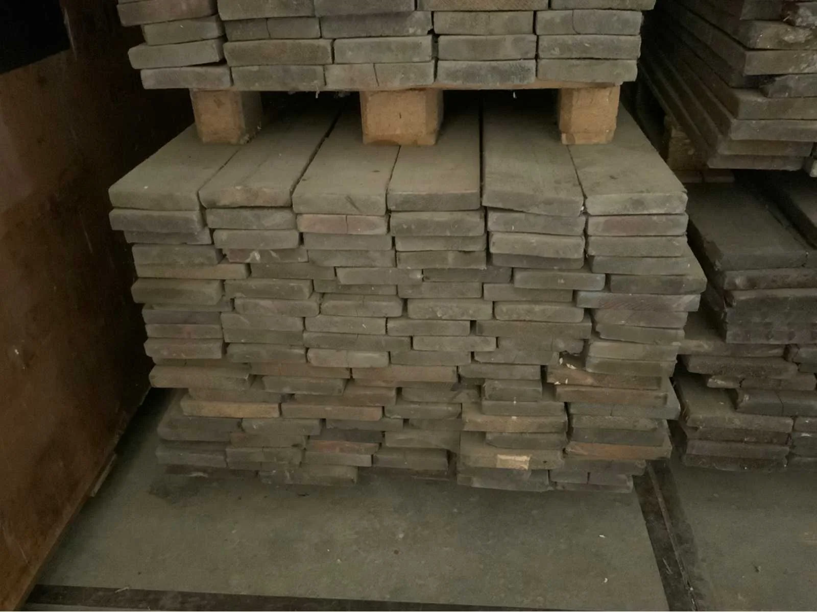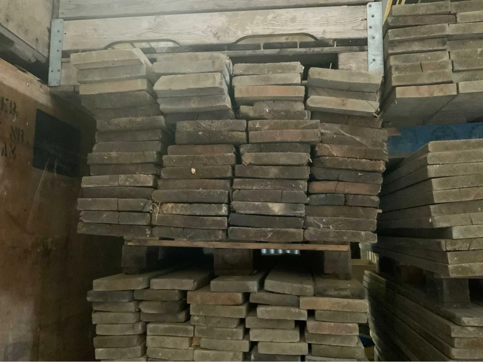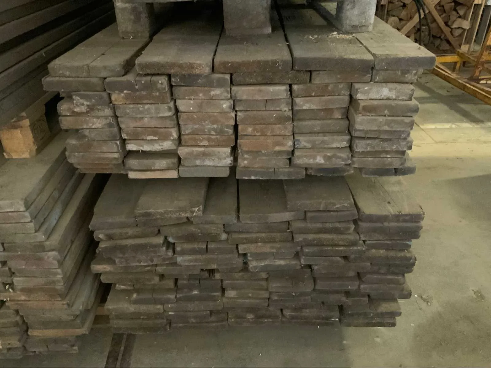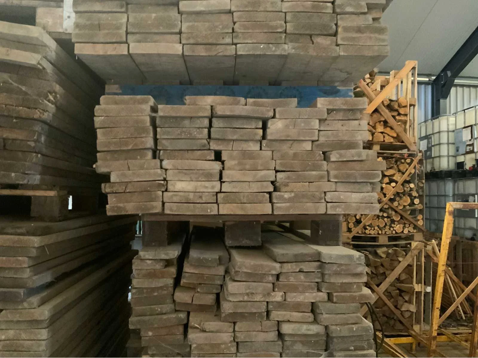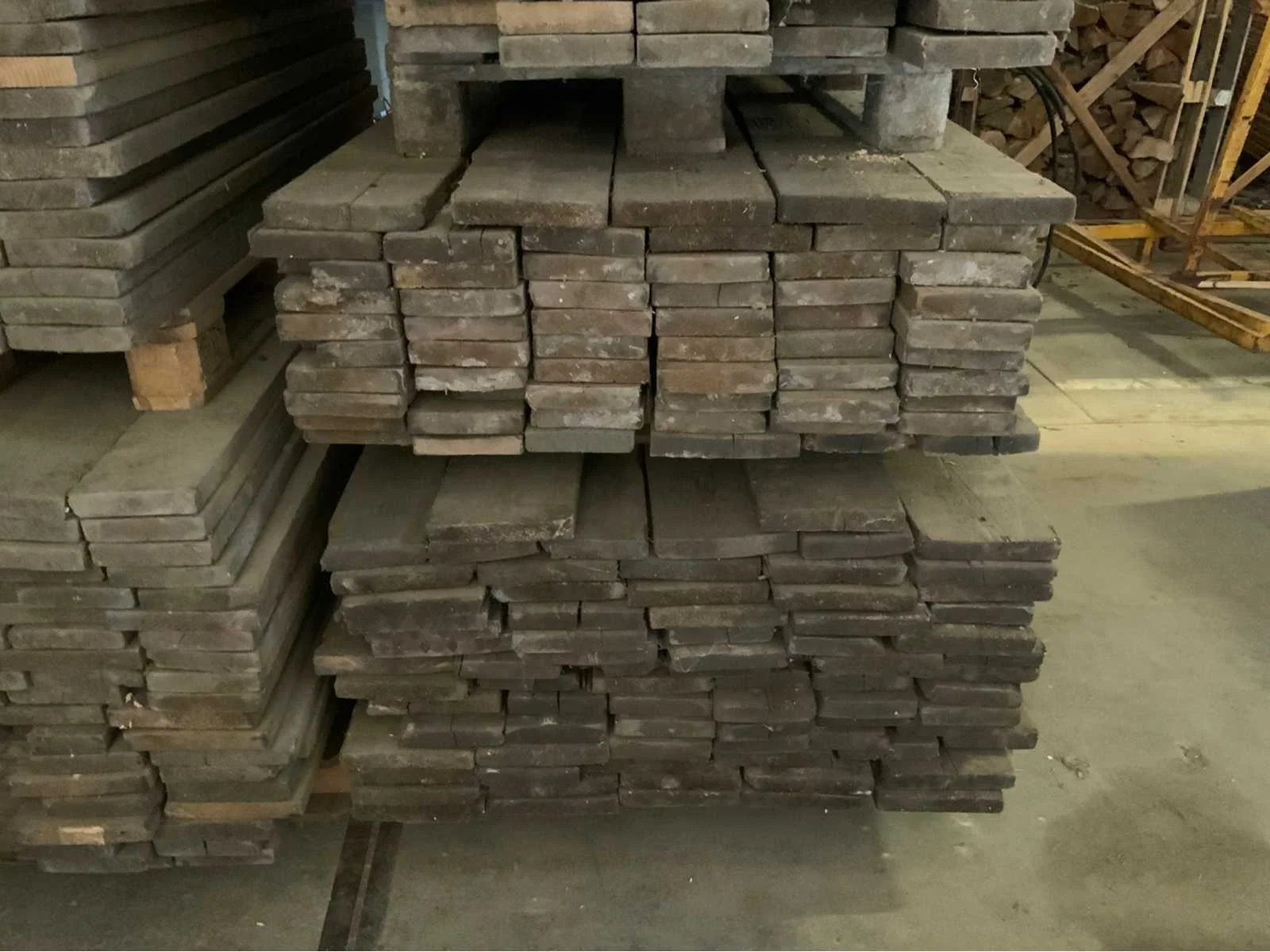 Bestaande uit 2 verbouwd glasbokken met staanders, voetplaten, schoorstangen en keerwanden, 9 pallets met keerwand planken, 2 hoeken, diverse lengte planken tot circa 180cm, planken gesorteerd op lengte met kleur. Nee