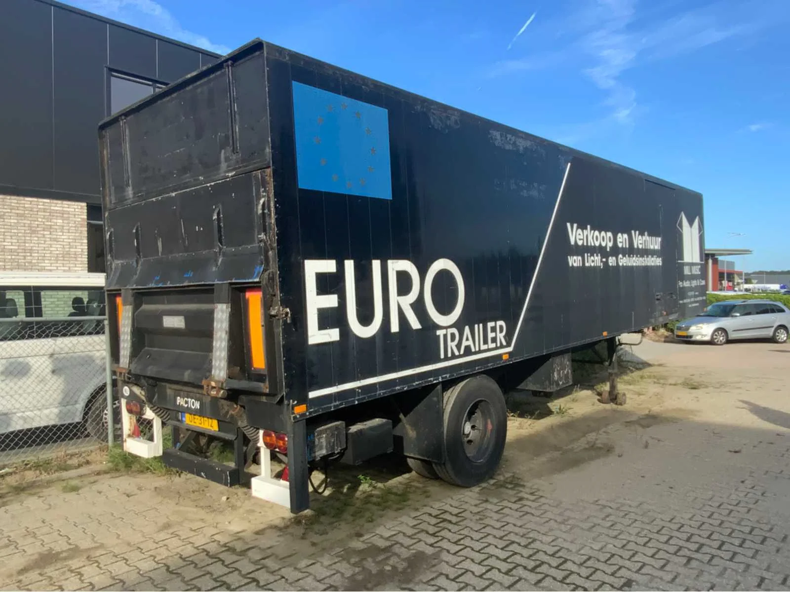 Gesloten citytrailer met laadklep Nee Merk: PACTON Type: 1520 D Type aanhangwagencarrosserie: Gesloten aanhangwagen Bouwjaar: 1982 Kenteken: OE-31-12 Datum eerste toelating (NL): 9-11-1982 Datum eerste toelating: 9-11-1982 APK vervaldatum: 28-07-2025 Aantal assen: 1 Laadvermogen: 11000kg Hydraulische laadklep: true