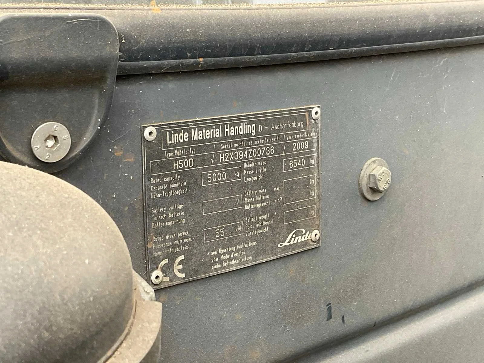 Extra functie is intern al ingbouwd (tot aan leidingwerk aanwezig), Nee Merk: Linde Type: H50D Bouwjaar: 2009 Aantal wielen: 4 Afgelezen urenstand: 6417 Free-lift: true Duplex mast: true Eigen gewicht: 6540kg Hefvermogen: 5000kg Lepellengte: 1400mm Hefhoogte: 7000mm Vol rubber banden: true Totale afmeting L: 4500mm Totale afmeting Breedte: 1450mm Totale afmeting Hoogte: 2250mm Diesel: true