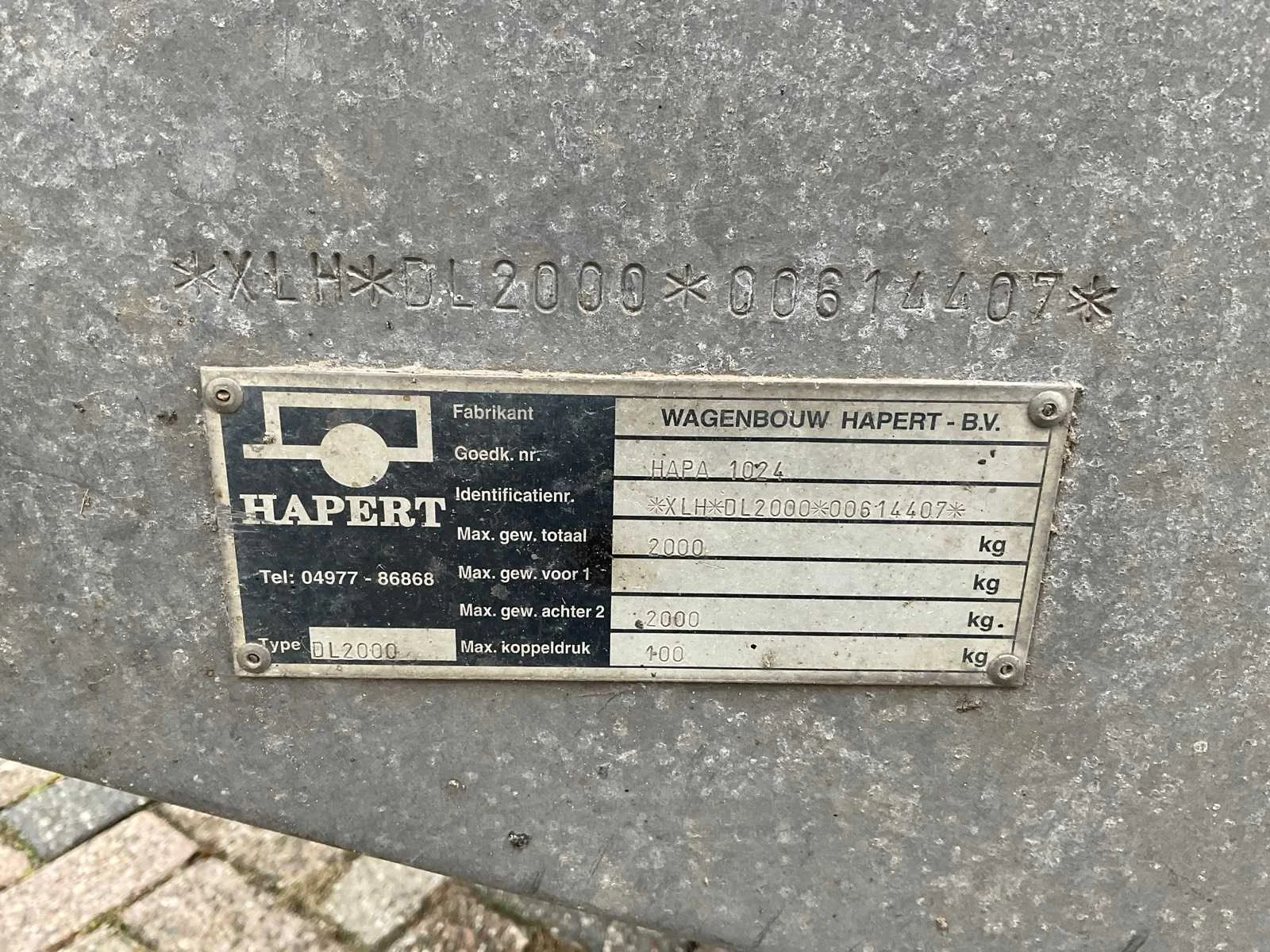Voorzien van: oplooprem, verlichting, aluminium borden, Nederlandse kentekenregistratie, Nee Merk: Hapert Type: DL2000 Bouwjaar: 1995 Chassisnummer: XLHDL200000614407 Laadbak afmeting l: 330cm Laadbak afmeting b: 198cm Ledig gewicht: 489kg Laadvermogen: 1511kg Datum eerste toelating: 1995-03-28 Datum eerste toelating (NL): 1995-03-28 Kenteken: WN-98-GZ Lengte: 440cm