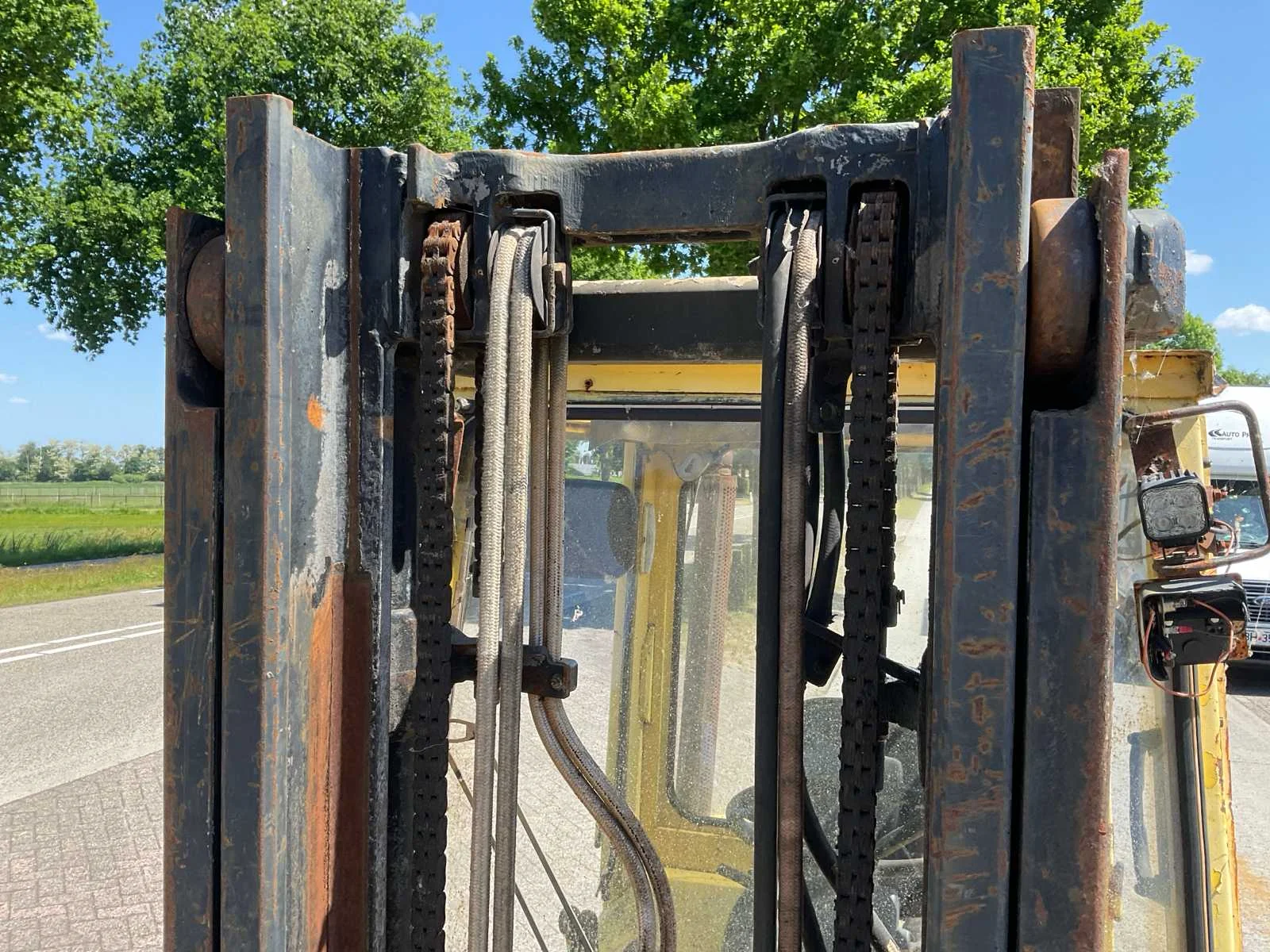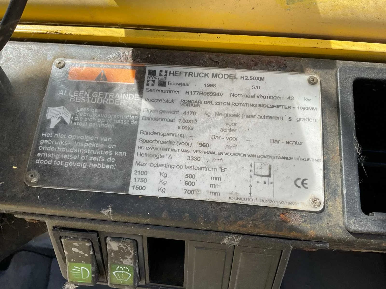 Start met starthulp, rijdt en remt goed, No Merk: Hyster Type: H2.50XM Bouwjaar: 1998 Serienummer: H177B05994V Brandstof: diesel Mast: Duplex Afgelezen urenstand: 11921 Eigen gewicht: 4170kg Hefvermogen: 2500kg Lepellengte: 1100mm Hefhoogte: 3330mm Totale afmeting L: 3700mm Totale afmeting Breedte: 1150mm Totale afmeting Hoogte: 2120mm