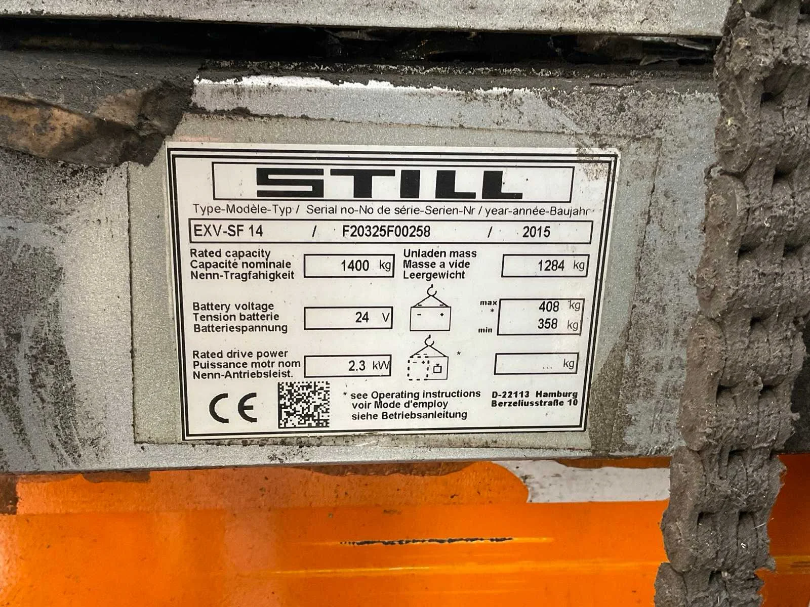 375Ah/24V, elektrische storing! Nee Merk: Still Type: EXV-SF 14 Bouwjaar: 2015 Hefvermogen: 1400kg Hefhoogte: 5402mm Lepellengte: 1140mm Eigen gewicht: 1284kg Totale afmeting L: 2000mm Totale afmeting Breedte: 780mm Totale afmeting Hoogte: 2070mm