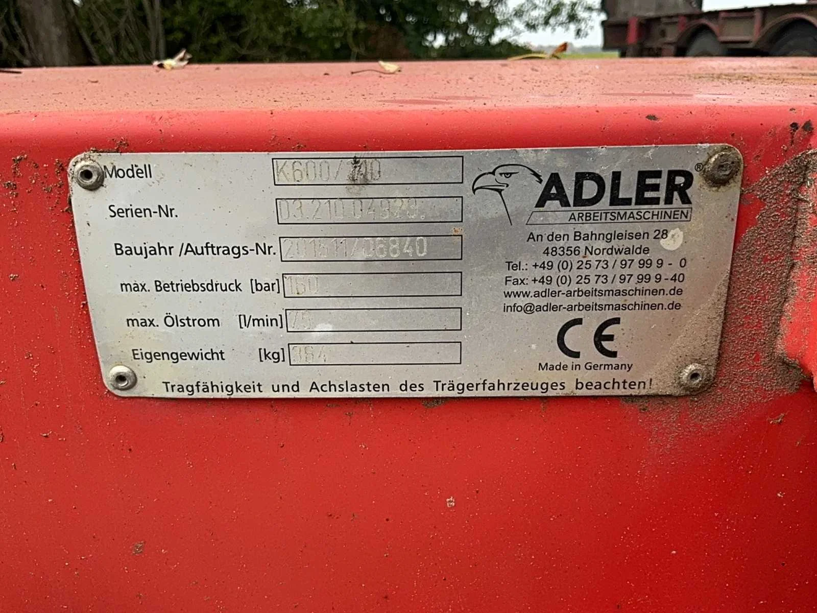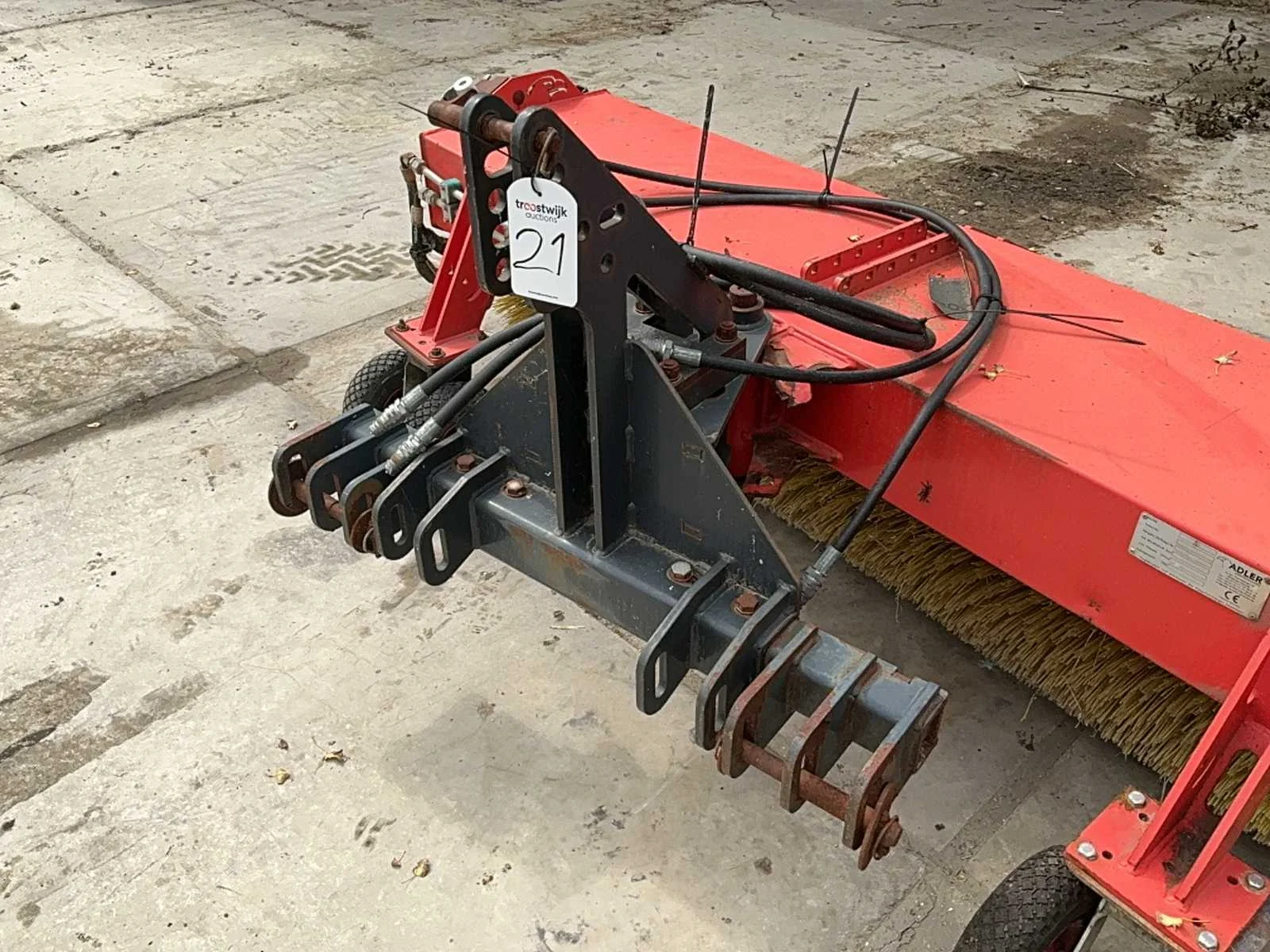 Driepunts inrichting, hydraulisch zwenkbaar, hydraulisch aangedreven, voorzien van steunpoten. Ø bezem: 400mm Nee Merk: Adler Bouwjaar: 2015 Serienummer: 0321004923 Eigen gewicht: 364kg Werkbreedte: 2070mm Totale afmeting L: 1400mm Totale afmeting Breedte: 2240mm Totale afmeting Hoogte: 1030mm