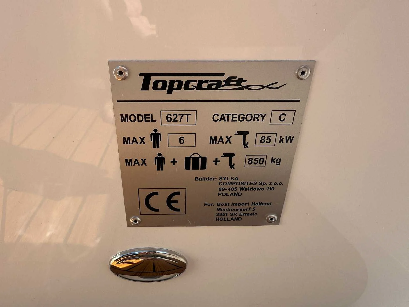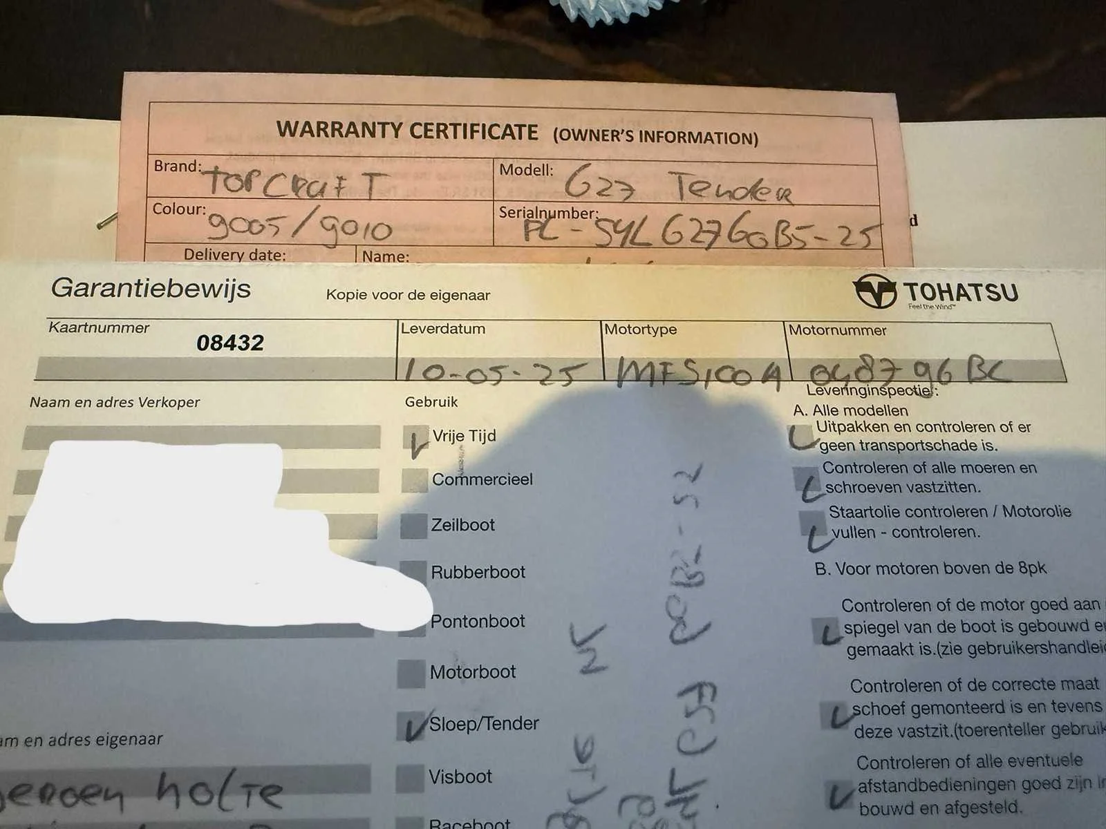 Tender en motor te water 10-5-2025 en ca. 10 vaaruren van proefvaren. Trailer bj. 2023 tegen meerprijs te koop, zit dus niet bij de prijs in. De boot is voorzien van bleu-tooth radio inbouw, Simrad navigatie , dieptemeter, temperatuur meter, snelheidsmeter etc. Koelkast ingebouwd op condensator. Luxe ruit bekleding. Ligbed om te bouwen naar tafel. 2x accu met wissel schakelaars tussen motor en accesoires. Inbouw gashendel. Trim op de motor. Cabriokap met uitritsbare voorruit. HPL vloer. Navigatie verlichting. Zoeklampen led ingebouwd in romp. Blauwe kuip verlichting. Rug leuning voor zitten om te leggen naar ligbed achterop. Lux stuur. Toplamp achter rvs. Vlag achter rvs. Motor en boot nog in de garantie. Bezichtiging op afspraak! Nee Merk: Topcraft Type: 627 Tender Rompmateriaal: Polyester Bouwjaar: 2025 Serienummer: PL-SYL62760B5-25 Registratie nummer: 6-YH-212 Type motor: Tohatsu MFS100A Aantal cilinders: 4 Vermogen: 74kW Inhoud brandstoftank: 50l Navigatieverlichting: true Navigatie apparatuur: true Eigen gewicht: 850kg