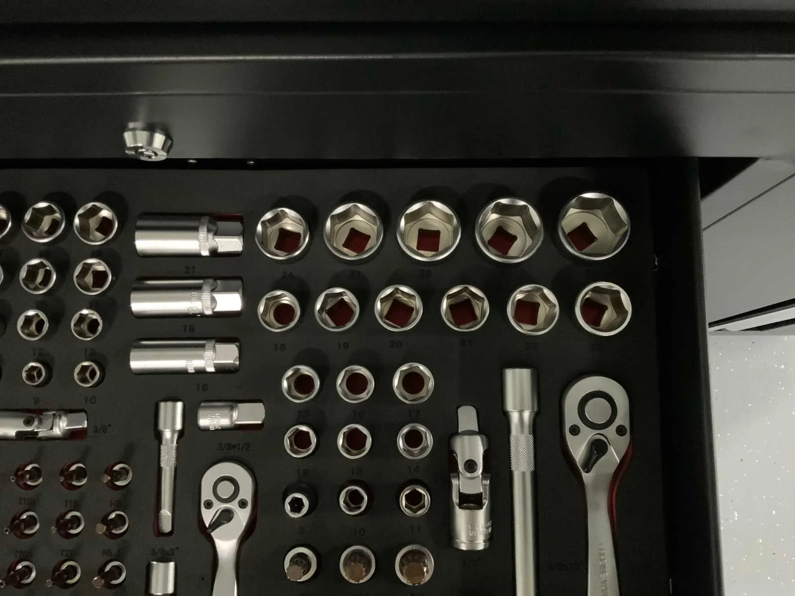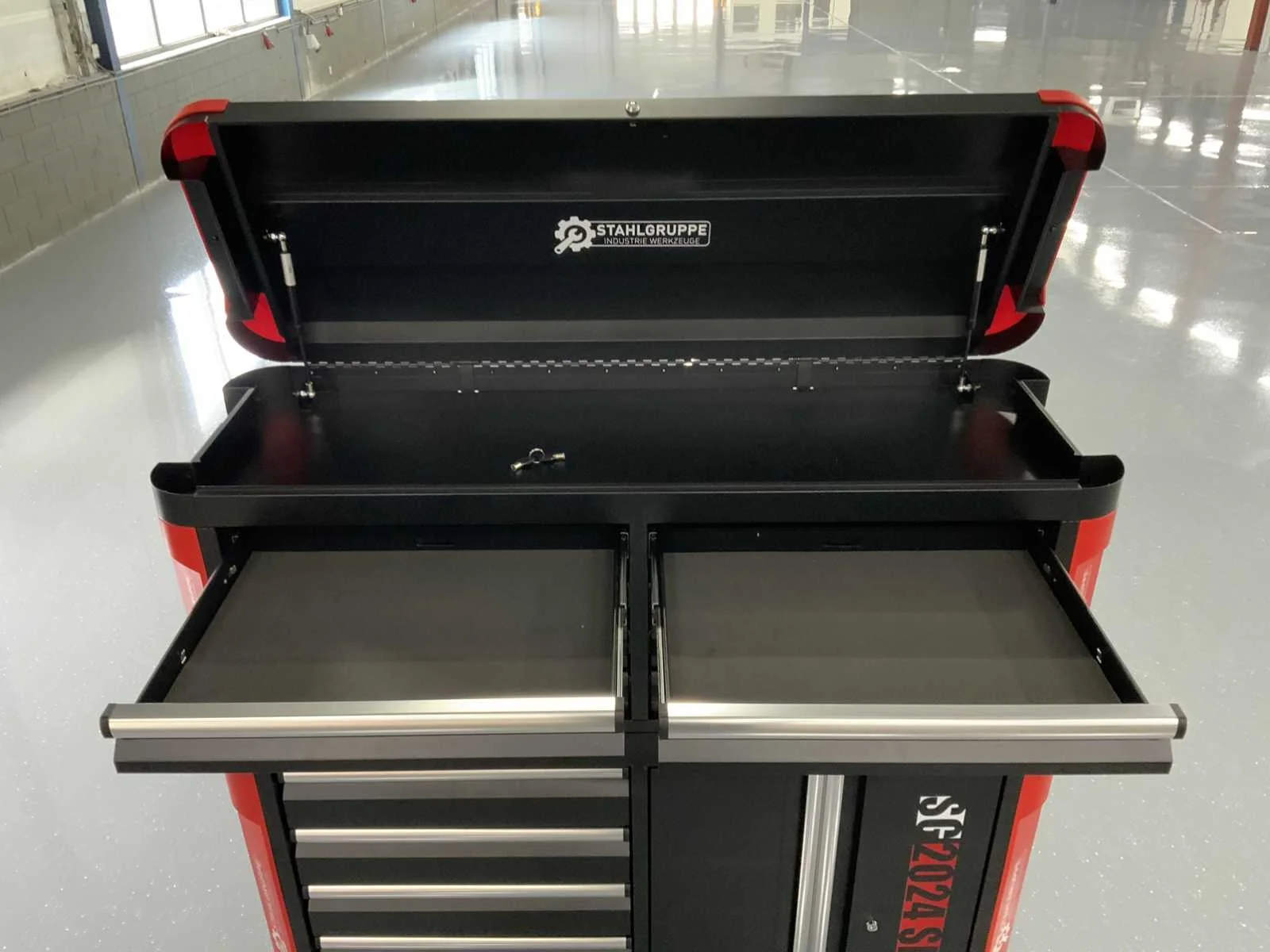 Stahlgruppe XL PRO Deluxe, 13 Laden - 9 Gevuld 327 pcs Gereedschap Kar met afneembare topbox Top box met 8 laden en boven klep Kar met 5 laden en kast met dubbele openslaande deuren Hoeken schuin afgewerkt met bumpers Stevig kunststof handvaten 2 zwenkwielen waarvan 2 geremd Hoge kwaliteit cilinder sloten Mat zwart afgewerkt met rode accenten Nee Merk: Stahlgruppe Type: XL PRO Deluxe Bouwjaar: 2025 Aantal laden: 13 Met inhoud: true