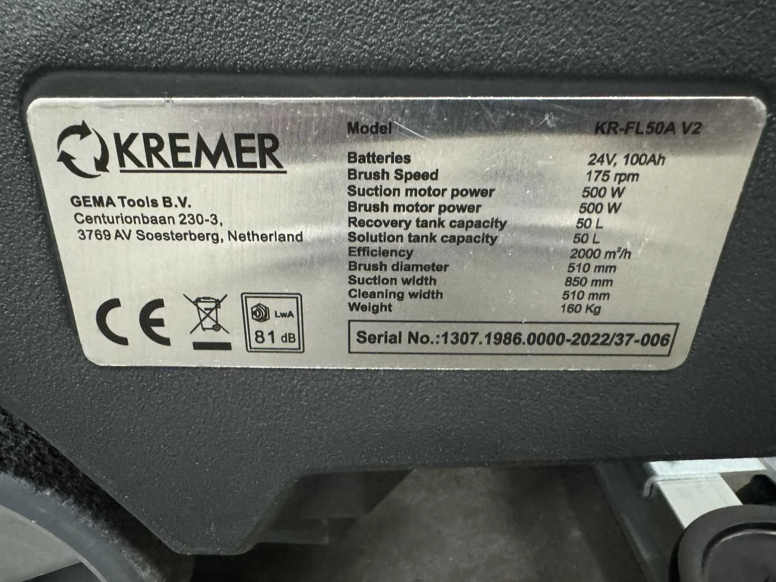Werkbreedte: 50 mm; elektrisch: ja; afgelezen urenstand: 0 hr; accu lader: ja; eigen gewicht: 160 kg; totale afmeting L: 1300 mm; totale afmeting B: 500 mm; totale afmeting H: 1100 mm; omschrijving: ongebruikt , scrobmachine geen veeg machine Nee Merk: Kremer Schrobzuigmachine Type: KR-FL50A Bouwjaar: 2025 Eigen gewicht: 160kg Totale afmeting L: 1300mm Totale afmeting Breedte: 500mm Totale afmeting Hoogte: 1100mm