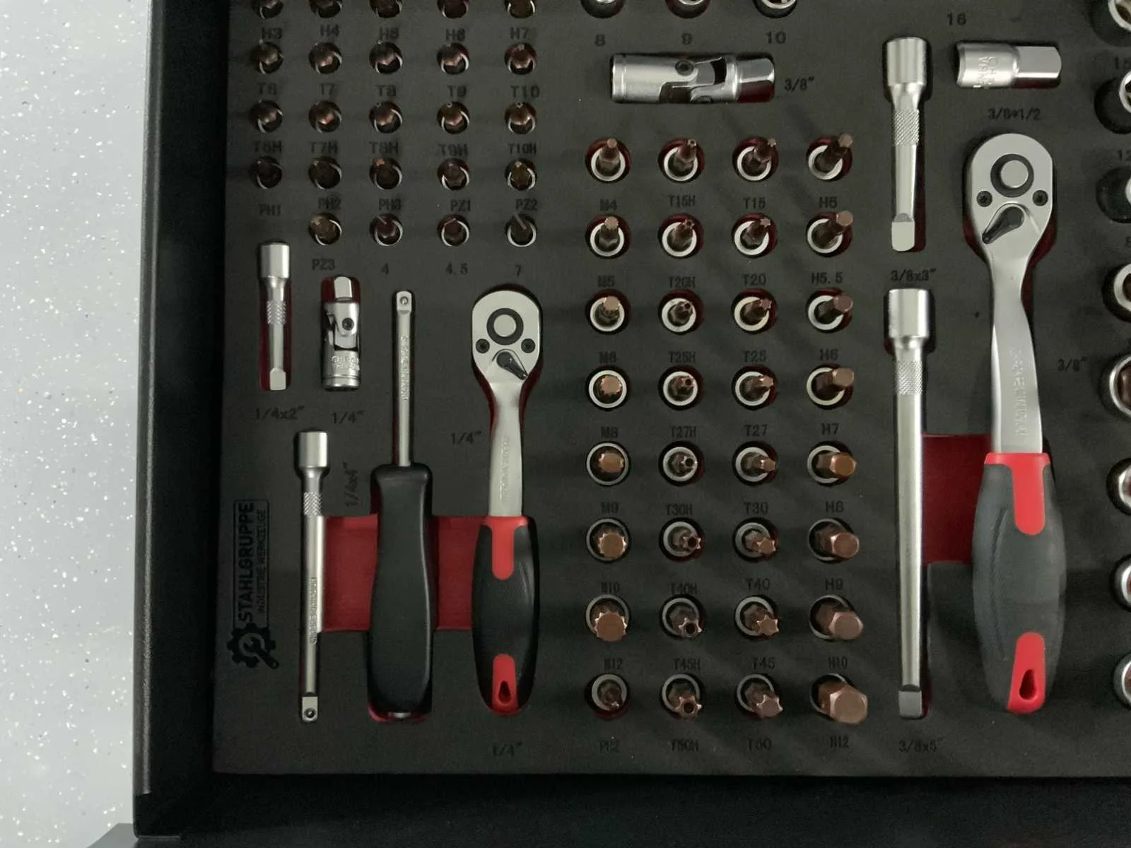 13 Laden, 9 gevuld, 327 pcs gereedschap. Kar met afneembare topbox Top box met 8 laden en boven klep Kar met 5 laden en kast met dubbele openslaande deuren Hoeken schuin afgewerkt met bumpers Stevig kunststof handvaten 2 zwenkwielen waarvan 2 geremd Hoge kwaliteit cilinder sloten Mat zwart afgewerkt met rode accenten Nee Merk: Stahlgruppe Type: XL PRO Deluxe Bouwjaar: 2025 Aantal laden: 13 Met inhoud: true