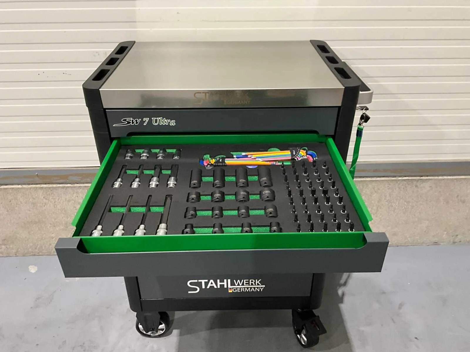 Ongebruikt , 3 stopcontacten , 2 usb poorten 13 stuks 1/4” doppen: 4-4,5-5-5,5-6-7-8-9-10-11-12-13-14mm 10 stuks 3/8” doppen: 13-14-15-16-17-18-19-20-21-22mm 14 stuks 1/2” doppen: 12-13-14-15-17-18-19-21-22-23-24-27-30-32mm 12 st. 1/2” dopsleutel: 12-13-14-15-16-17-18-19-21-22-24mm 3 stuks 1/4“ 3/8” 1/2” duwstang 3 stuks 1/4“ 3/8” 1/2” kruiskoppeling 2 st. 1/4“ maat 2” & 4” verlengstang 2 st. 3/8“ maat 3”&6” verlengstang 2 st. 1/2“ maat 5”&10” verlengstang 3 stuks 1/4“ 3/8” 1/2” ratelhandgreep 72T 1 st. 1/4“ snijhendel 1/2” Dr. koppeling 10 st. Bits PH3-4, PZ3-4, SL8, T40-45-50, H7-8; 12 st. 1/2” inbusbits maat: H14-17-19, M16, M9, MP9, M16, T80, M14, T40-45-50. 45 stuks 1/4” dopsleutels: SL4-SL5,5-... (en zo verder volgens uw lijst) 12 stuks 1/2” Pneumatische doppen: 10-11-12... (enzovoort) 9 stuks Lange inbussleutels: 1,5-2-2,5-... (enzovoort) 14 stuks schroevendraaiers: SL8*175-SL8*150-... (enzovoort) 7 stuks schroevendraaiers: SL6*38-SL5*100-... (enzovoort) 9 stuks. Flachringschlüssel:8-9-10-11-... (enzovoort) 21 stuks Kombischlüssel:6-7-8-9-10-11-... (enzovoort) 1 st. 8” verstelbare moersleutel 9 stuks schroevendraaiers: H2*100-5*150-... (enzovoort) 8 stuks T-Stecknuss:6-7-8-9-10-11-12-13mm 1 st. 8” combinatietang 1 stuk 8” naaldneuzen 1 x 8” zijkniptang 1 x 10” waterpomptang 1 x 10” vergrendeltang 1 stuk 7” binnenringtang recht 1 stuk 7” binnenringtang gebogen 1 x 7” buitenringtang recht 1 st. 7” buitenringtang gebogen 1 st. Meetlint 5 Nee Merk: Stahlwerk Type: SW 7 Bouwjaar: 2025 Aantal laden: 7 Met inhoud: true