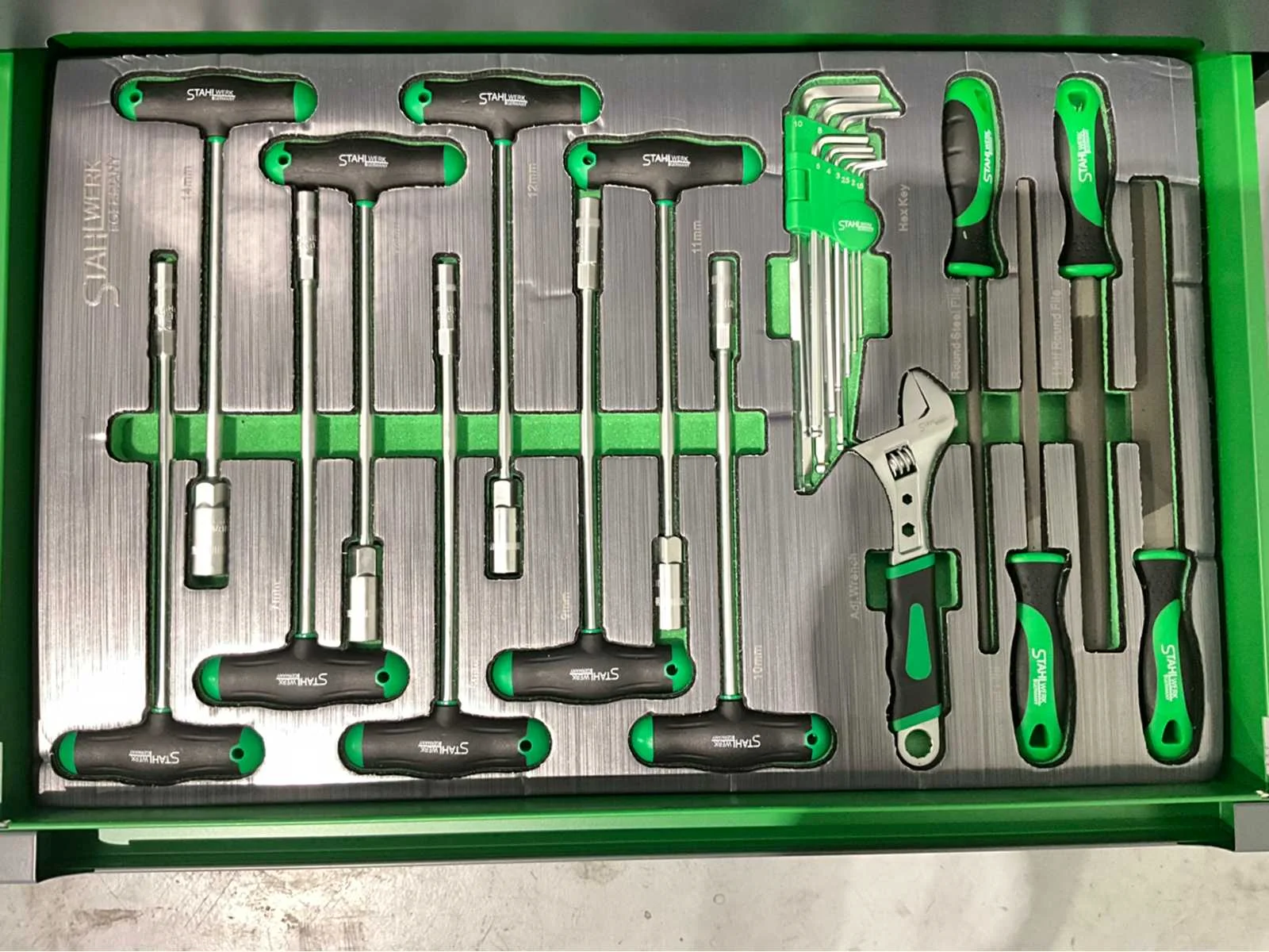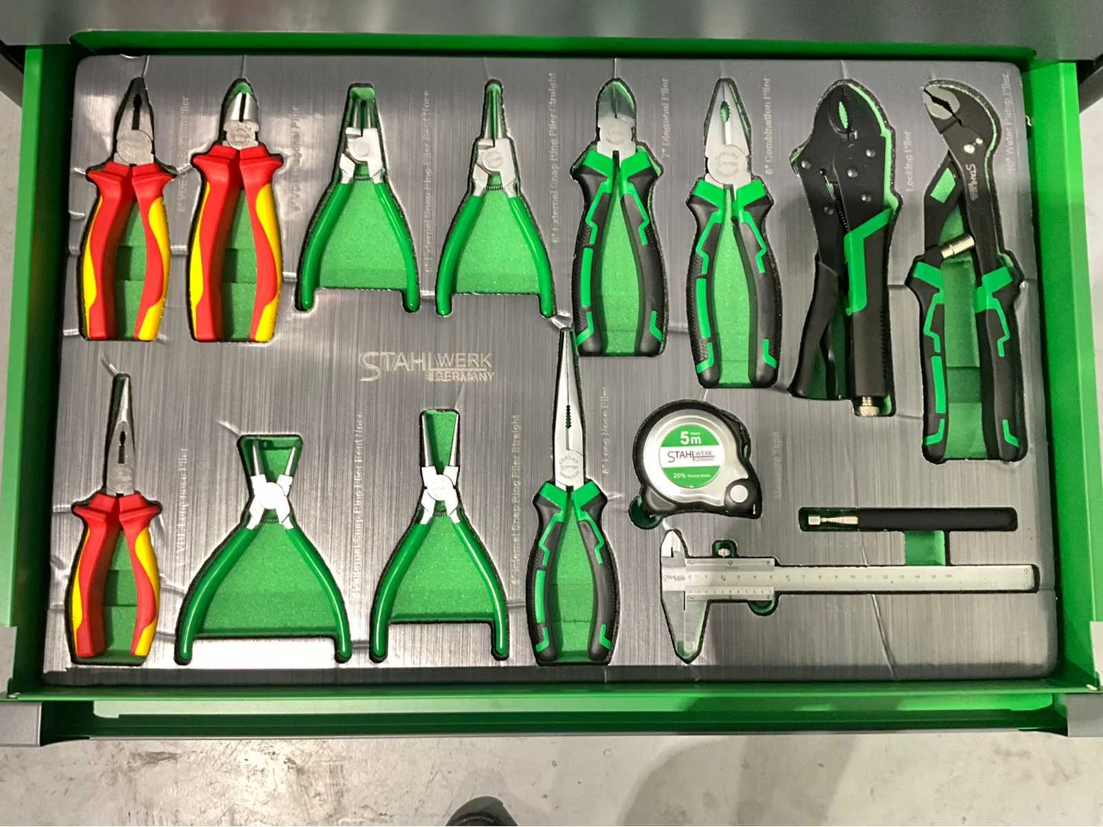 Ongebruikt 13 stuks 1/4" steeksleutelmaat: 4-4,5-5-5,5-6-7-8-9-10-11-12-13-14 mm 10 stuks 3/8" steeksleutelmaat: 13-14-15-16-17-18-19-20-21-22 mm 14 stuks 1/2" dopsleutelmaat: 12-13-14-15-17-18-19-21-22-23-24-27-30-32 mm 12 stuks 1/2" diepe steeksleutelmaat: 12-13-14-15-16-17-18-19-20-21-22-24 mm 3 stuks 1/4“ 3/8” 1/2" schuifstang 3 stuks 1/4“ 3/8” 1/2" universele koppeling 2 stuks 1/4“ maat 2” & 4" verlengstang 2 stuks 3/8“ maat 3”&6" verlengstang 2 stuks 1/2“ maat 5”&10" verlengstang 3 stuks 1/4“ 3/8” 1/2" ratelgreep 72T 1 stuk 1/4" snijgreep 1/2” Dr. koppeling 10 stuks bits PH3-4, PZ3-4, SL8, T40-45-50, H7-8; 12 stuks 1/2” steeksleutelbits: H14-17-19, M16, M9, MP9, M16, T80, M14, T40-45-50. 45 stuks 1/4”Dr. steeksleutelbits: SL4-SL5.5-... (enzovoort volgens uw lijst) 12 stuks 1/2” pneumatische dopsleutels: 10-11-12... (enzovoort) 9 stuks lange inbussleutels: 1,5-2-2,5-... (enzovoort) 14 stuks schroevendraaiers: SL8*175-SL8*150-... (enzovoort) 7 stuks schroevendraaiers: SL6*38-SL5*100-... (enzovoort) 9 stuks platte ringsleutels: 8-9-10-11-... (enzovoort) 21 stuks combinatiesleutels: 6-7-8-9-10-11-... (enzovoort) 1 stuk 8” verstelbare sleutel 9 stuks schroevendraaiers: H2*100-5*150-... (enzovoort) 8 stuks T-dopsleutels: 6-7-8-9-10-11-12-13 mm 1 stuk 8" combinatietang 1 stuk 8" punttang 1 stuk 8" zijkniptang 1 stuk 10" waterpomptang 1 stuk 10" versteltang 1 stuk 7" rechte binnenringtang 1 stuk 7" gebogen binnenringtang 1 stuk 7" rechte buitenringtang 1 stuk 7" buitenring Nee Merk: Stahlwerk Type: SW 9 Bouwjaar: 2025 Aantal laden: 9 Met inhoud: true