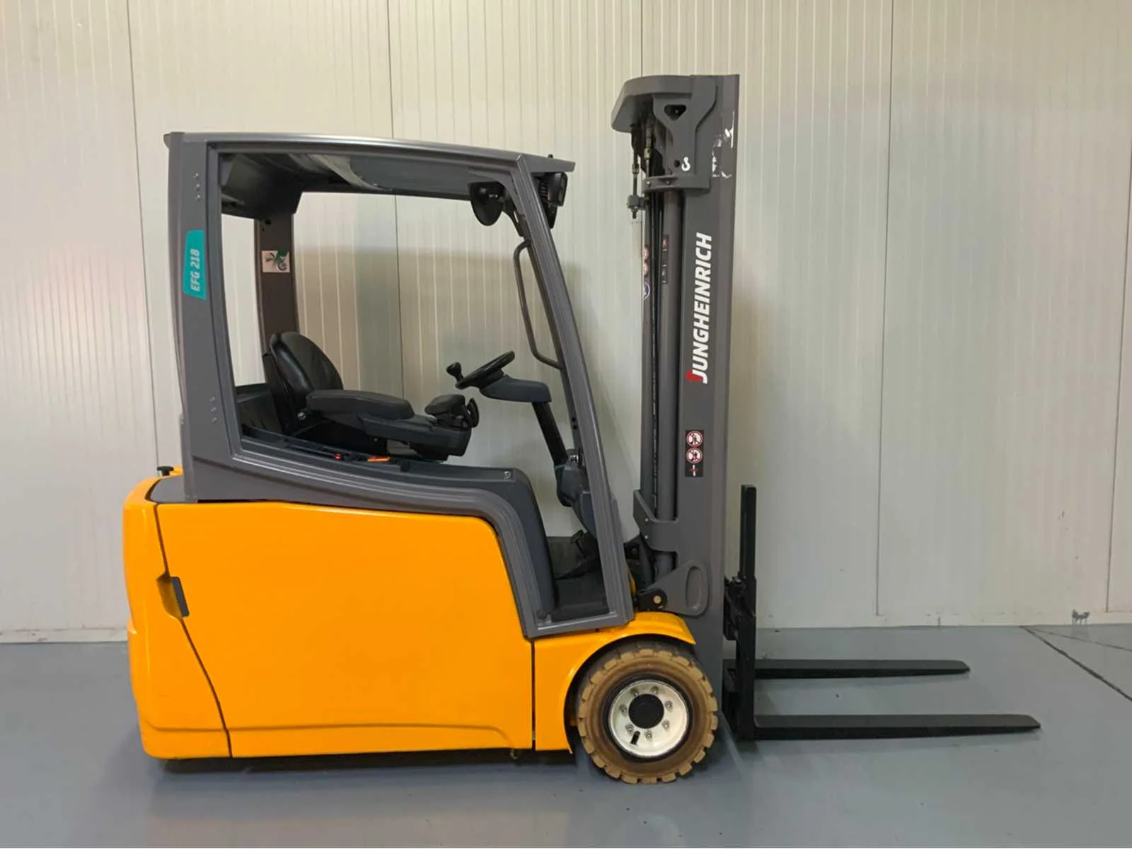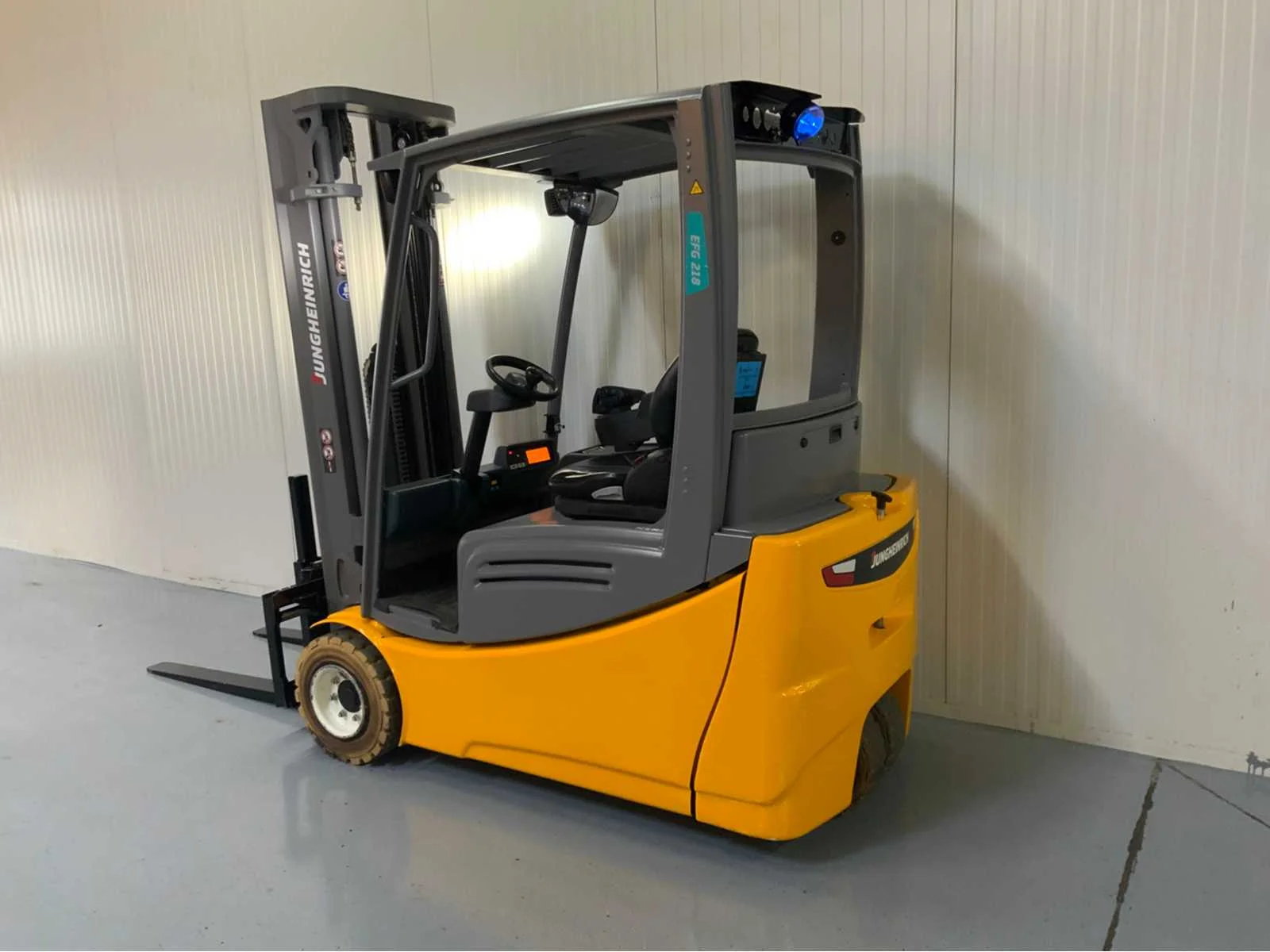 Extra opties: Led verlichting voorkant, Bluespot achterkant, Accu van 2018 Nee Merk: Jungheinrich Type: EFG218 Bouwjaar: 2016 Brandstof: Elektrisch Mast: Triple Soort band: Volrubber banden Aantal wielen: 3 Free-lift: true Side-shift: true Triple mast: true Eigen gewicht: 3611kg Hefvermogen: 1800kg Lepellengte: 1150mm Hefhoogte: 4800mm Totale afmeting L: 3100mm Totale afmeting Breedte: 1100mm Totale afmeting Hoogte: 2200mm