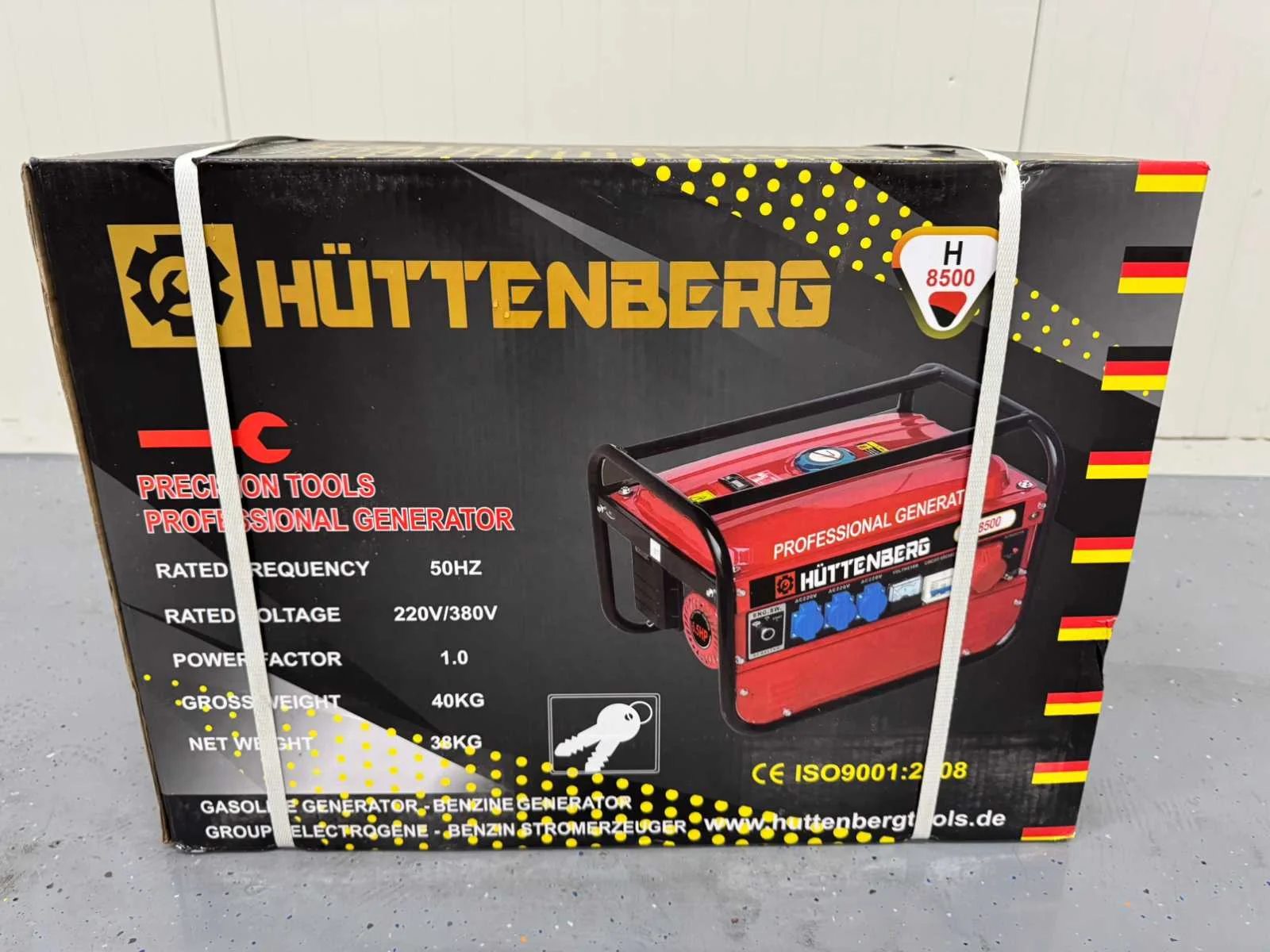 Ongebruikt Type 4 takt, één cilinder Lucht gekoeld 6,5 PK - 3000 toeren per minuut 15 liter tank inhoud normale loodvrije benzine Verbruik ca. 1.36 liter per uur. Werkt ca. 11 uur continu op 1 tankinhoud. Olie inhoud 0,6 liter Geluidsniveau 68 dB gemeten op 7 meter afstand Output 3x220 Volt, 1x 380 Volt 50Hz, 1x 12 Volt Continue vermogen 2000 Watt (2Kva) Maximum output 2500 Watt (2,5 Kva) Afmetingen; 60,5 x 43,0 x 42,0 CM. Gewicht 42 KG. Voltmeter en automatische Volt correctie. Nee Merk: Hüttenberg Type: H8500 Bouwjaar: 2025 Capaciteit.: 2.5kVA Machinegewicht: 42kg Totale afmeting L: 610mm Totale afmeting Breedte: 430mm Totale afmeting Hoogte: 420mm