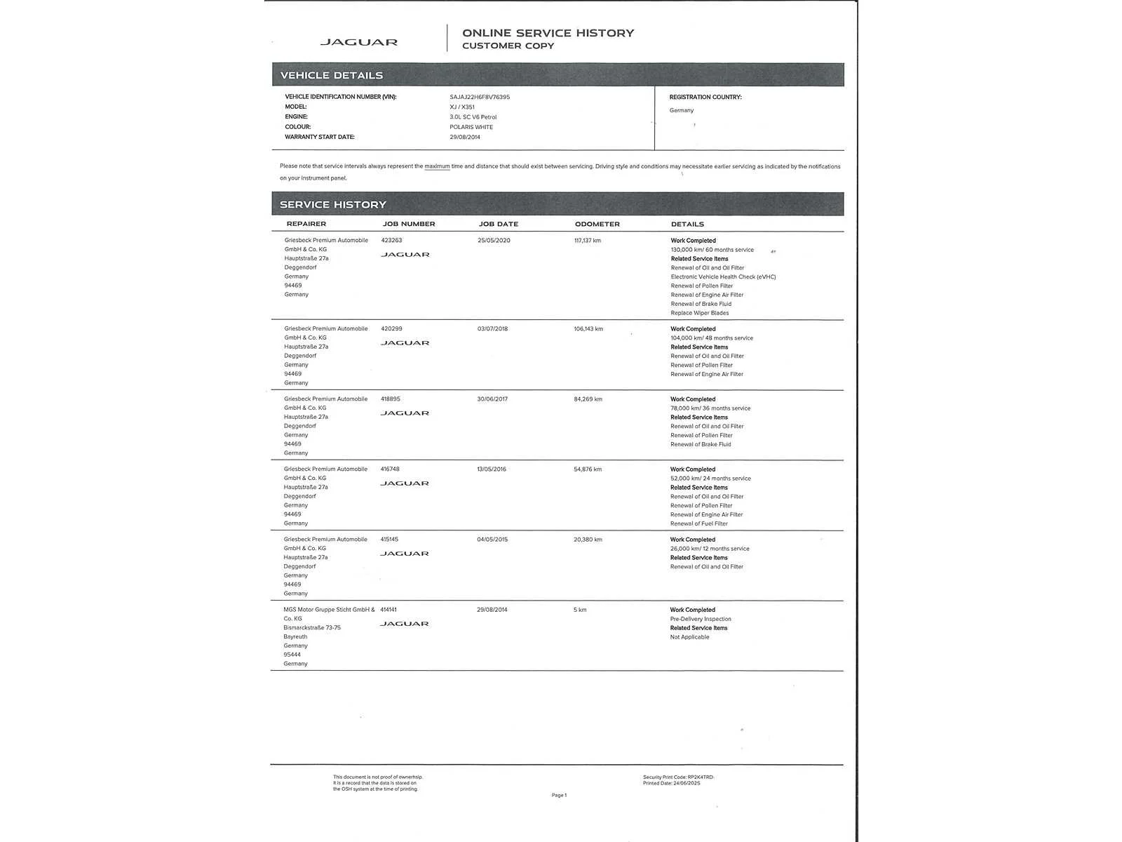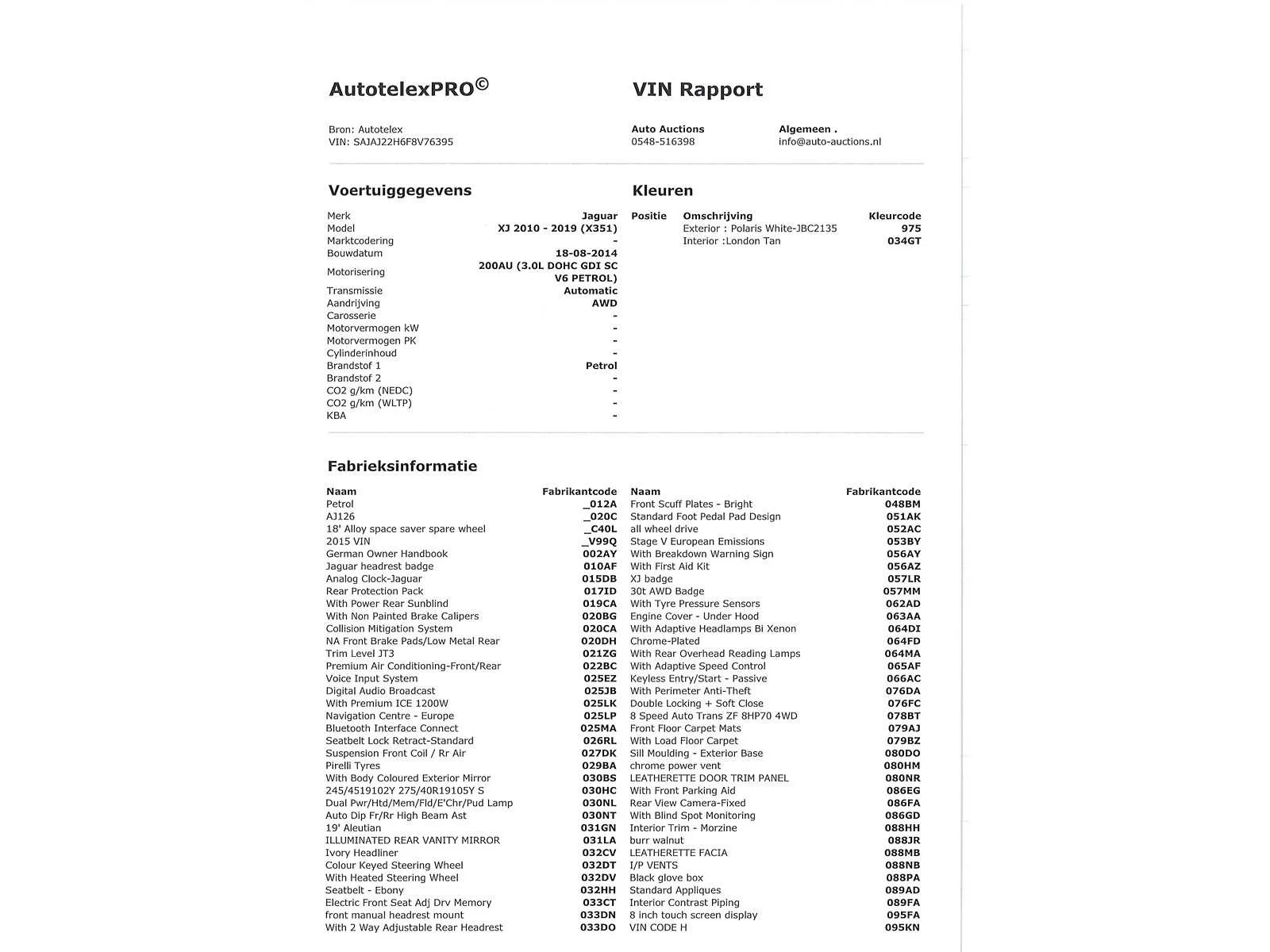 Voor vragen kunt u mailen naar info@auto-auctions.nl No Kenteken: Duitse kenteken papieren Merk: Jaguar Model: XJ Type: 3.0L SC V6 Petrol Afgelezen kilometerstand: 174893km Cilinderinhoud: 2995cc Vermogen (kW): 250kW Brandstof: Benzine Chassisnummer: SAJAJ22H6F8V76395 Datum eerste toelating: 29-08-2014 Vermogen (pk): 340hp Aandrijving: Achterwiel Aandrijving Aantal zitplaatsen: 5 Kleur: Wit Transmissie: Automaat Aantal deuren: 4 Aantal sleutels: 2 Aantal cilinders: 6 Carrosserie: Sedan Onderhoudshistorie: Digitaal Aanwezig Start en rijdt: Ja