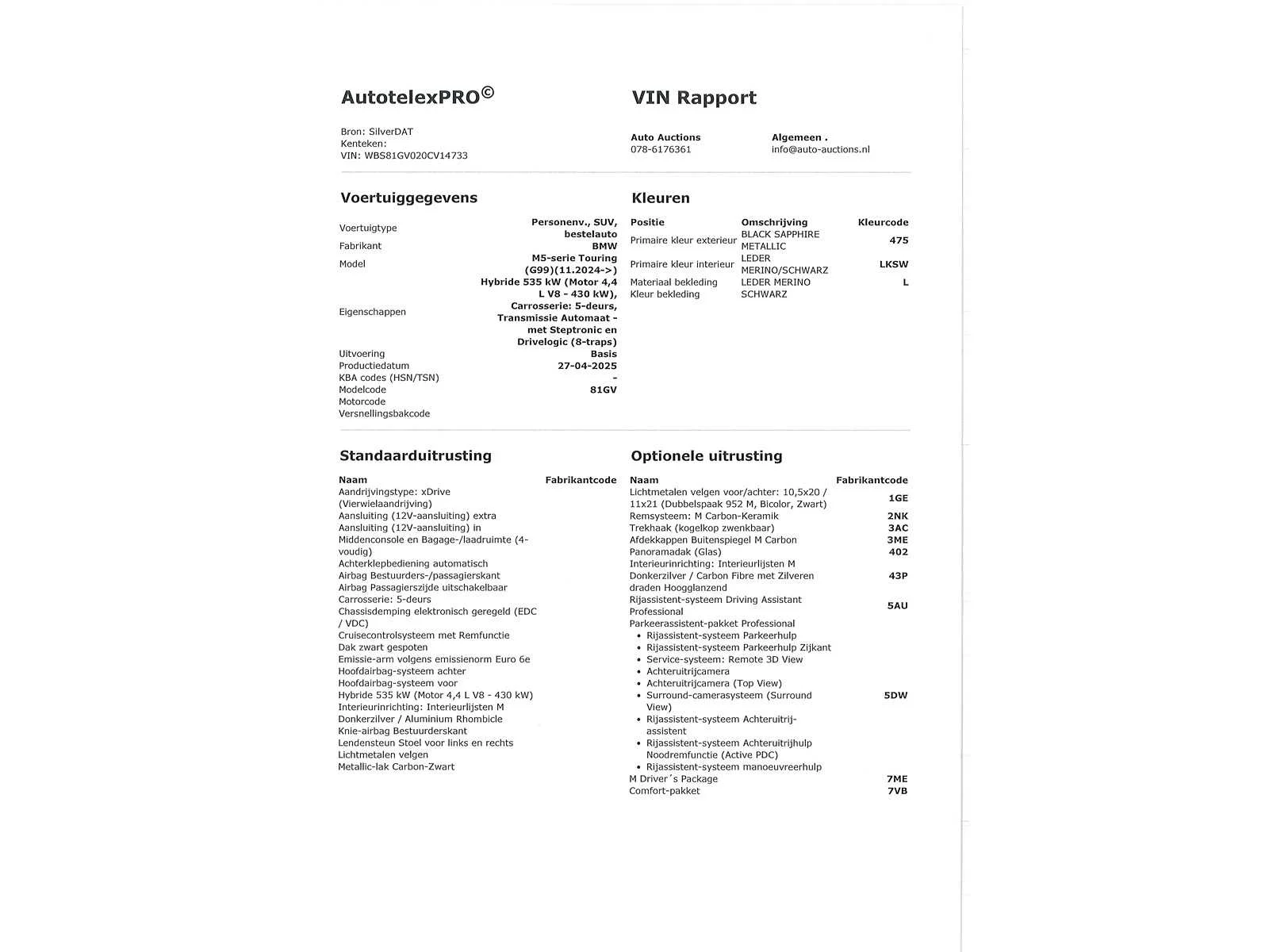 Voor vragen kunt u mailen naar info@auto-auctions.nl No Kenteken: Duitse kenteken papieren Merk: BMW Model: M5 Touring Type: 4.4 V8 Hybride Afgelezen kilometerstand: 26km Cilinderinhoud: 4395cc Vermogen (kW): 535kW Brandstof: Hybride Benzine Chassisnummer: WBS81GV020CV14733 Datum eerste toelating: 22-05-2025 Vermogen (pk): 728hp Aandrijving: Vierwielaandrijving Aantal zitplaatsen: 5 Kleur: Saphir Zwart Metallic Transmissie: Automaat Aantal deuren: 5 Aantal sleutels: 2 Aantal cilinders: 8 Carrosserie: Stationwagen Nationaliteit documenten: Duitse kenteken papieren CVO verklaring: true Onderhoudshistorie: Digitaal Start en rijdt: Ja oplaadkabel : Aanwezig