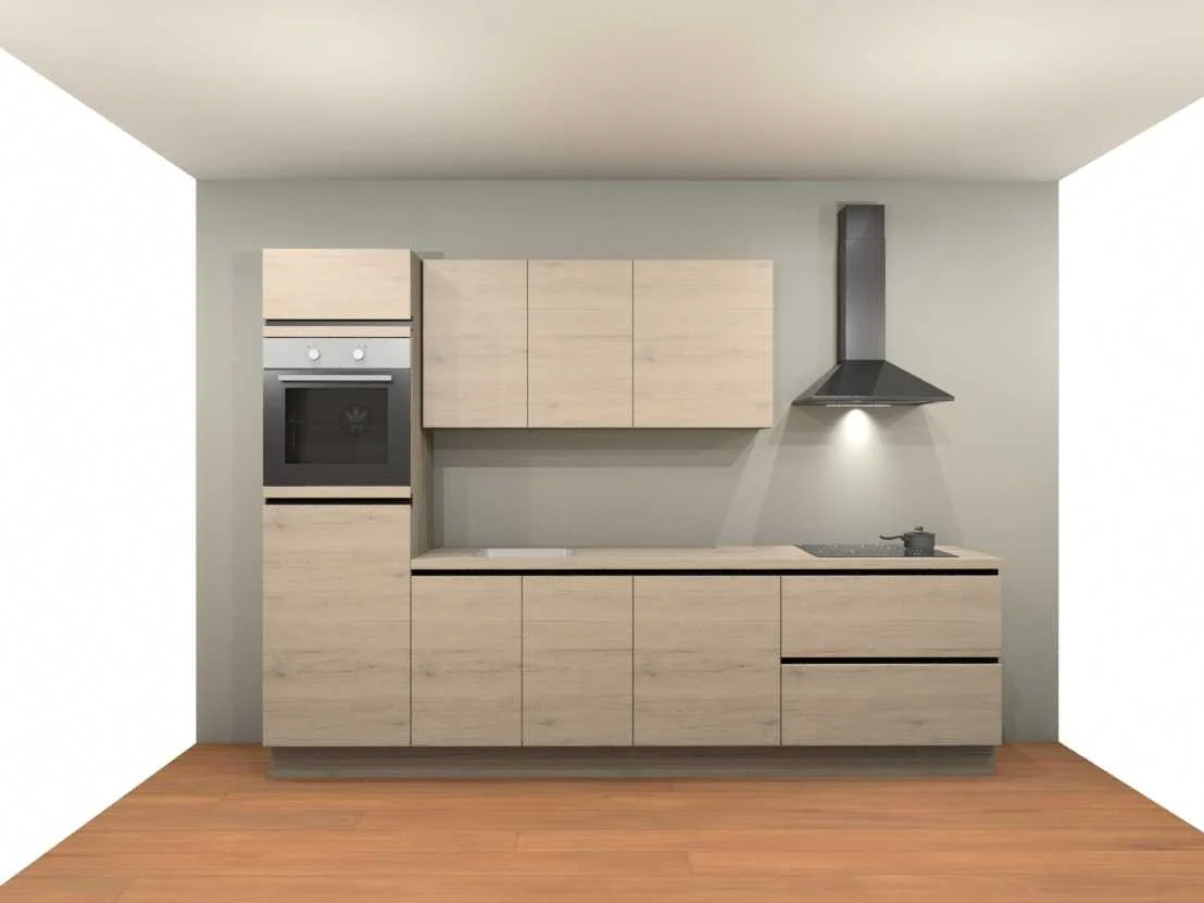Let op! staat niet opgesteld in de showroom, enkel 3D tekeningen, wordt geleverd ongebruikt in doos Nee Merk: Nobilia Model: Decor eiken San Remo Type keukenopstelling: Recht Lengte: 300cm Breedte: 60cm Hoogte: 217cm Gootsteen: Reginox Colorado RVS opbouw Werkblad hoogte: 91cm Aanrechtblad: HPL eiken San Remo Warmwaterkraan: Decor eiken San Remo (078) Fornuis: Laurus LCA60 keramisch kookplaat 60cm 4 kookzones Koelkast: Laurus LKS88F koeler 88cm Softclose: true Oven: Laurus LEB5 Multifunctionele oven 60cm Afzuigkap: Elica MISSYBL60- D 60cm zwart Vaatwasser: Laurus LSV604 volledig geïntegreerde vaatwasser Plintkleur: eiken San Remo Hoofdkleur: eiken San Remo Style: Modern greeploos Kleur: eiken San Remo