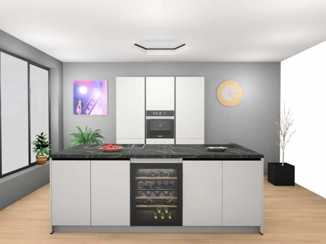 Miele KMDA7473FR-U Inductiekookplaat inclusief afzuigsysteem, 4 kookzones, 2 flex zones, 80cm. Siemens KU21WAHG0 Onderbouw wijnklimaatkast 60x82cm. Let op! Staat niet opgesteld in de showroom, enkel via 3D tekening; wordt geleverd ongebruikt in doos. Let op! Excl. Kraan en accessoires. Nee Merk: Häcker Concept130 Model: Topsoft mat wit lak Type keukenopstelling: Eiland Lengte: 185cm Breedte: 60cm Hoogte: 218cm Gootsteen: Reginox Amsterdam 50 pure black Pure Black opbouw spoelbak 50x40cm Werkblad hoogte: 92cm Aanrechtblad: HPL Kunststof marmer groen repro (150) Koelkast: Miele K7125E Integreerbare koelkast met superKoelen, inhoud 136 liter, Nis 88cm Softclose: true Oven: Miele H2861BCLST Multifunctionele oven PureLine met 8 programma's, inhoud 76 liter, Nis 60cm. Vaatwasser: Miele G5150SCVI Volledig integreerbare vaatwasmachine met 5 reinigingsprogramma's 60cm Lengte kookeiland: 244cm Breedte kookeiland: 120cm Hoogte kookeiland: 92cm Plintkleur: mat wit Hoofdkleur: mat wit lak Style: Modern greeploos Kleur: mat wit lak