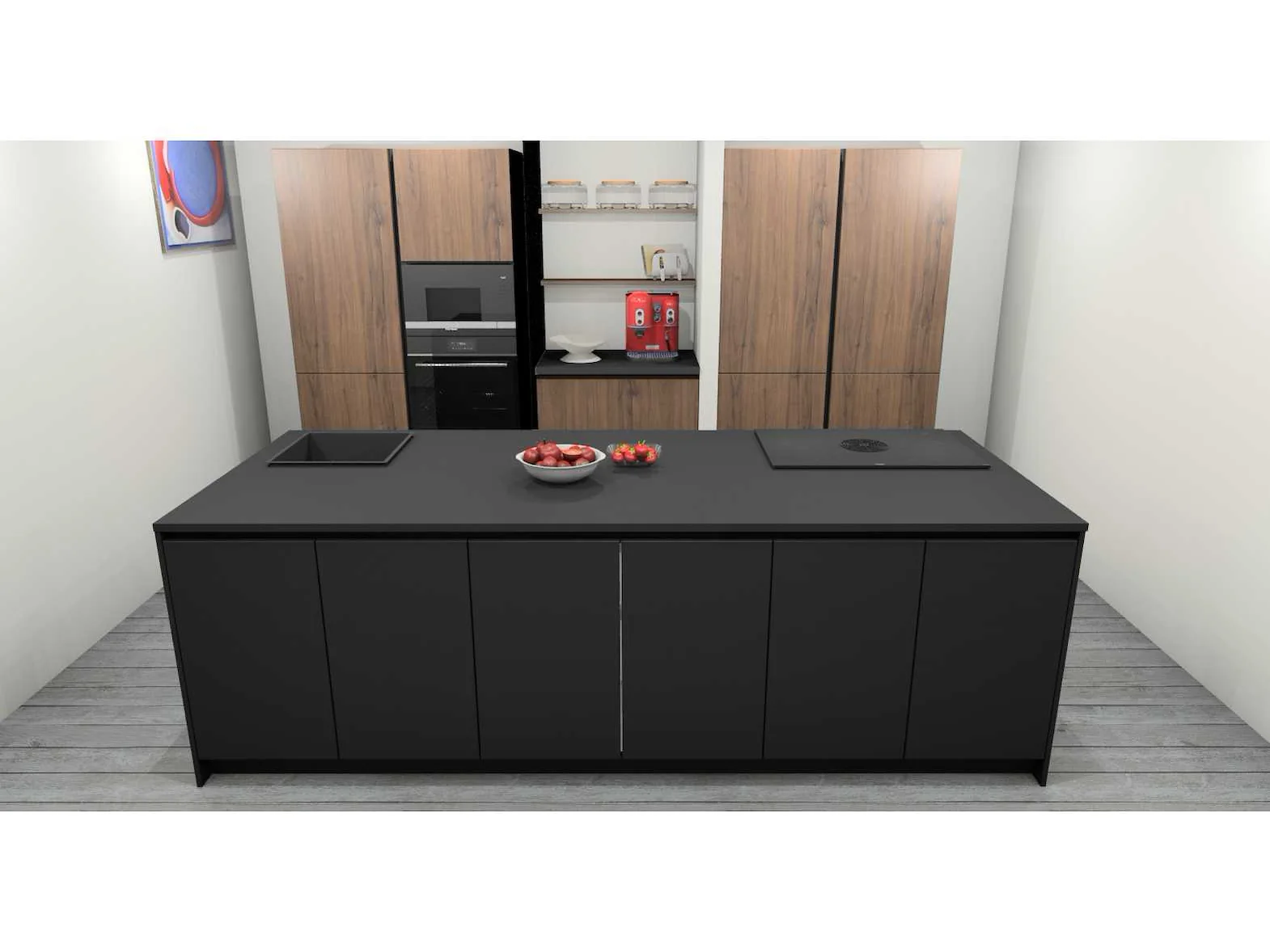 Bora Puru inductie afzuiging met ingebouwde kookveldafzuiging Recirculatie 76cm, 4 kookzones. Let op! Staat niet opgesteld in de showroom, enkel 3D tekeningen. Let op! 2 kleuren in de keuken. Let op! Zonder accessoires, keuken klein materiaal, kraan. Let op! Staat niet opgesteld, enkel afbeeldingen. Let op! wordt geleverd ongebruikt in doos. Nee Merk: Häcker Concept130 Model: Bali Notenhout - Topsoft mat lak zwart Type keukenopstelling: Eiland Lengte: 335cm Breedte: 60cm Hoogte: 205cm Gootsteen: Reginox Spoelbak Amsterdam PURE 50 mat zwart. 50x40cm Werkblad hoogte: 92cm Aanrechtblad: HPL mat zwart (169) Magnetron: Siemens BF425LMB0 Magnetron, Nis 38cm Koelkast: Siemens KI86V5SE0 Integreerbare koel/vriescombinatie iQ100 met lowFrost, inhoud 267 liter,, 178cm Softclose: true Oven: Siemens HB472G0B3 Multifunctionele oven iQ300 met 7 verwarmingswijzen, inhoud 71 liter, Nis 60c, Vaatwasser: Siemens SN63H802UE, Volledig integreerbare vaatwasmachine iQ300 met 6 programma's, 4 speciale functies waaronder Home Connect via WiFi, 60cm Lengte kookeiland: 274cm Breedte kookeiland: 110cm Hoogte kookeiland: 92cm Plintkleur: Mat zwart Hoofdkleur: Bali Notenhout - Topsoft mat lakzwart Style: Modern greeploos Kleur: Noten - mat zwart