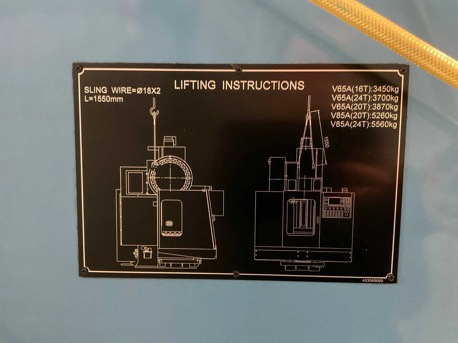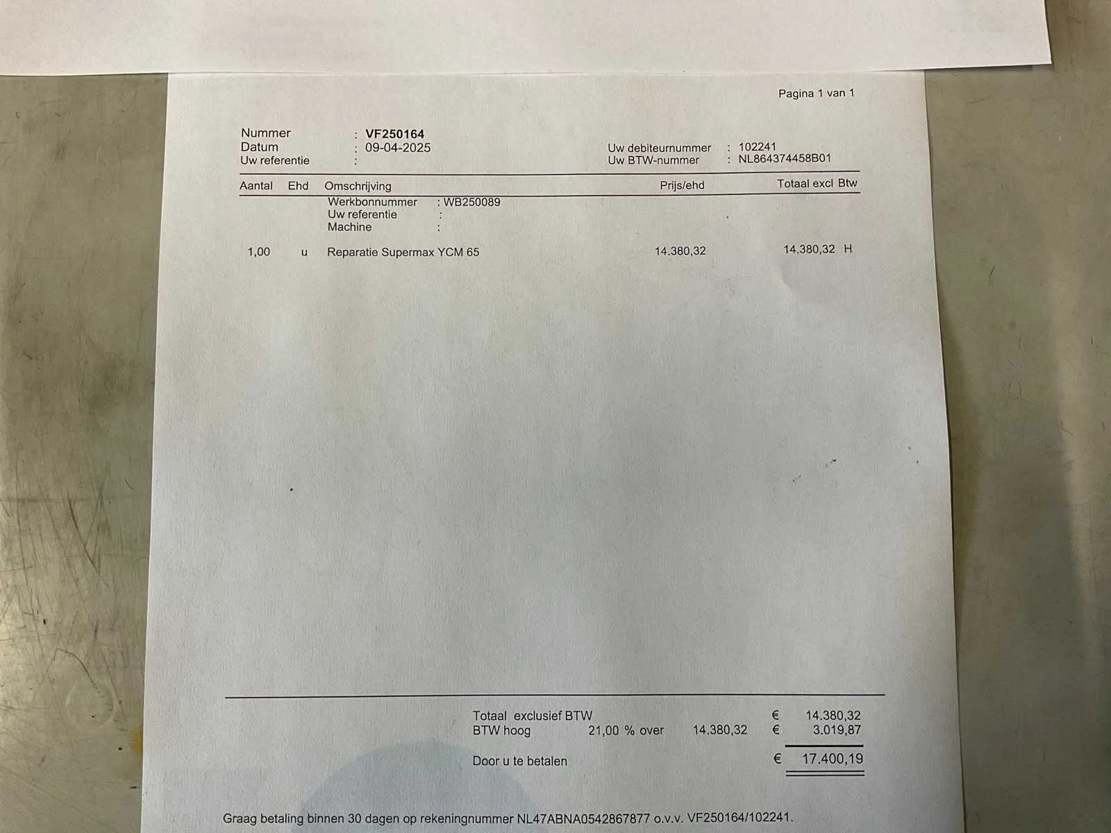 Voorzien van: Fanuc Series 18-M besturingssysteem, Olie koelsysteem, Gereedschapswisselstation (20 plaatsen), spanen lade, recent onderhoud aantoonbaar (april 2025 revisie, kosten: 17.000 euro) Nee Merk: Supermax Type: YCM-V65A Bouwjaar: 1999 Verplaatsing x-as: 650mm Verplaatsing y-as: 410mm Verplaatsing z-as: 615mm Opname: BT40 Snelheid tot n =: 8000rpm T-gleuf opspantafelafmeting L: 840mm T-gleuf opspantafelafmeting B: 420mm Werkstuk gewicht max.: 350kg Koelmiddelpomp: true Motorvermogen (kW): 5.5kW Aansluiting: 400V Machinegewicht: 3870kg Afmeting l: 2770mm Afmeting b: 2110mm Afmeting h: 1930mm Leveringsvoorwaarden: Geen heftruck aanwezig op locatie!