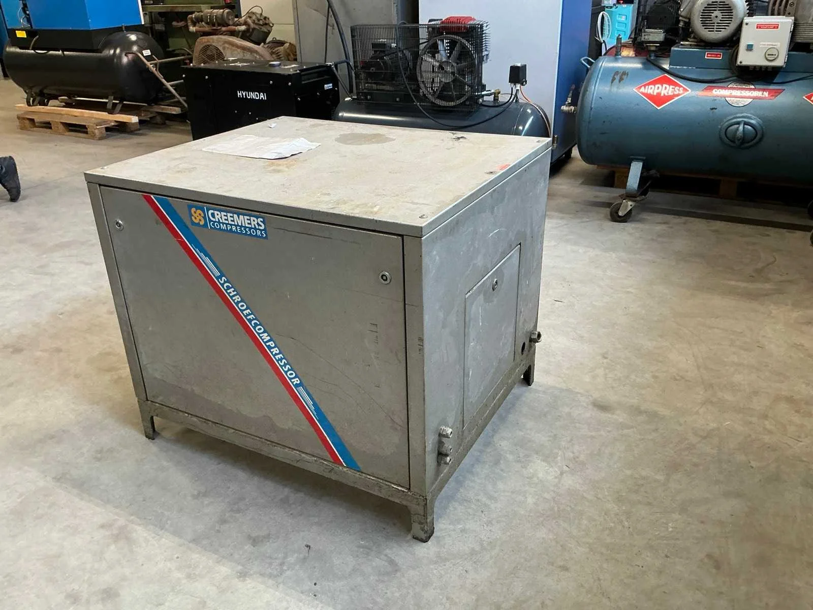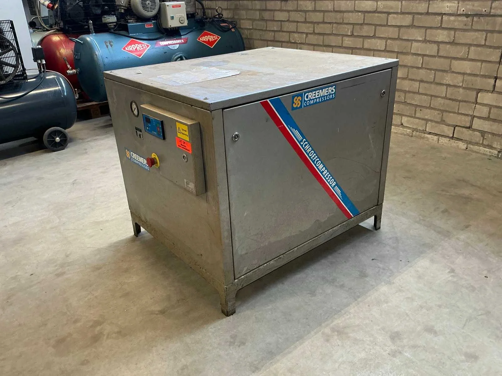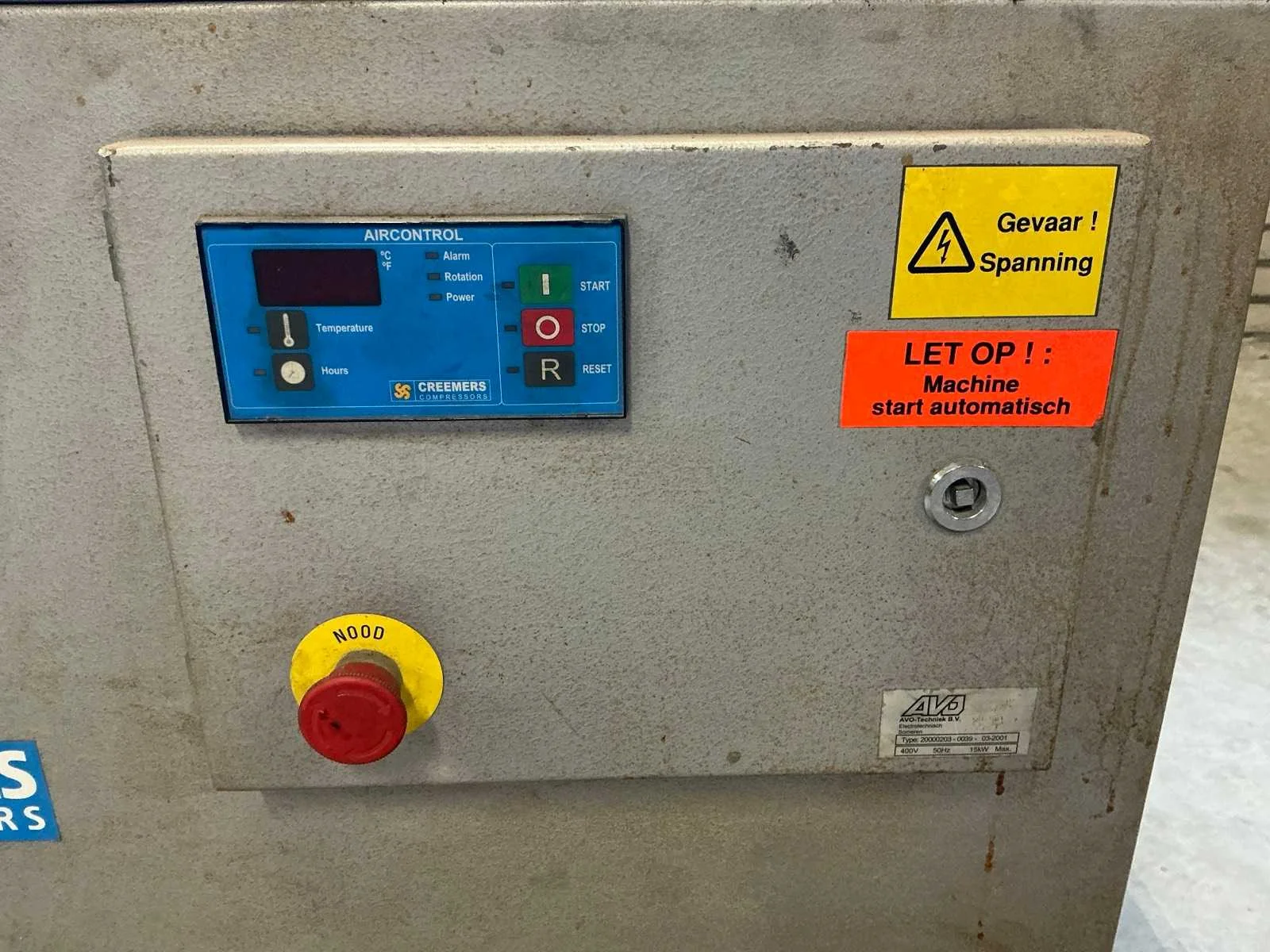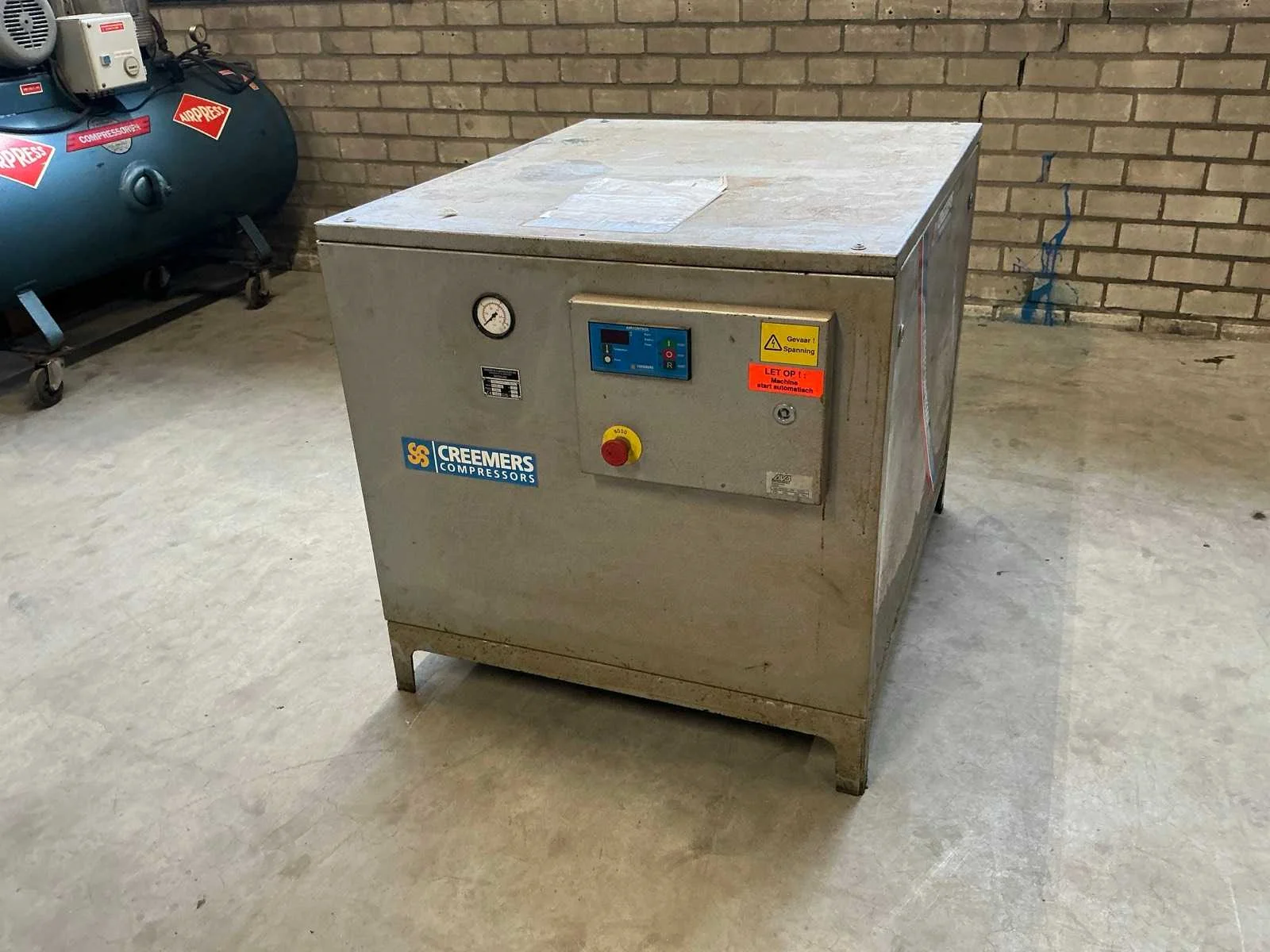 Voorzien van: noodstop, drukmeter, 15Kw, 1660 Liter/min, schroefcompressor. Nee Merk: Creemers Type: RCH 15-61 Bouwjaar: 2001 Serienummer: 70975 Capaciteit.: 10bar Luchtstroom: 1660l/min Vermogen: 15kW Totale afmeting L: 850mm Totale afmeting Breedte: 1100mm Totale afmeting Hoogte: 8500mm