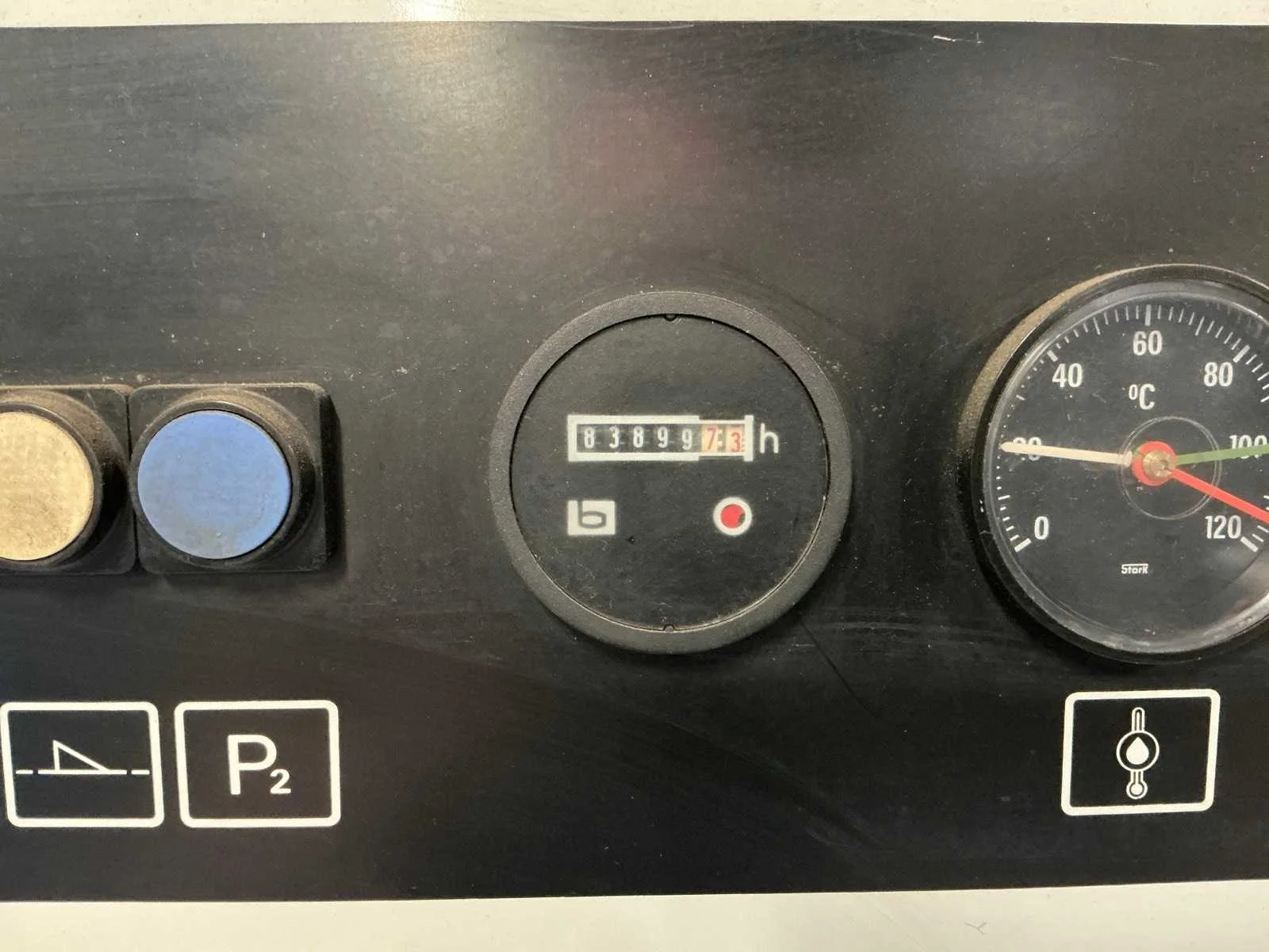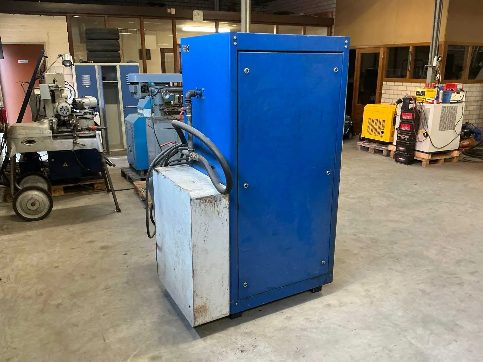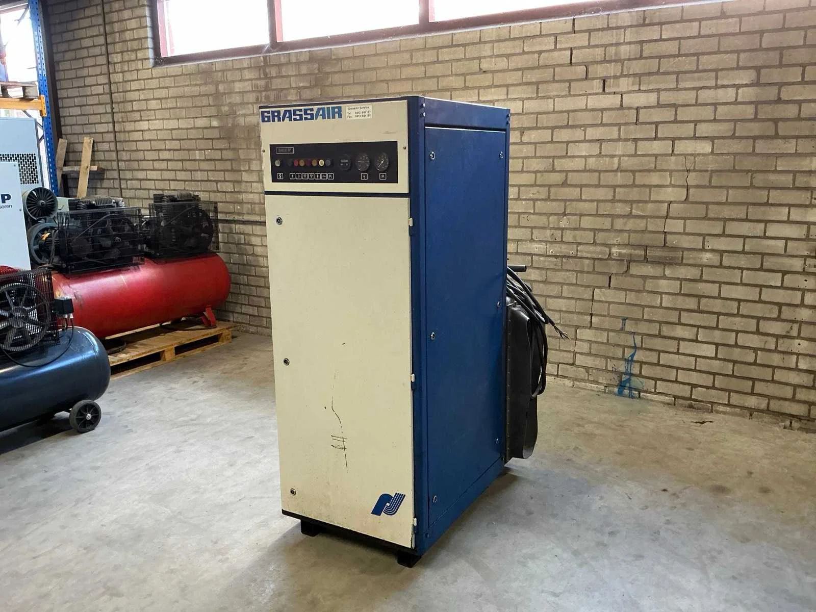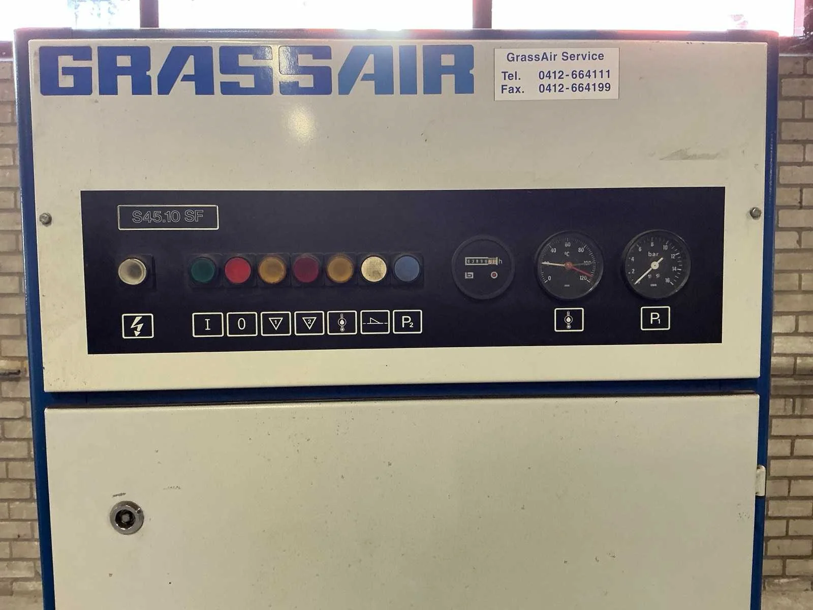 Voorzien van: urenteller, temperatuur en drukmeter, kogelkraan. Nee Merk: Grassair Type: S45.10 SF Serienummer: 450571287 Capaciteit.: 10.5bar Vermogen: 15kW Afgelezen urenstand: 83899 Aansluiting: 380V Totale afmeting L: 1200mm Totale afmeting Breedte: 750mm Totale afmeting Hoogte: 1850mm