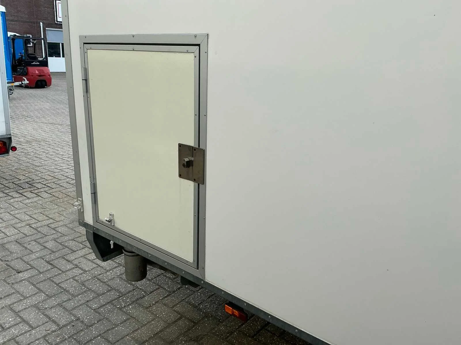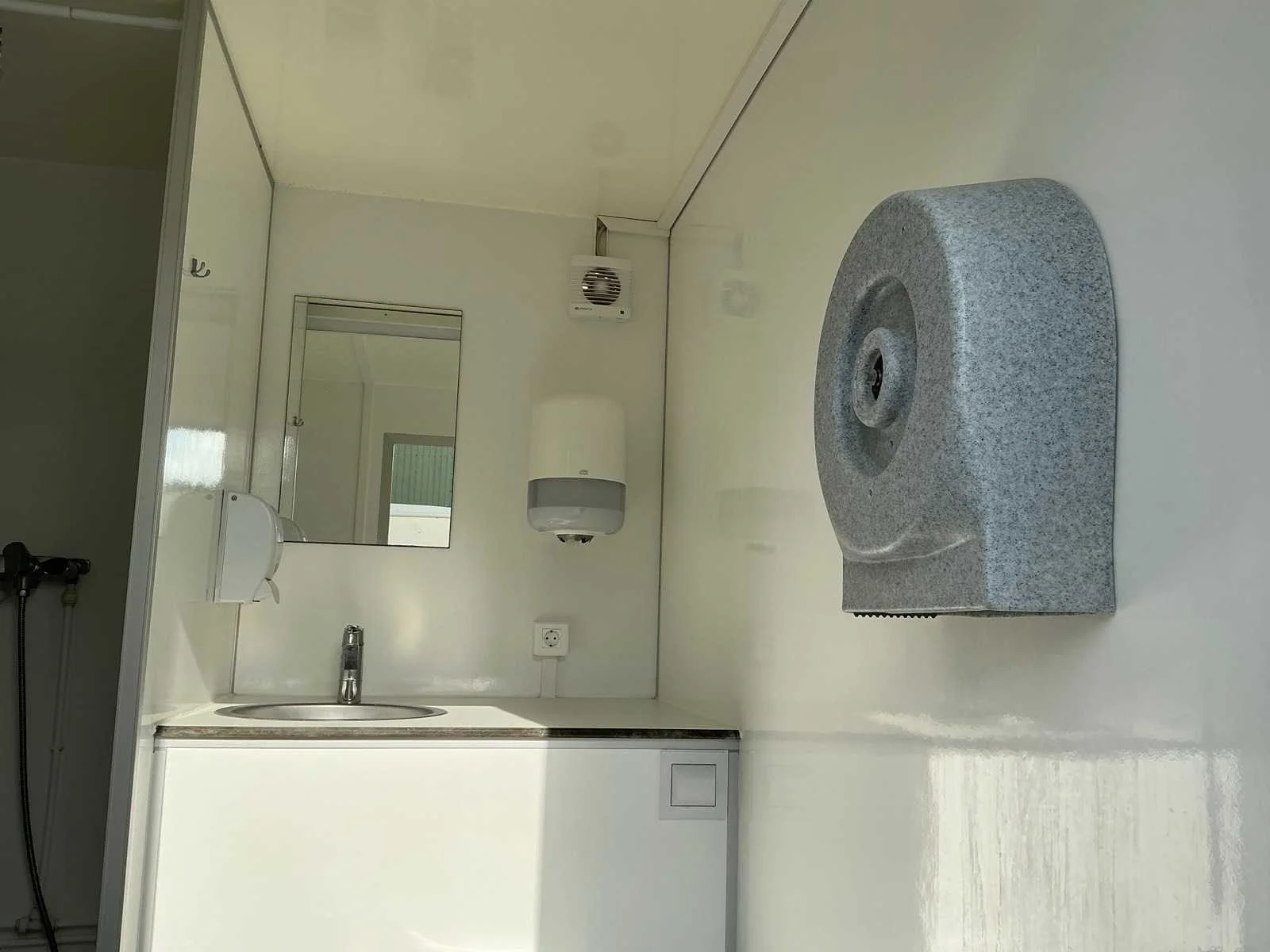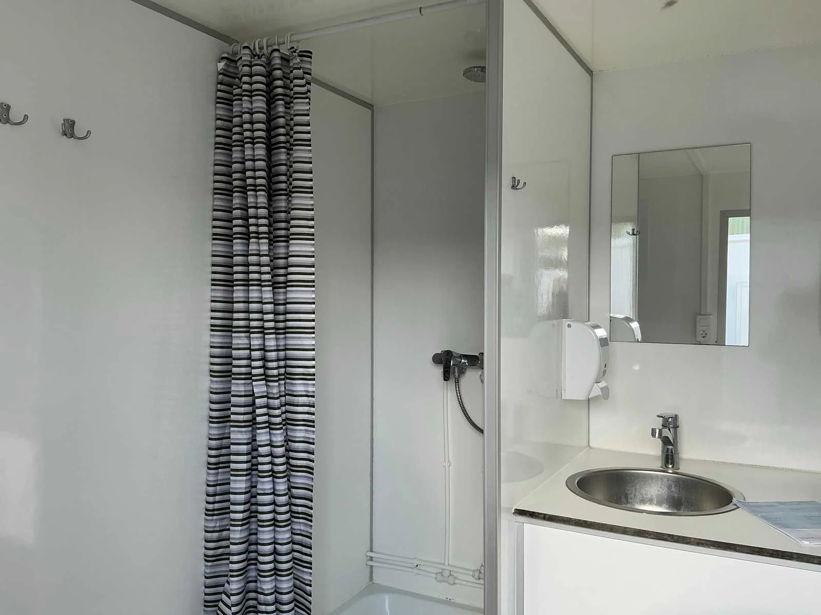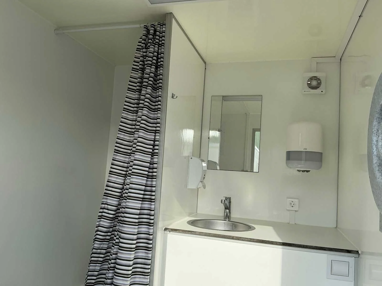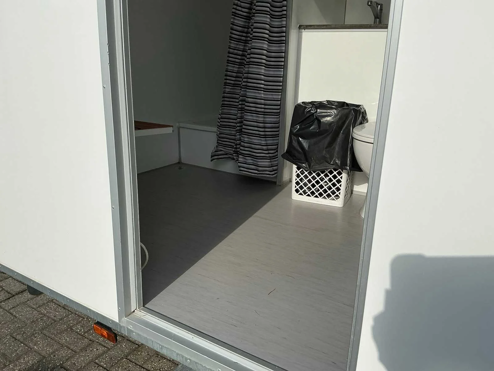 Voorzien van: 3x complete doucheruimte voorzien van toilet met toiletrolhouder vuilnisbak en toiletborstel, wasbak met kraan en spiegel en zeeppompdispenser, bankje, douchebak met douchekraan en gordijn, electrische kachel, verlichting, trapje, technische ruimte per doucheruimte ( 30L boiler, antivrieskachel, spoelbak toilet), aansluiting 1x 110 PVC, 1x 3/4 wateraansluiting, 1x 400V 16A aansluiting, steunpoten Nee Merk: Easywagen Type: 660 Bouwjaar: 2018 Afmeting l: 6600mm Afmeting b: 2500mm Afmeting h: 2900mm Aantal ramen: 3 Aantal toiletten: 3 Aantal wastafels: 3 Aantal douches: 3 Eigen gewicht: 2000kg