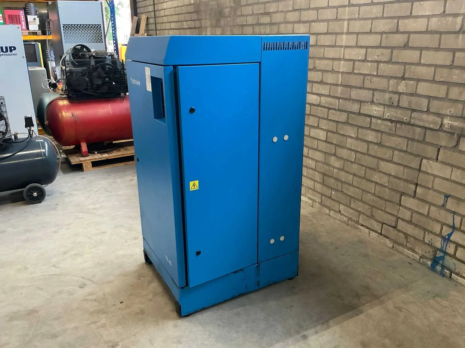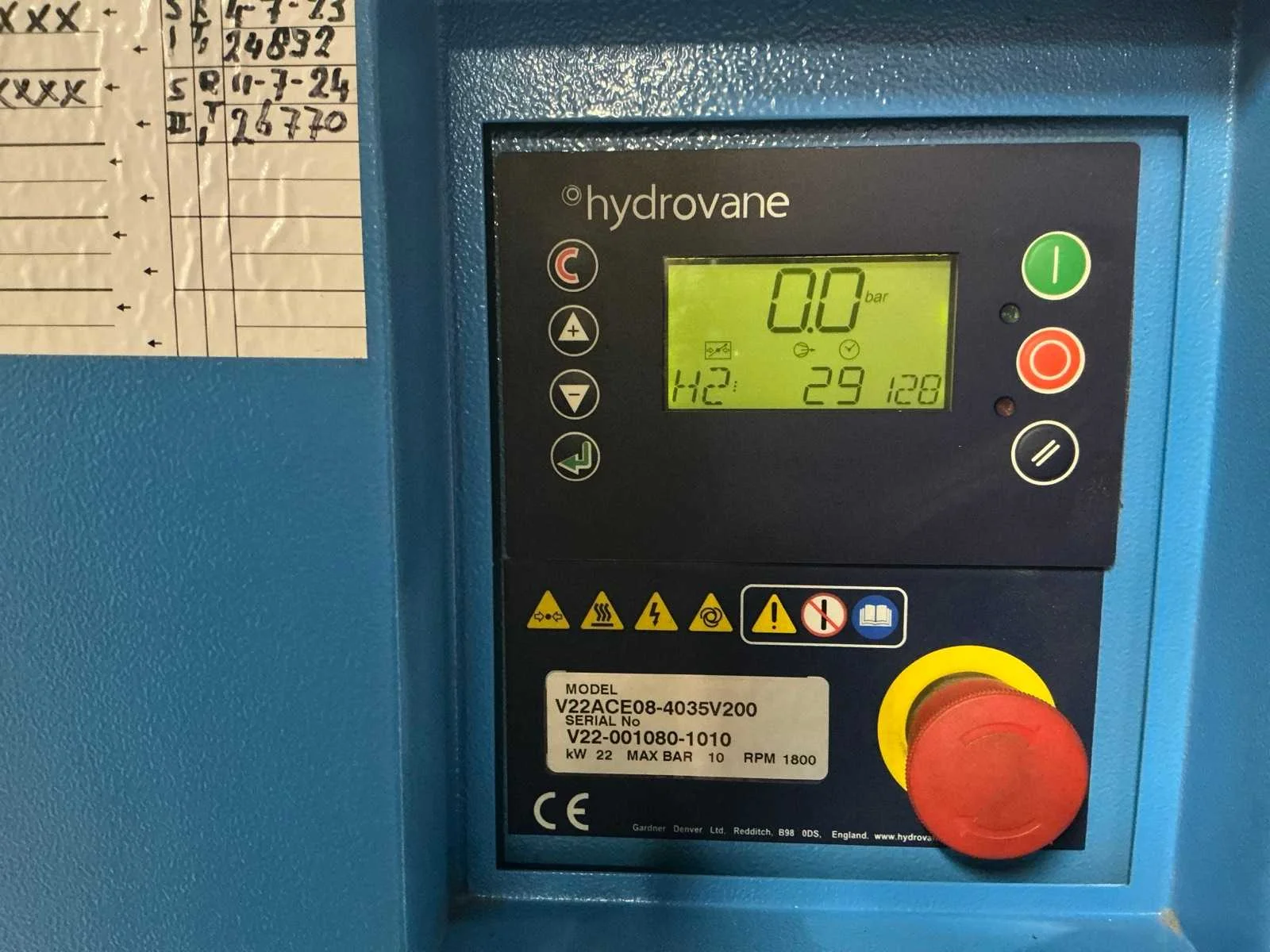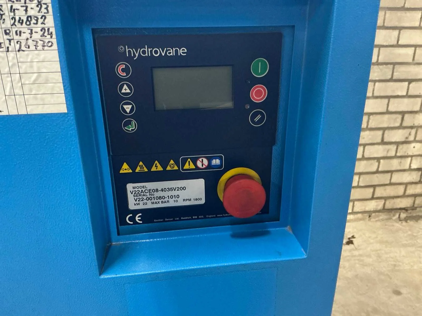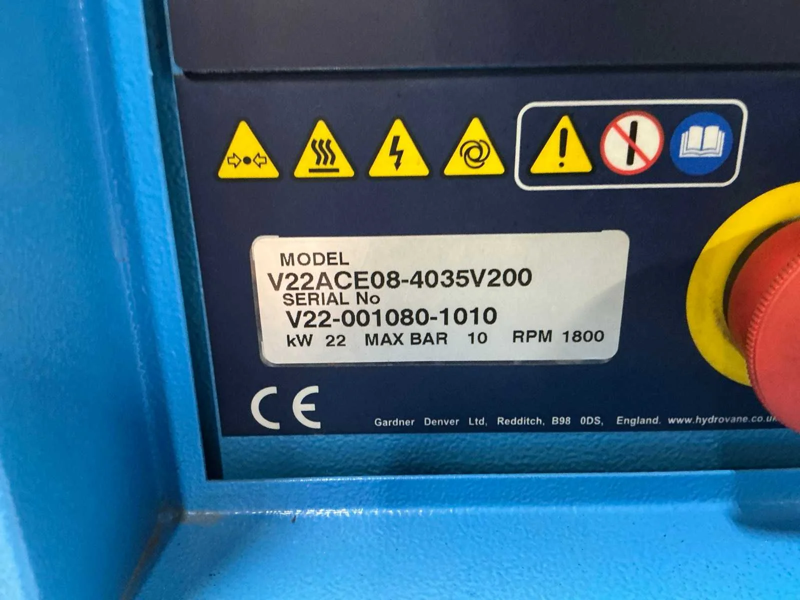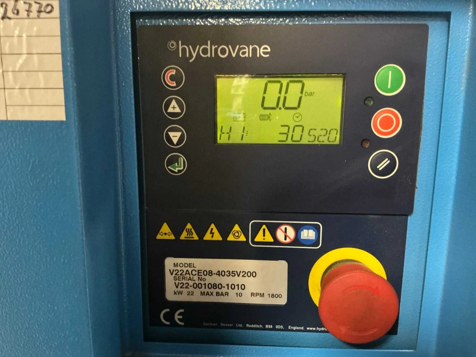 Voorzien van: noodstop, display, frequentie regelaar, documentatie. Nee Merk: Hydrovane Type: V22ACE08-4035V200 Serienummer: V22-001080-1010 Capaciteit.: 10bar Vermogen: 22kW Aansluiting: 380V Totale afmeting L: 850mm Totale afmeting Breedte: 700mm Totale afmeting Hoogte: 1550mm