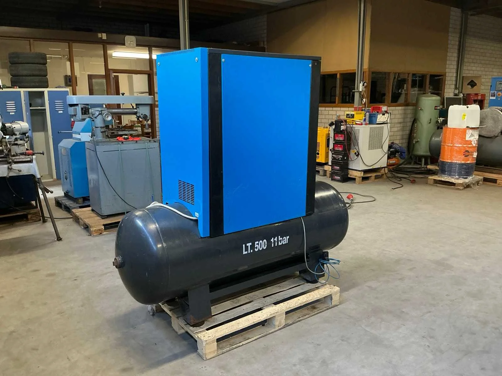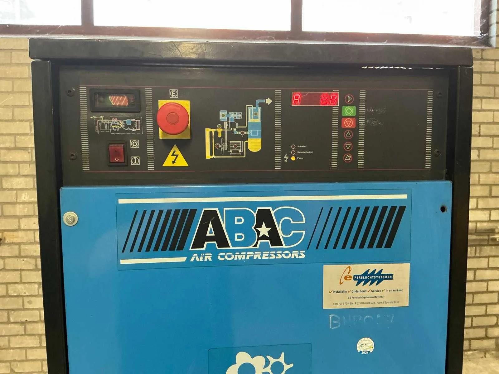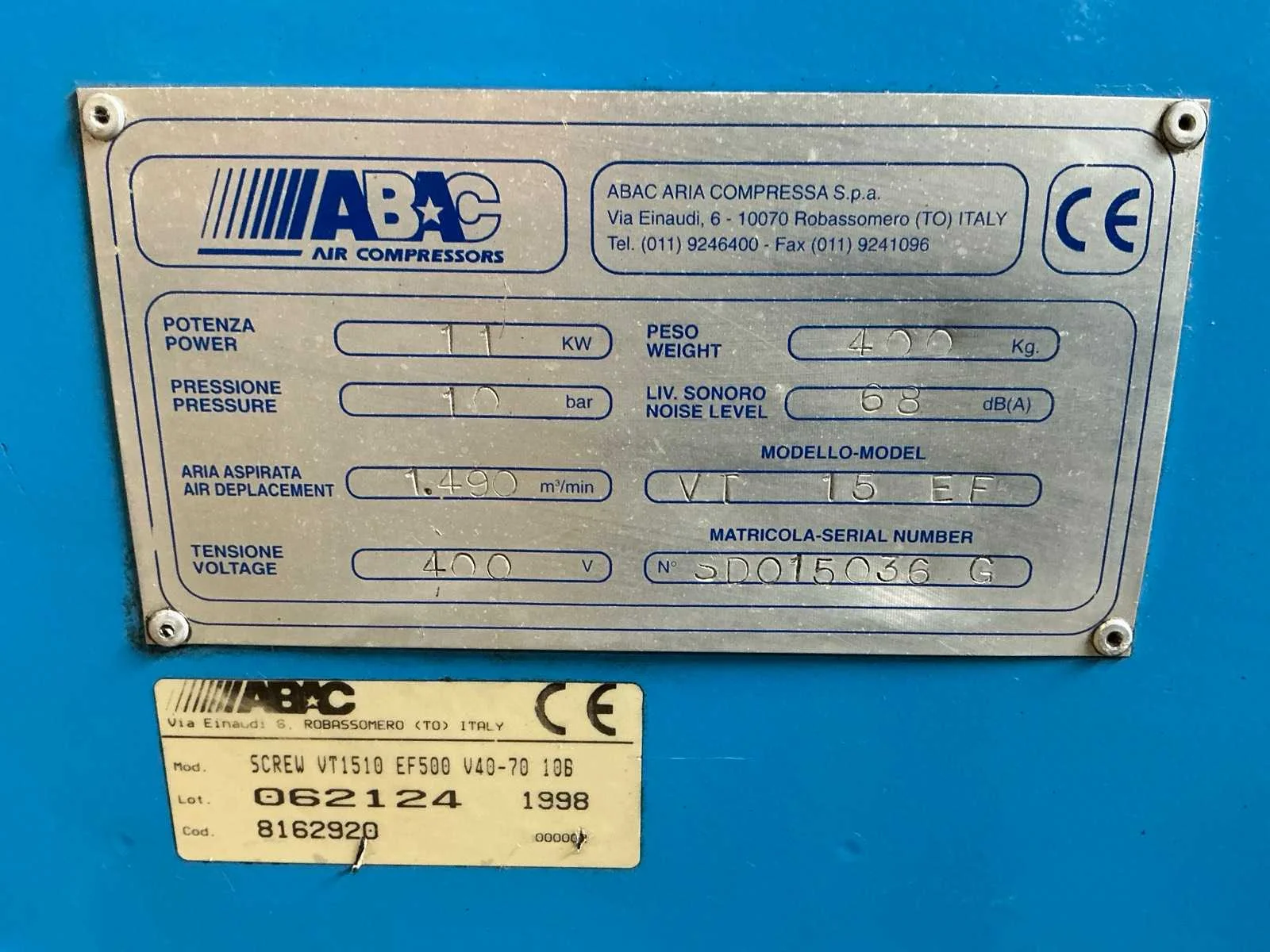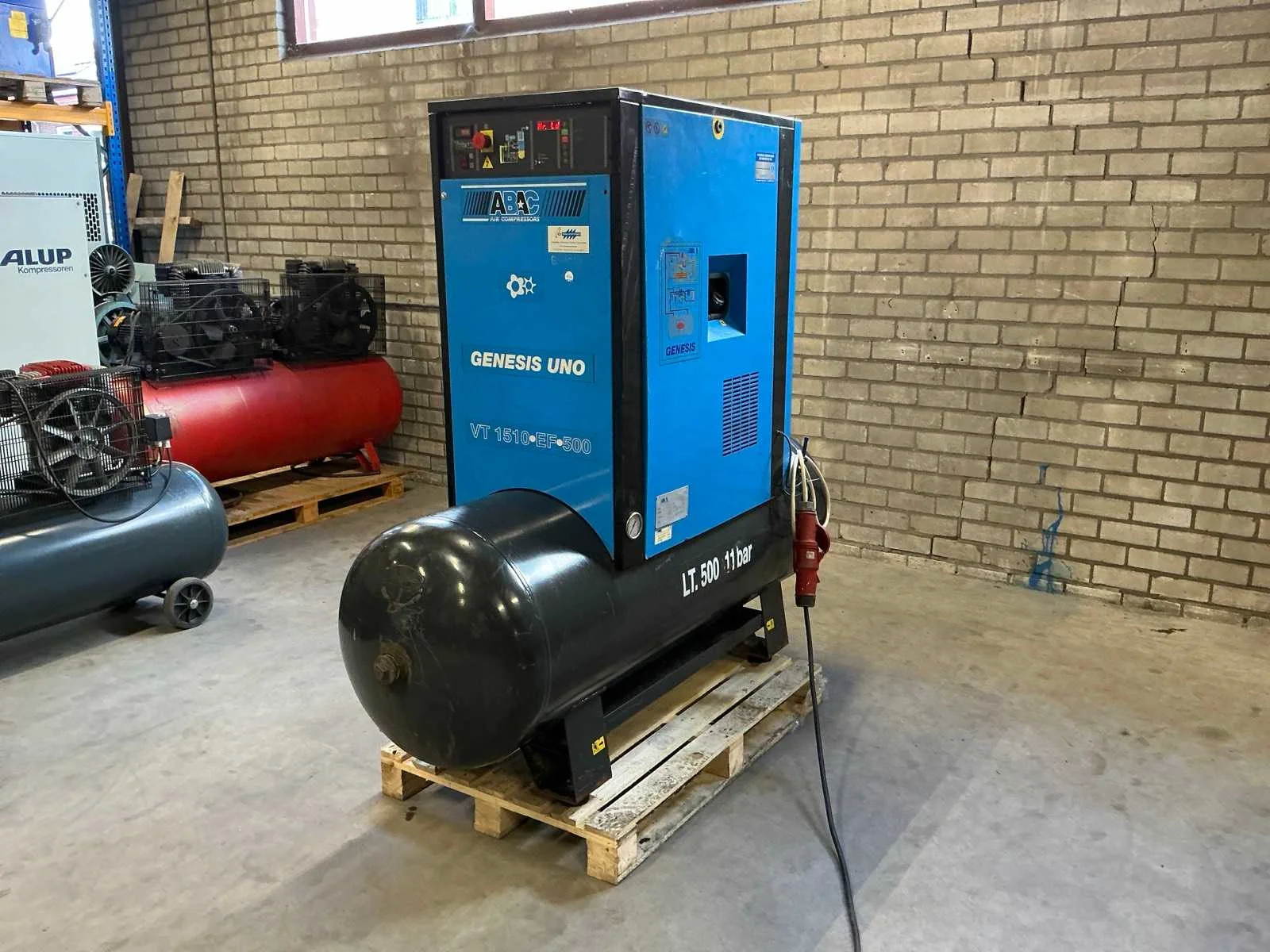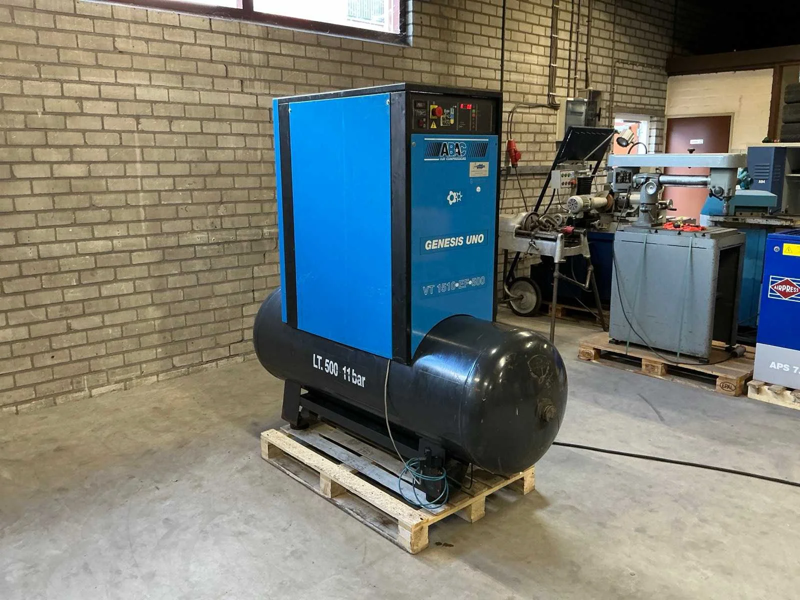 Voorzien van: noodstop, display, drukmeter, temperatuur bewaking, luchtdroger, geluidsisolatie. Nee Merk: Abac Type: VT 1510 EF 500 Bouwjaar: 1998 Serienummer: SD015036 G Capaciteit.: 10bar Luchtstroom: 1490l/min Vermogen: 11kW Buffertank inhoud: 500l Afgelezen urenstand: 10834 Aansluiting: 380V Eigen gewicht: 400kg Totale afmeting L: 1900mm Totale afmeting Breedte: 600mm Totale afmeting Hoogte: 1700mm