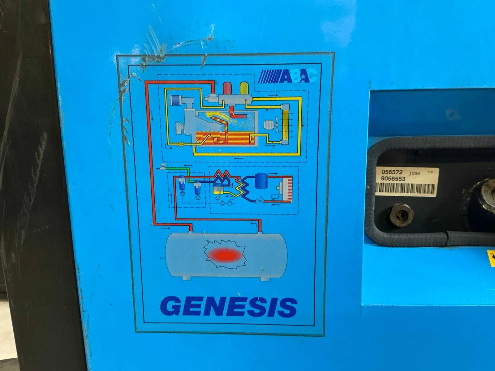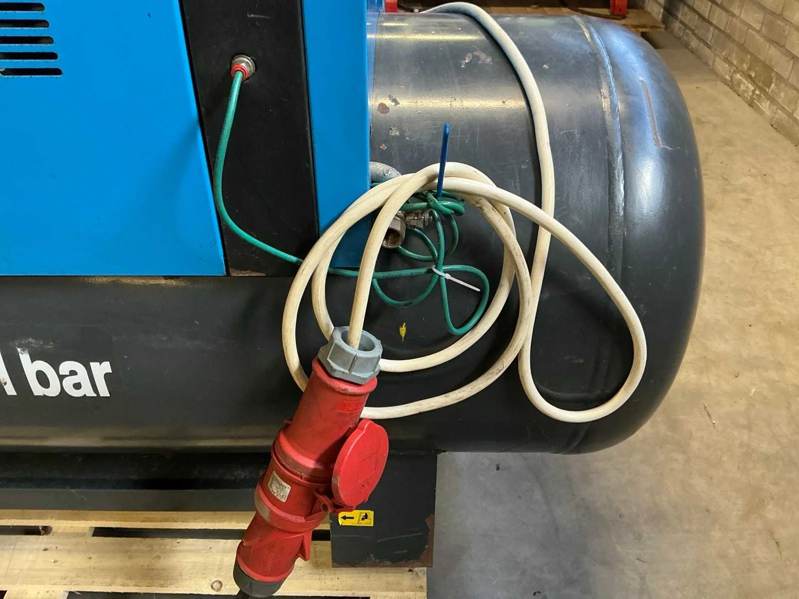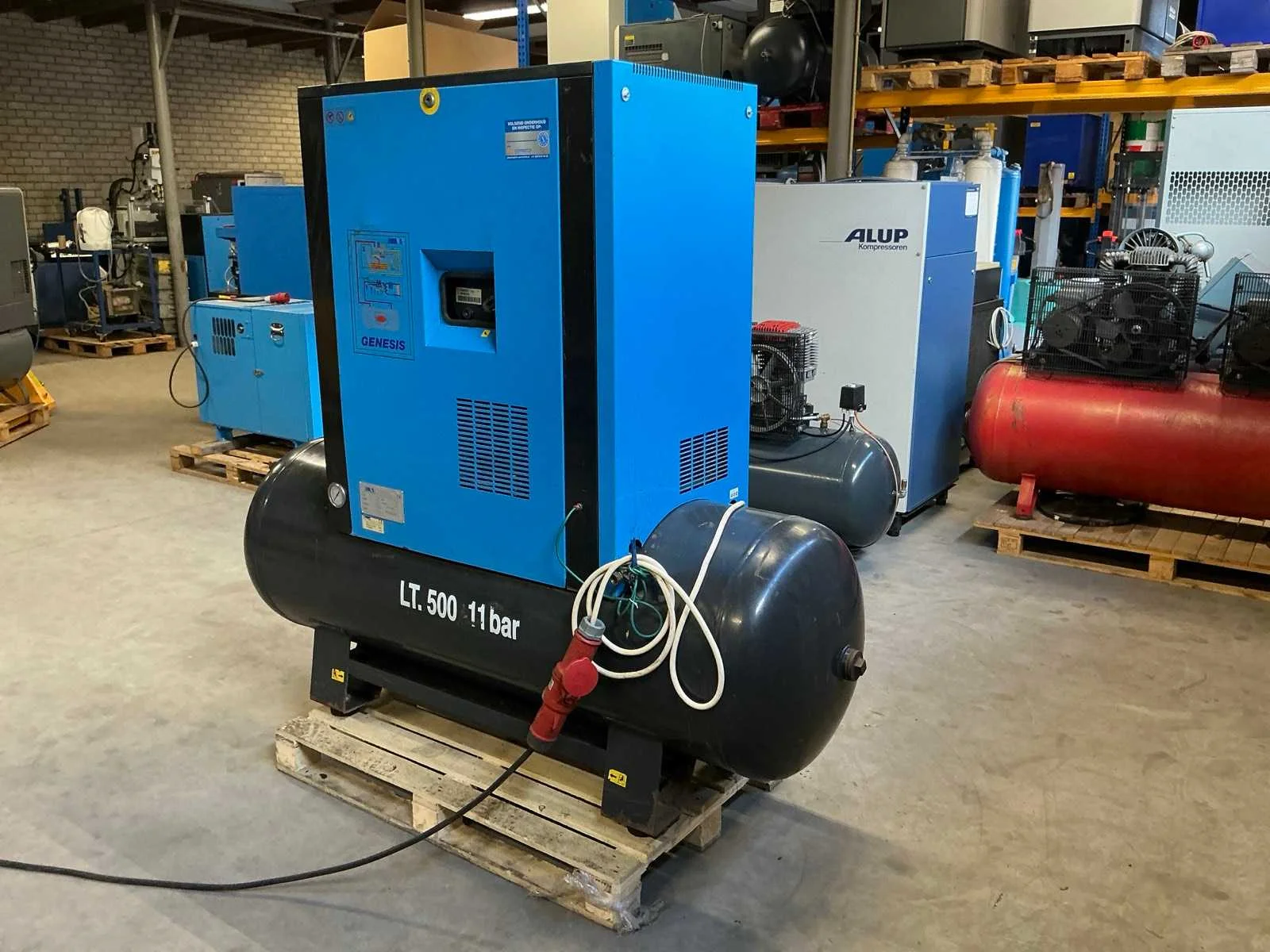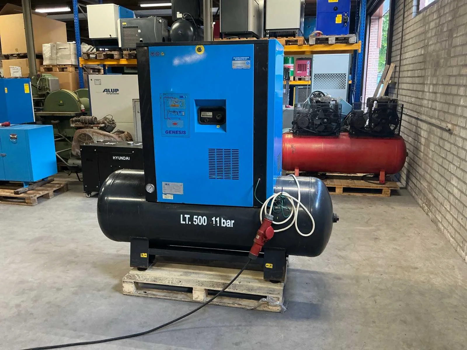 Voorzien van: noodstop, display, drukmeter, temperatuur bewaking, luchtdroger, geluidsisolatie. Nee Merk: Abac Type: VT 1510 EF 500 Bouwjaar: 1998 Serienummer: SD015036 G Capaciteit.: 10bar Luchtstroom: 1490l/min Vermogen: 11kW Buffertank inhoud: 500l Afgelezen urenstand: 10834 Aansluiting: 380V Eigen gewicht: 400kg Totale afmeting L: 1900mm Totale afmeting Breedte: 600mm Totale afmeting Hoogte: 1700mm