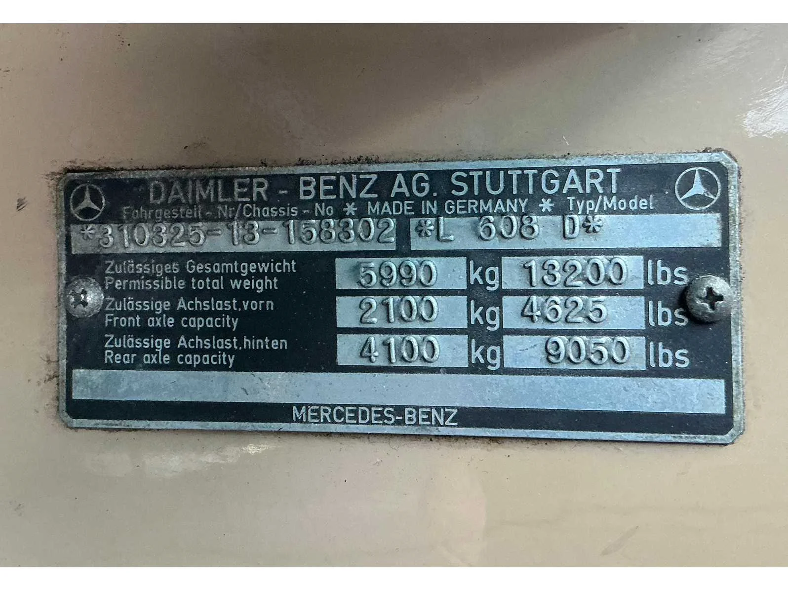 Wegenbelasting vrij. APK vrij. Terug gekeurd voor B rijbewijs. Onder andere voorzien van: 4 cilinder dieselmotor, handgeschakelde versnellingsbak (5 versnellingen), lange wielbasis a 350 cm, dubbellucht banden achter, bladveren achter, verhoogd dak (stahoogte binnen 193 cm), trekhaak, 2persoons bed 200x180 cm, elektronische stuurbekrachtiging, omvormer, stroomaansluiting, ladder,op achterdeur, WAECO koelkast, gaskookstel, diverse opbergruimtes, campingstoelen, campingtafel, losse zijtent, draaibare bijrijdersstoel, schuiframen, gordijnen, zijdeur, achterdeuren, inklapbare opstap voor zijdeur, reservewiel, wielkeg. Nee Kenteken: GB-62-16 Merk: Mercedes-Benz Model: L608D Chassisnummer: 310325-13-158302 Aantal zitplaatsen: 2 Bruto BPM (NL): 0€ Transmissie: Handgeschakeld 5 versnellingen Datum eerste toelating (NL): 1974-12-05 Datum eerste toelating: 1974-12-05 APK vervaldatum: n.v.t. Bouwjaar: 1974 Afgelezen kilometerstand: 311062km NAP status: Logisch Vermogen (kW): 63kW Vermogen (pk): 86hp Cilinderinhoud: 0cc Emissieklasse: 0 Brandstof: diesel Aantal deuren: 5 Kleur: Groen Carrosserie: kampeerwagen Lengte: 600cm Breedte: 225cm Hoogte: 280cm Ledig gewicht: 3120