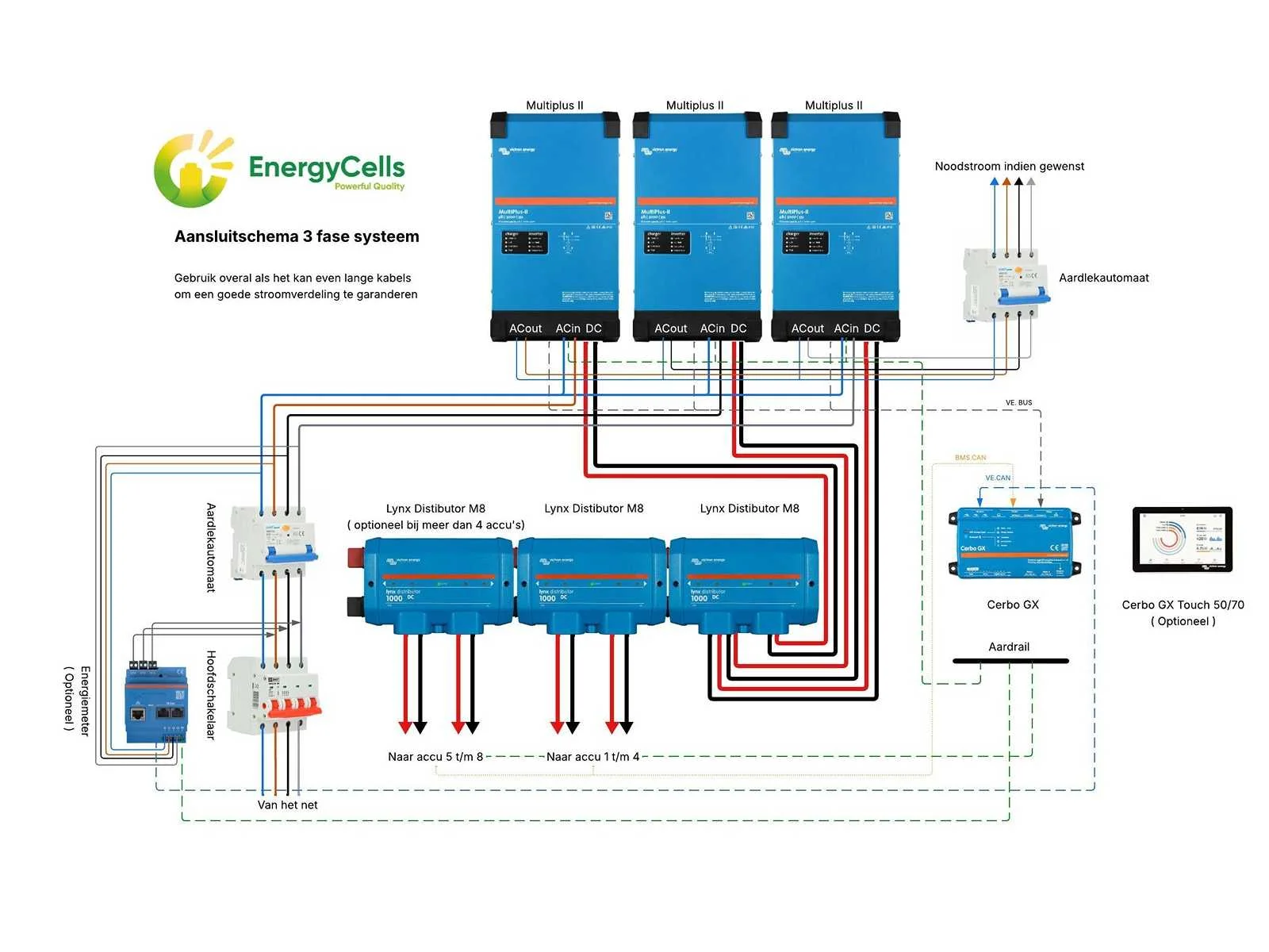 Deze set bestaat uit de volgende onderdelen: - 2x LFP accu 15kWh >10.000 cycles - 3x Multiplus 2 5000 - 2x Lynx Distrubutor M8 - 2x 1mtr aardedraad M6 oog - 3x Accu kabel set 1meter m8 oog 35mm2 - 2x Accu kabel set 1 meter m8 oog 50mm2 - 1x BMS CAN communicatie kabel 1 meter - 4x RJ45 communicatie kabel 1 meter - Cerbo GX - Zekeringen ( 3x 100A, 2x 200A ) Het totale omvormvermogen bedraag 12kW (12000W) en een accu capaciteit van 30kWh. Het systeem komt met 5 jaar garantie op het Victron apparatuur en 10 jaar garantie op de accu’s. Het systeem werkt met alle PV systemen Handel op de energie markt is mogelijk met dit systeem. Voor meer informatie en specificaties zie meertalige bijlage. Nee Merk: Victron Type: 15kVA 30kWh Vermogen: 12000W Aansluiting: 230V 3-fase: true