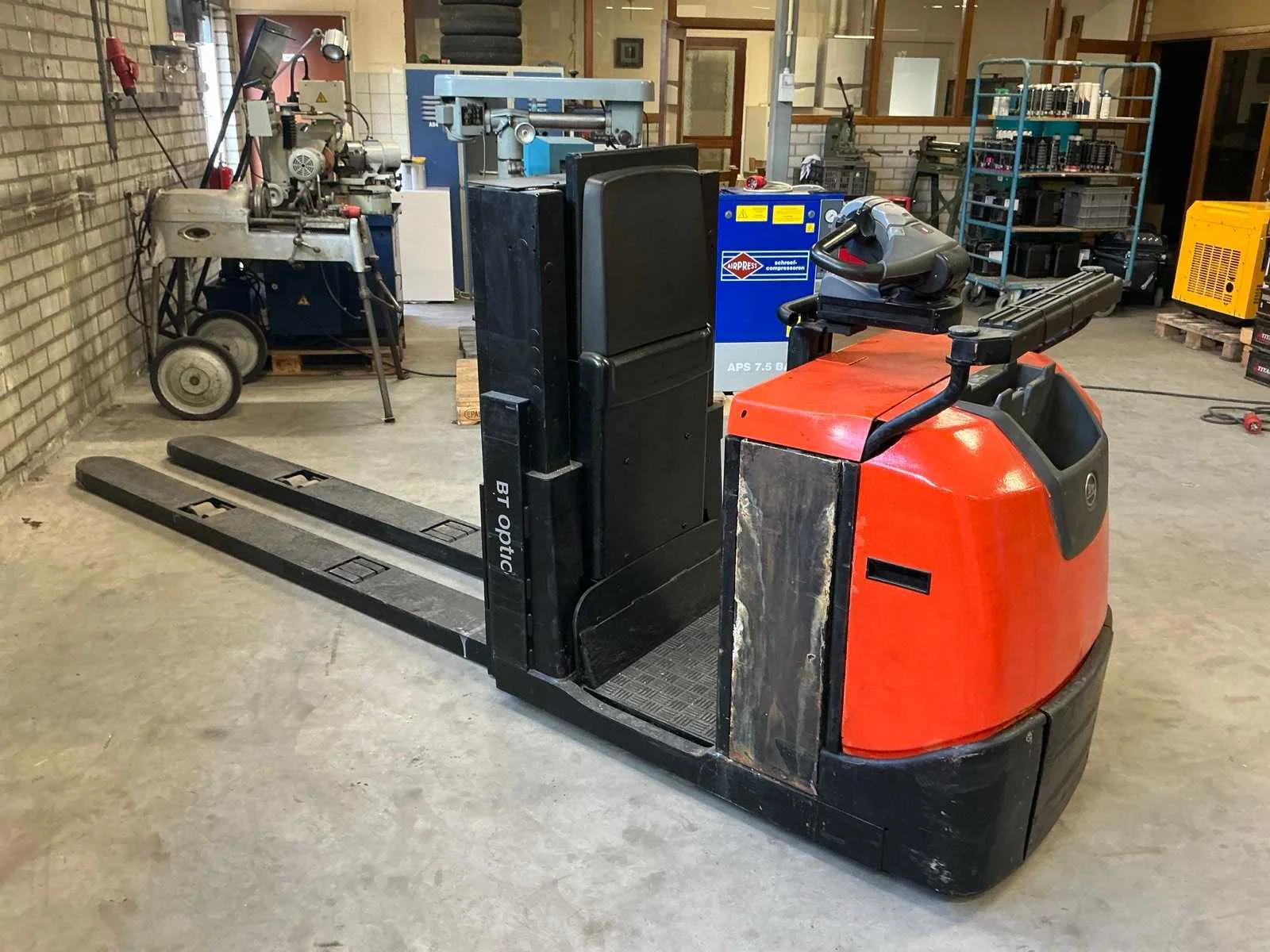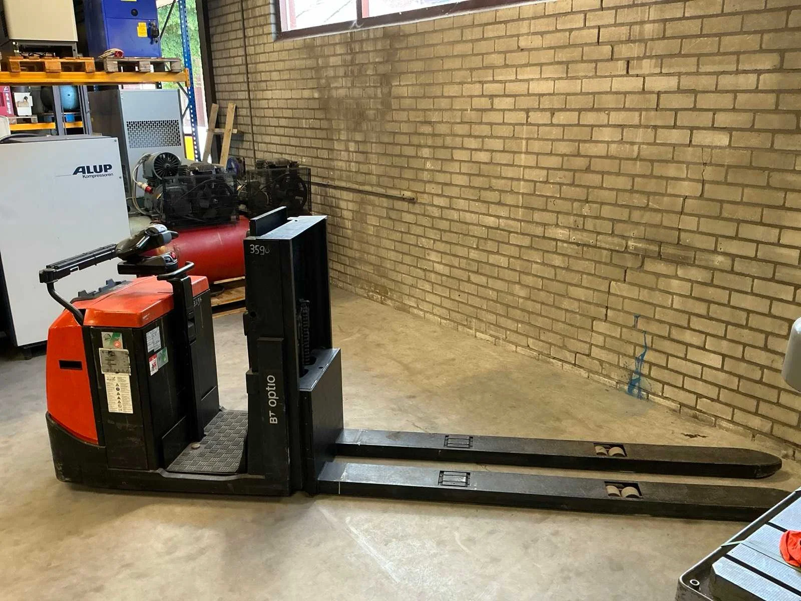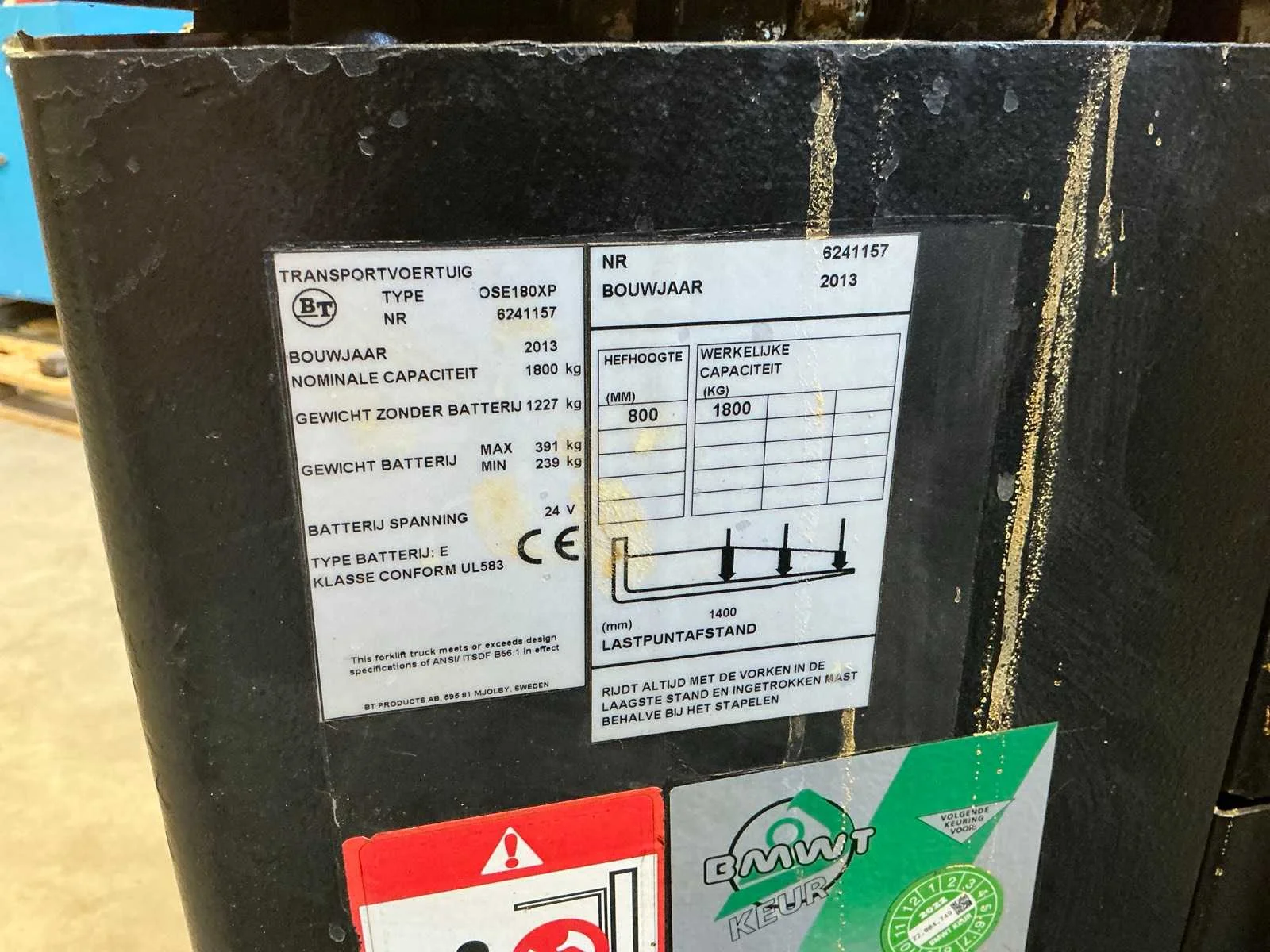 Voorzien van: lepels 2350mm, noodstop, display, documentatie. Nee Merk: BT Type: OSE180 XP Bouwjaar: 2013 Serienummer: 6241157 Hefvermogen: 1800kg Lepellengte: 2350mm Meerij palletwagen: true Afgelezen urenstand: 3990 Eigen gewicht: 1600kg Totale afmeting L: 2380mm Totale afmeting Breedte: 850mm Totale afmeting Hoogte: 1400mm
