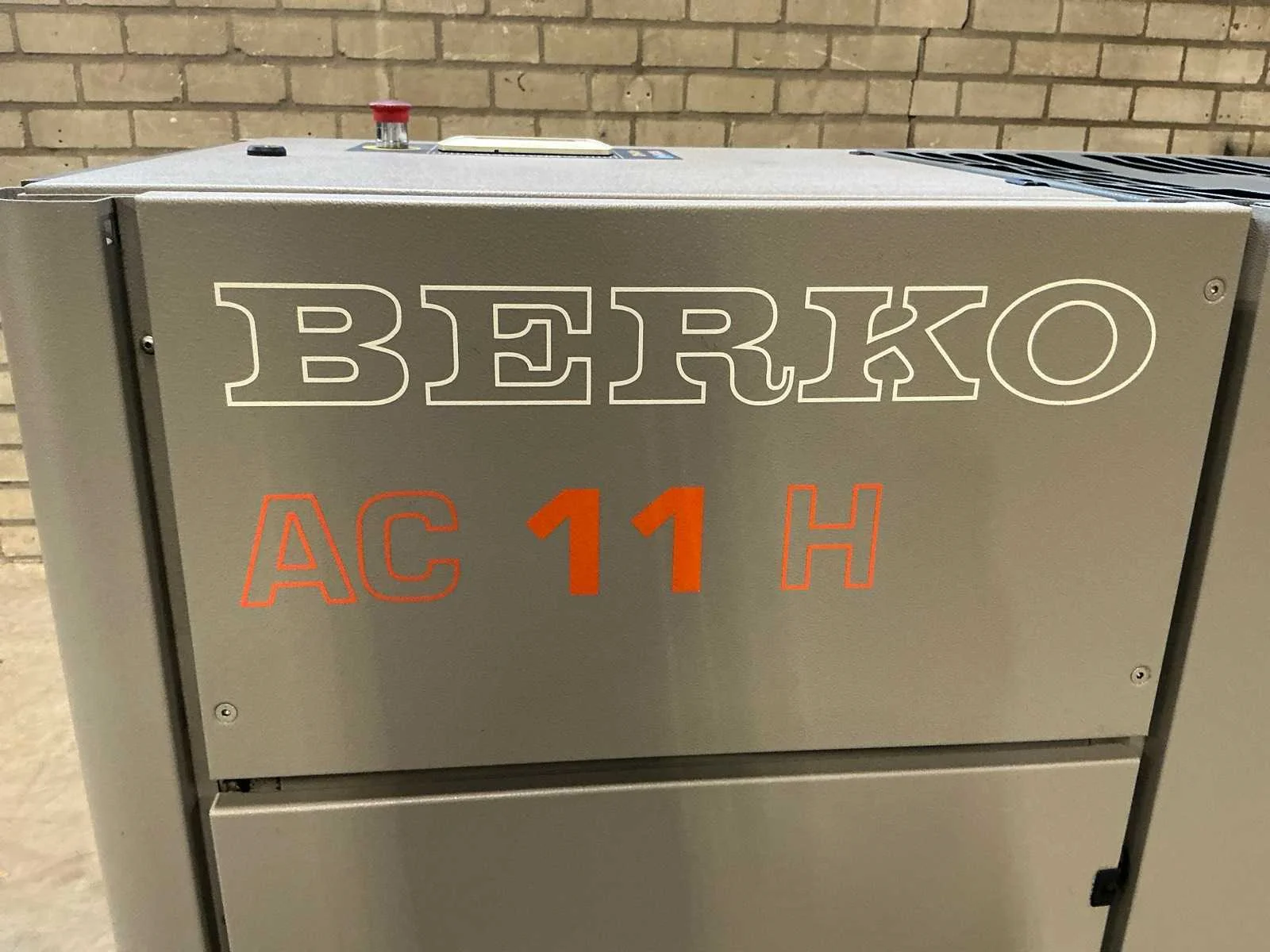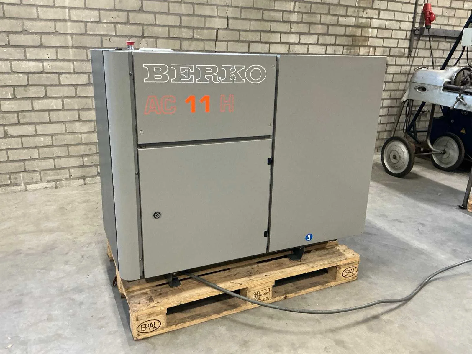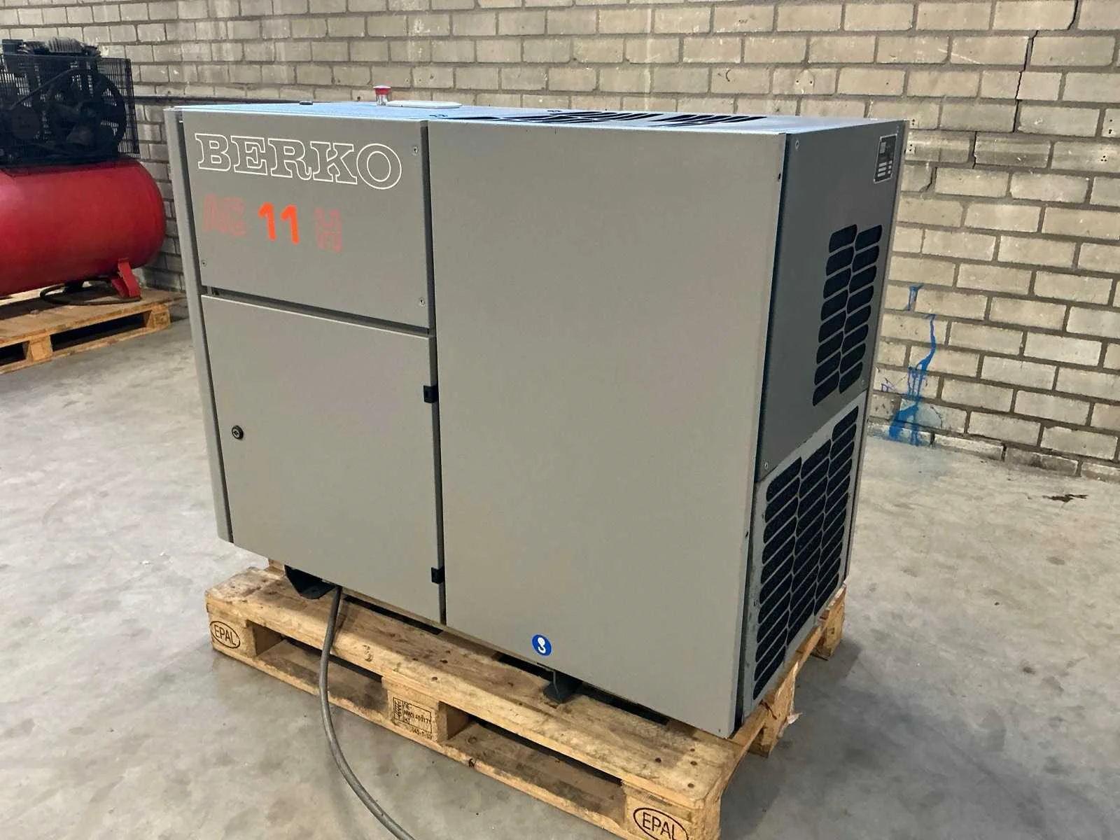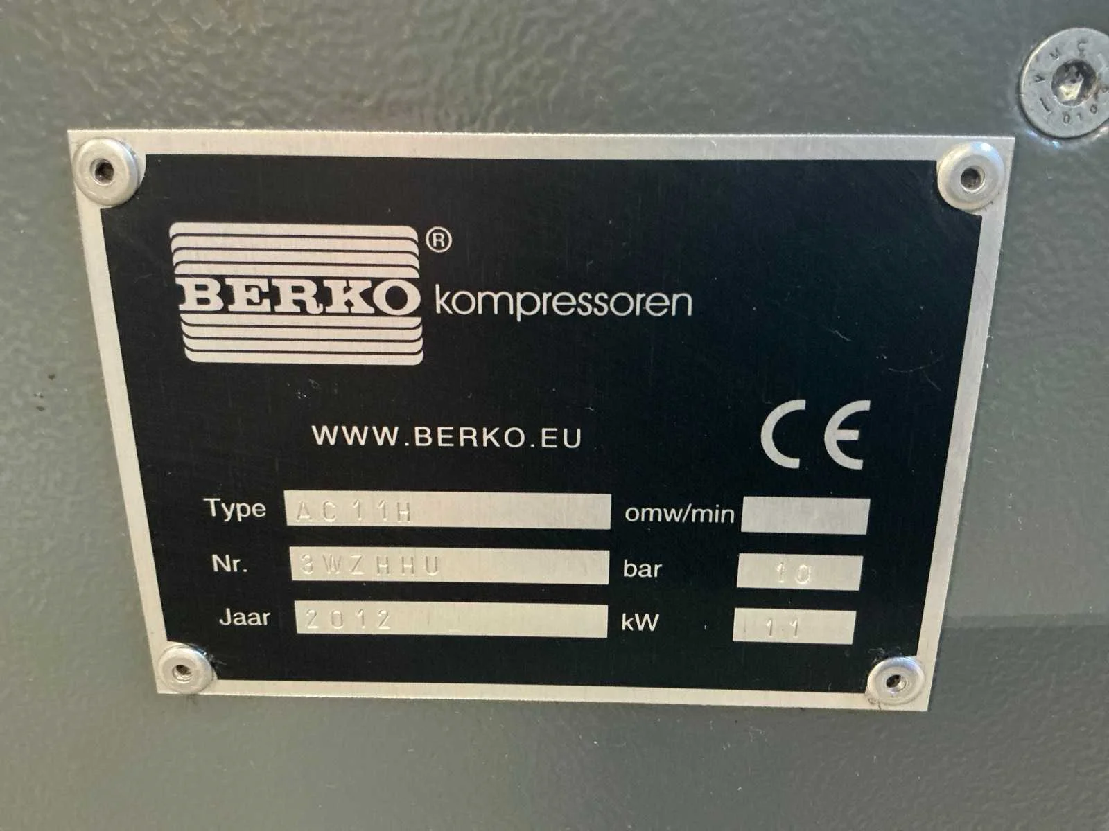 Voorzien van: noodstop, lcd display, schotten compressor. Nee Merk: Berko Type: AC11 H Bouwjaar: 2012 Serienummer: 3WZHHU Capaciteit.: 10bar Vermogen: 11kW Afgelezen urenstand: 55876 Aansluiting: 380V Totale afmeting L: 650mm Totale afmeting Breedte: 1300mm Totale afmeting Hoogte: 1050mm