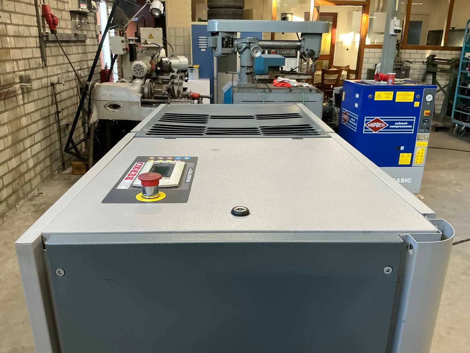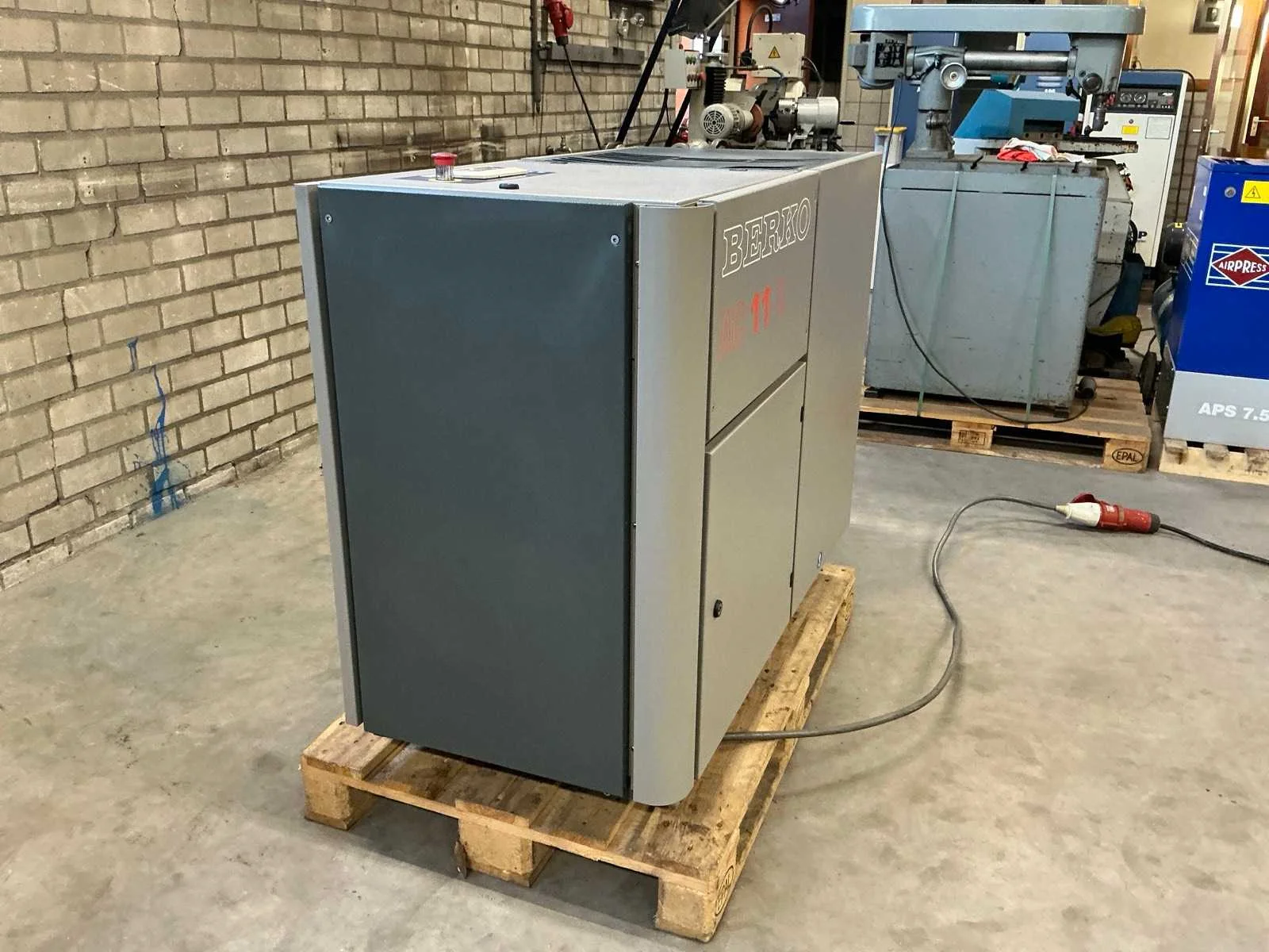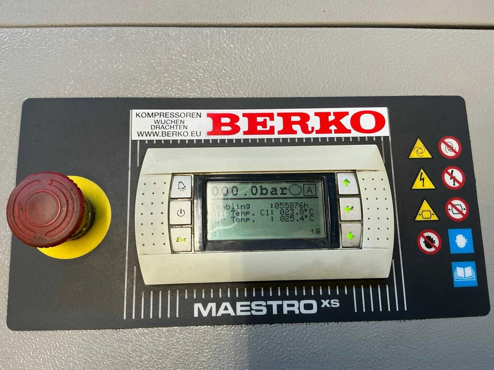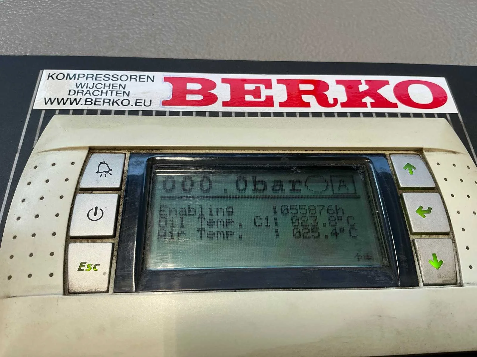 Voorzien van: noodstop, lcd display, schotten compressor. Nee Merk: Berko Type: AC11 H Bouwjaar: 2012 Serienummer: 3WZHHU Capaciteit.: 10bar Vermogen: 11kW Afgelezen urenstand: 55876 Aansluiting: 380V Totale afmeting L: 650mm Totale afmeting Breedte: 1300mm Totale afmeting Hoogte: 1050mm