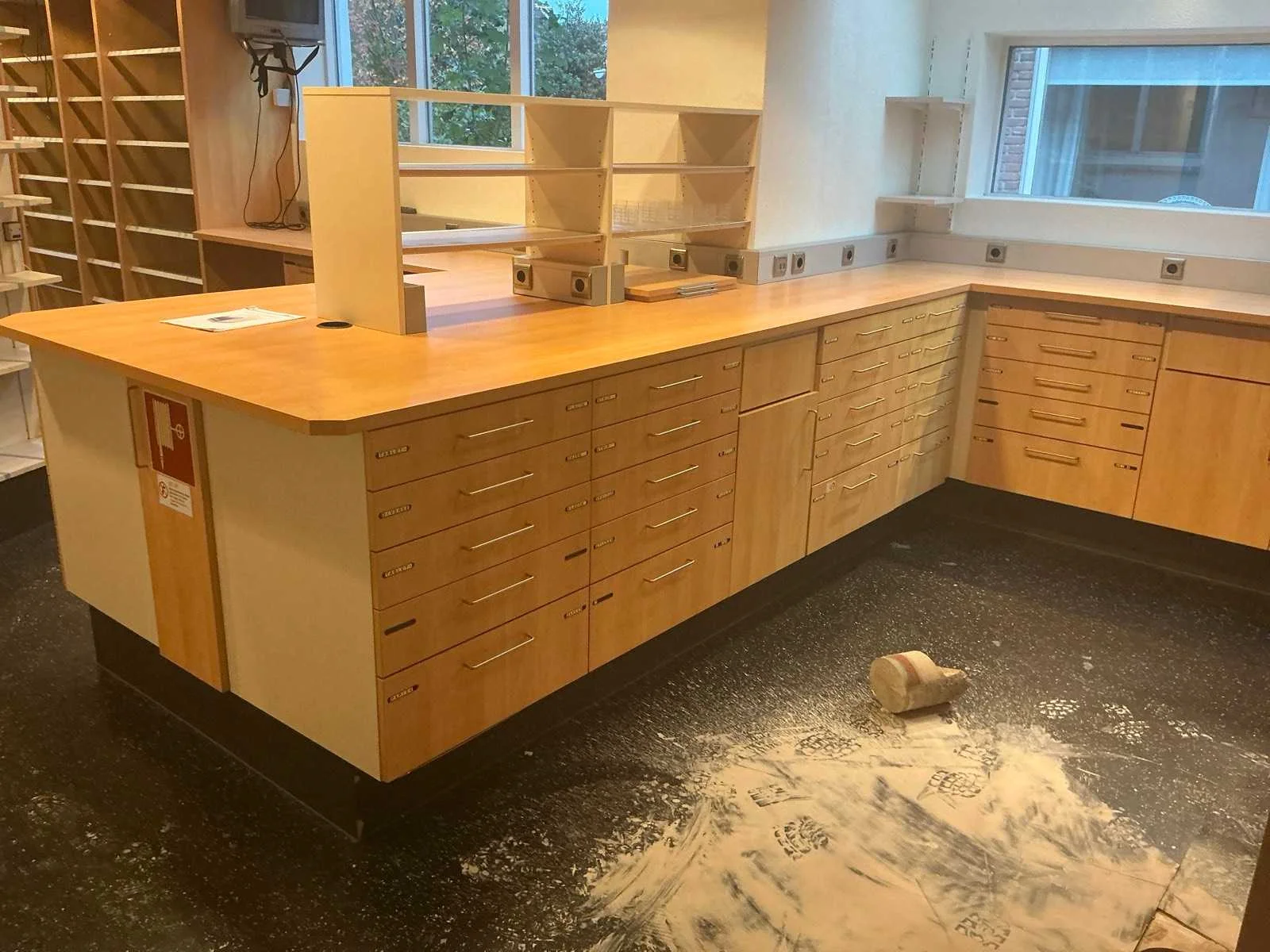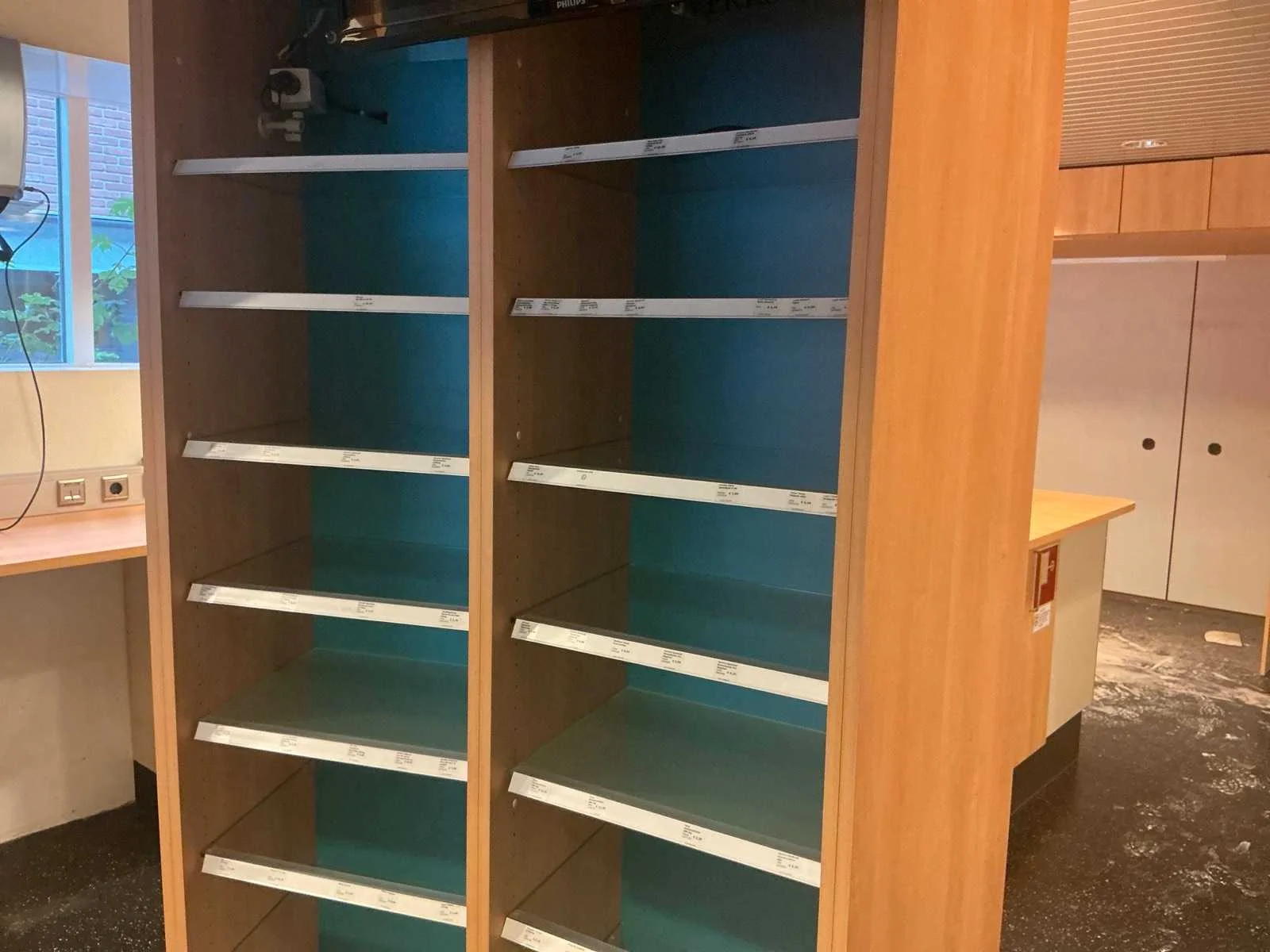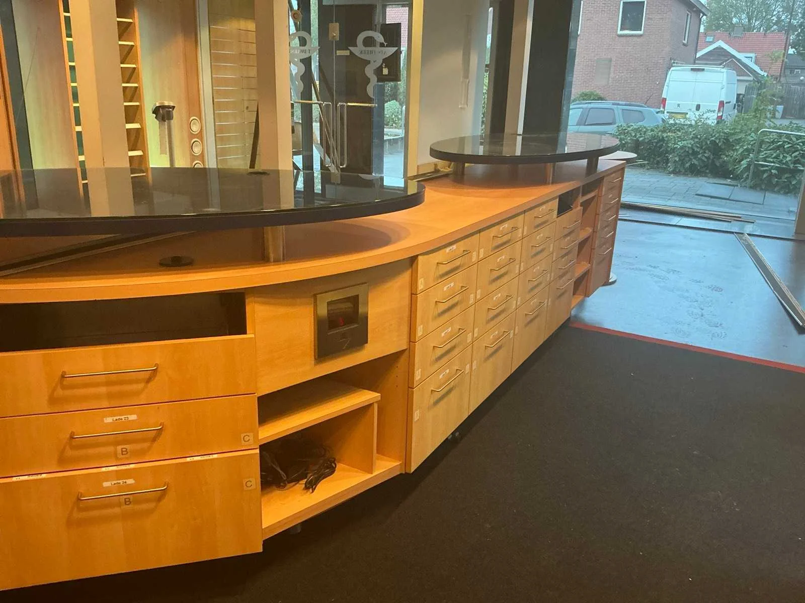 Diverse voorraad kasten waar onder 4 van 3 meter; 1 kast van 6 meter; Toonbanken; voorraad kasten winkel; televisies; Rolstoelen; Kastwanden; Kaartjes trekker: 3 stoelen 1 Bank; White board; Brandslang; Brandkast Nee Merk: Apotheek interieur