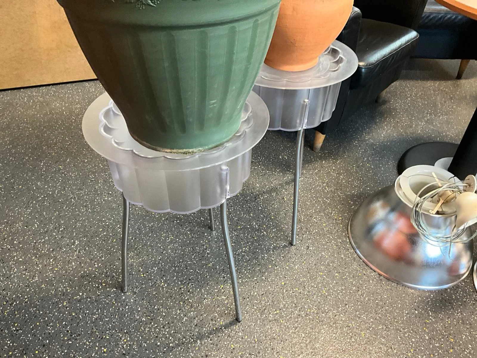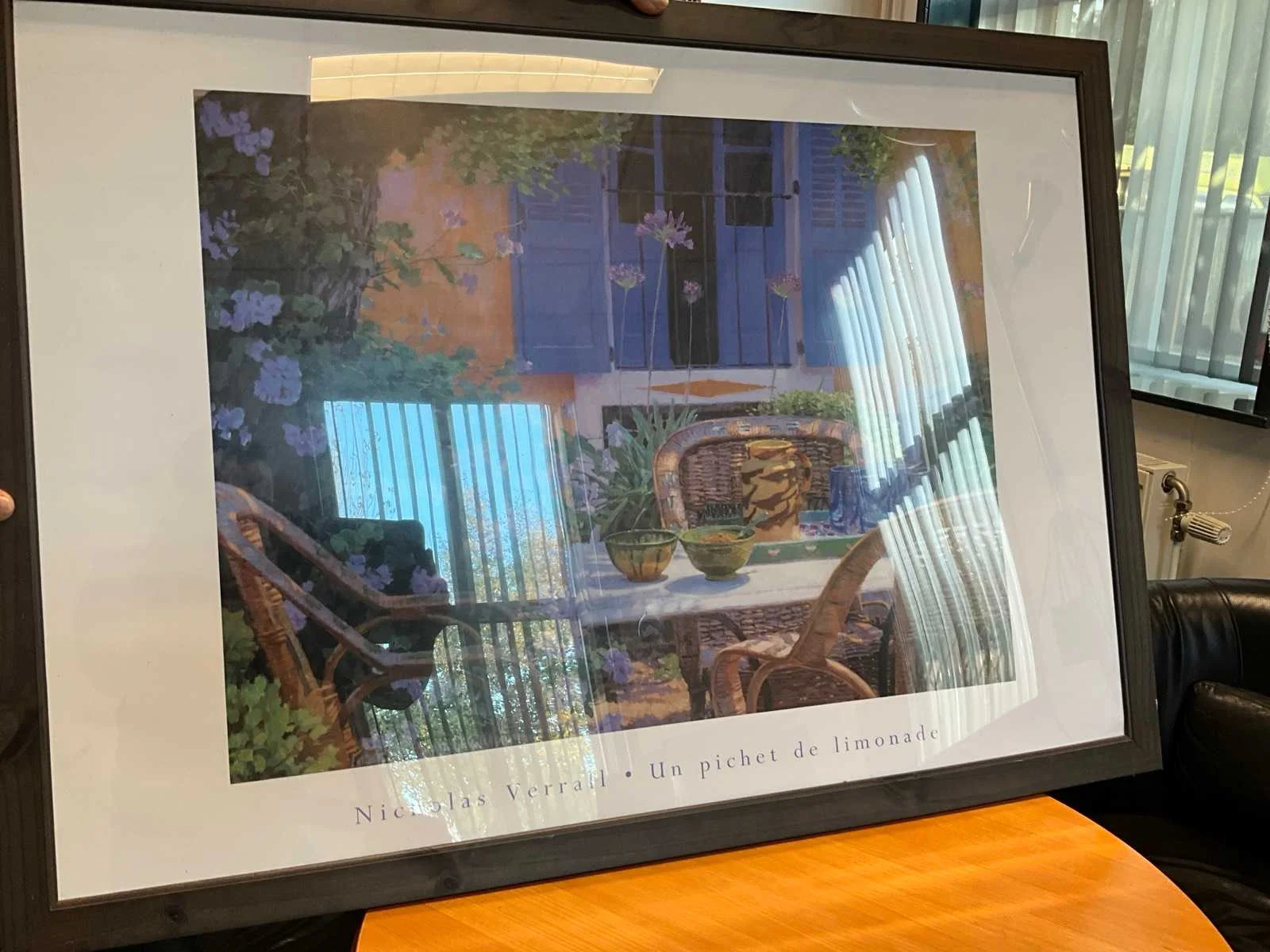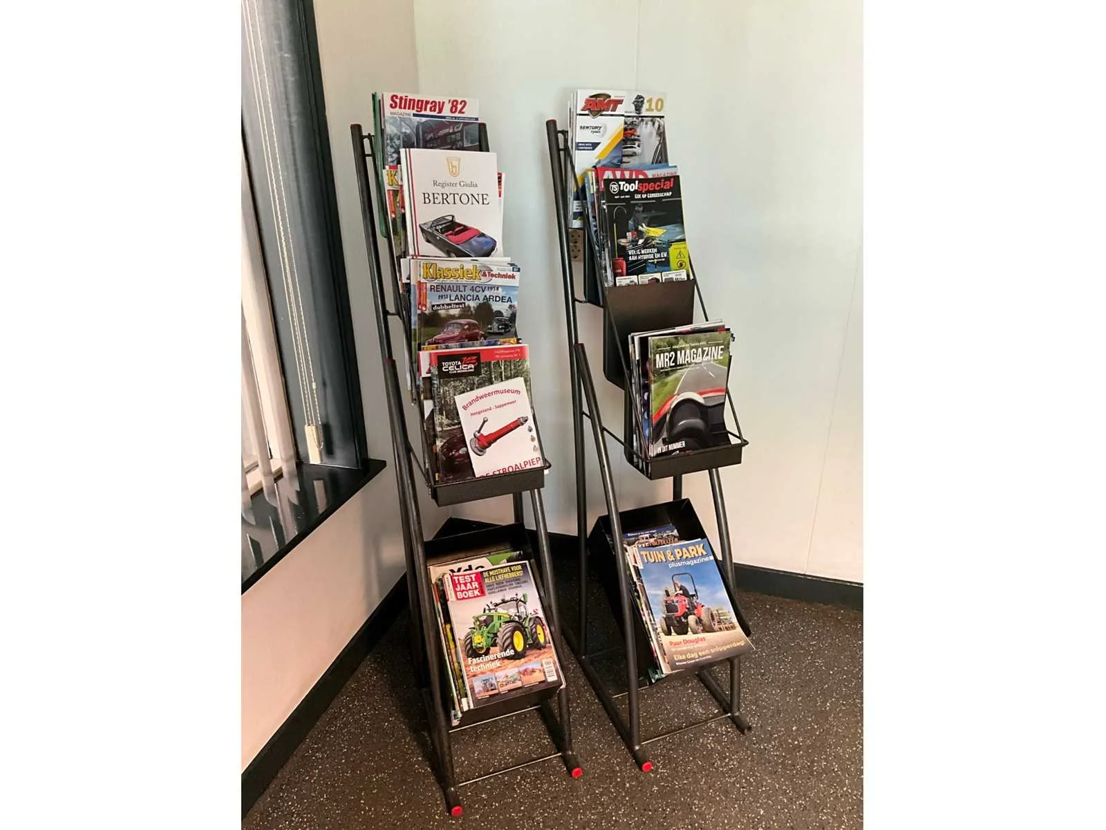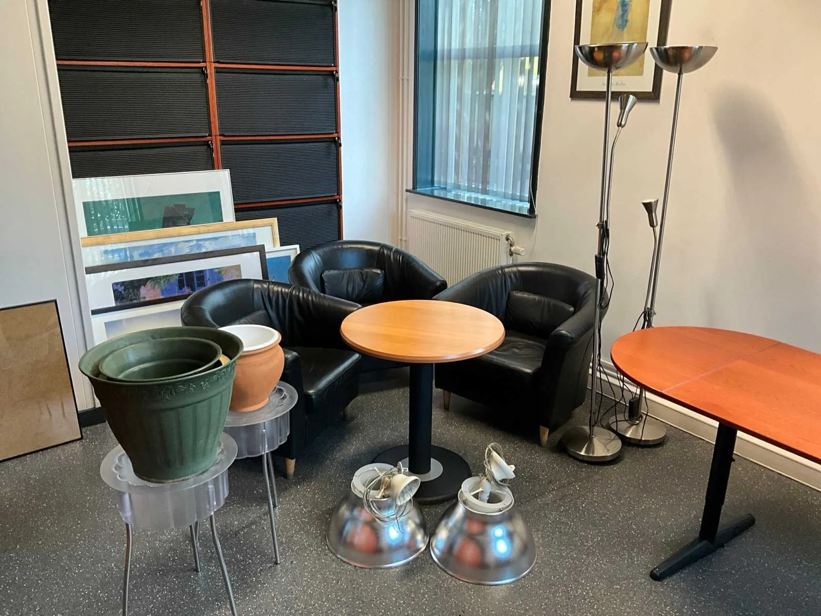 Betreft, 2x tafel 2x folderrek (inclusief folder) ca. 145 cm hoog 2x hanglamp 2x kapstok met hangers ( verrijdbaar) 6x Schilderij/kunstwerk Partij bloempotten 2x staande lamp 3x stoel+ tafel Nee
