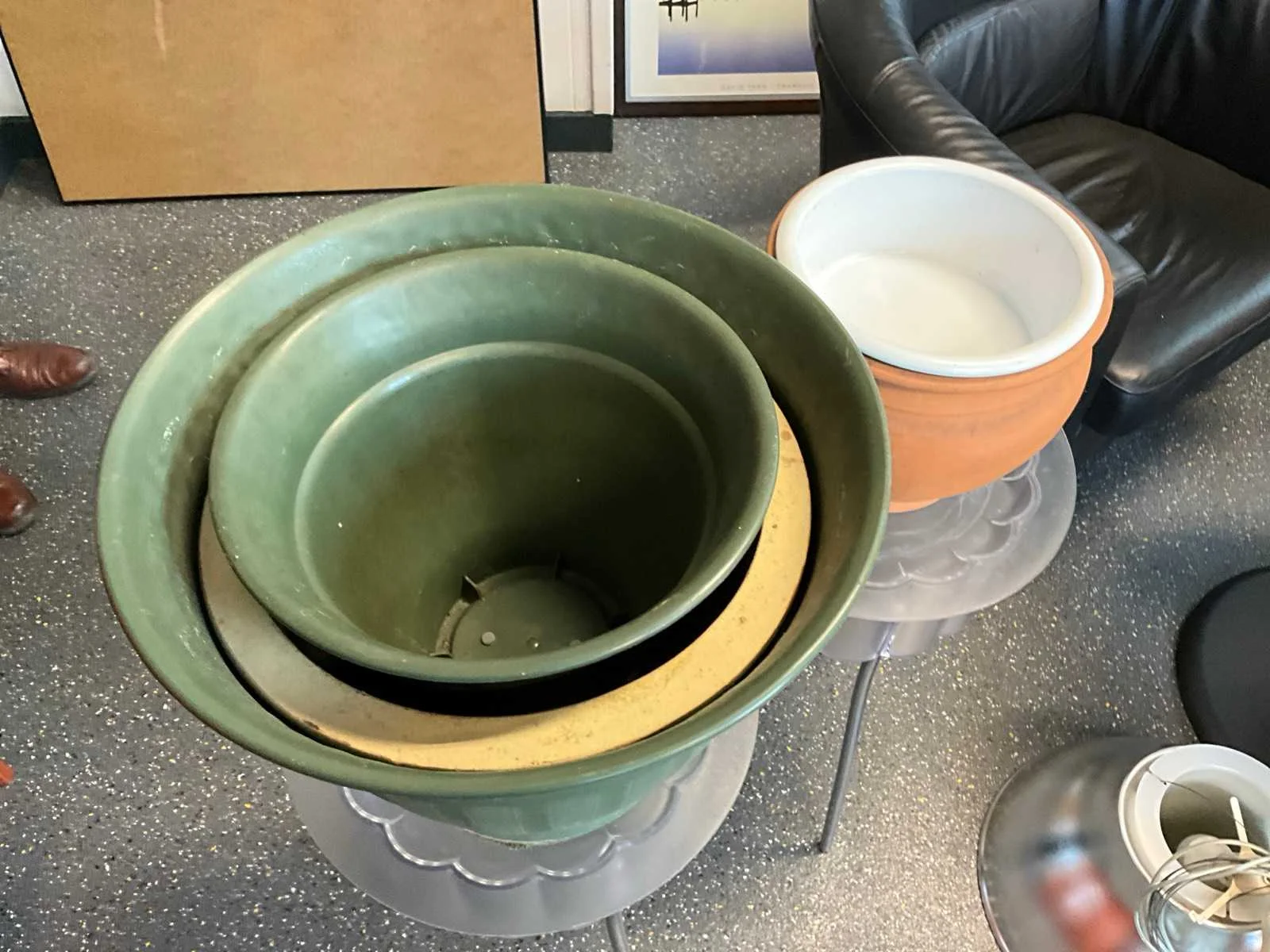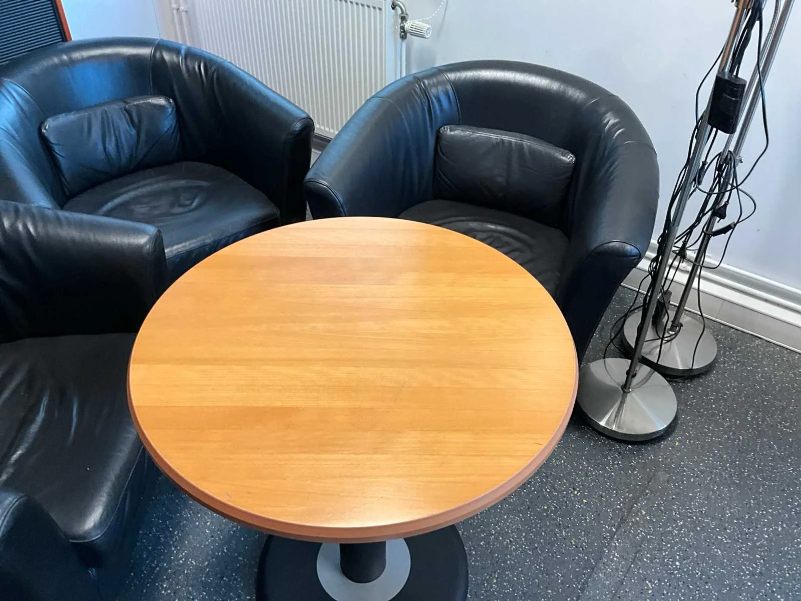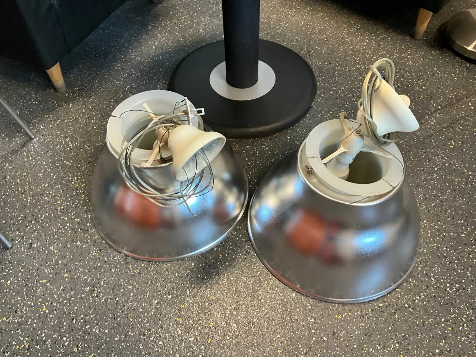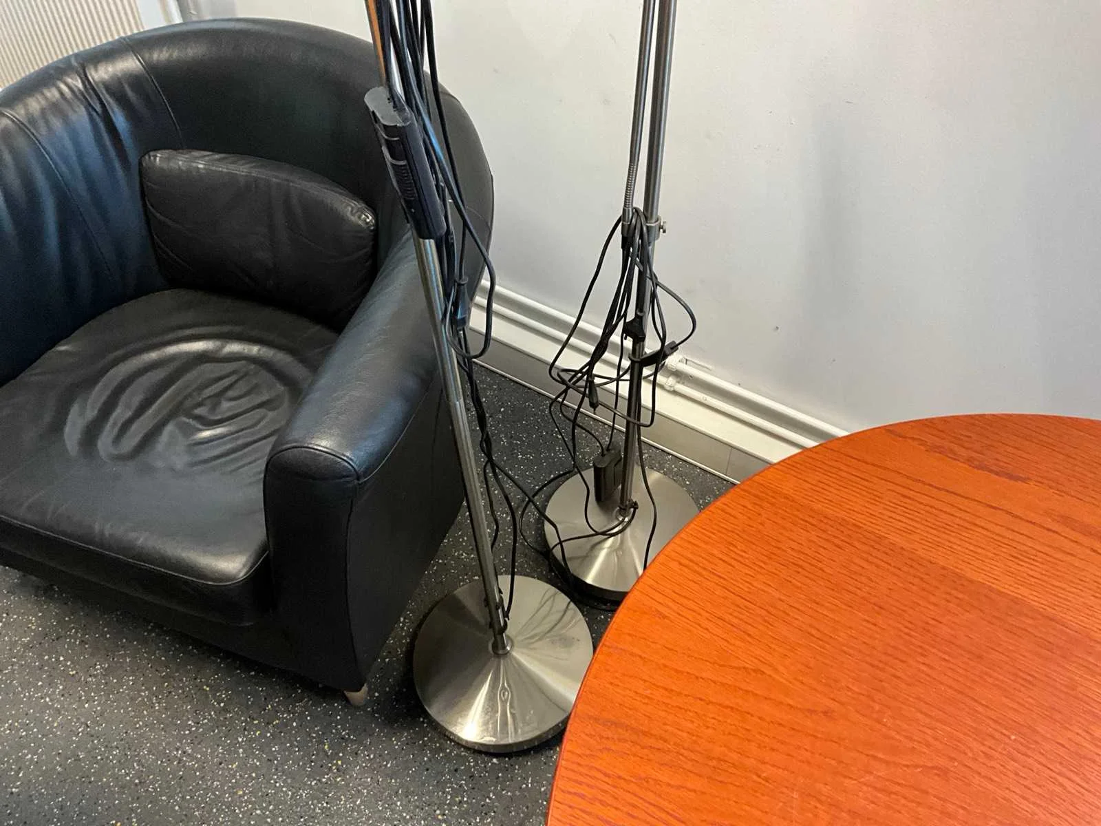 Betreft, 2x tafel 2x folderrek (inclusief folder) ca. 145 cm hoog 2x hanglamp 2x kapstok met hangers ( verrijdbaar) 6x Schilderij/kunstwerk Partij bloempotten 2x staande lamp 3x stoel+ tafel Nee