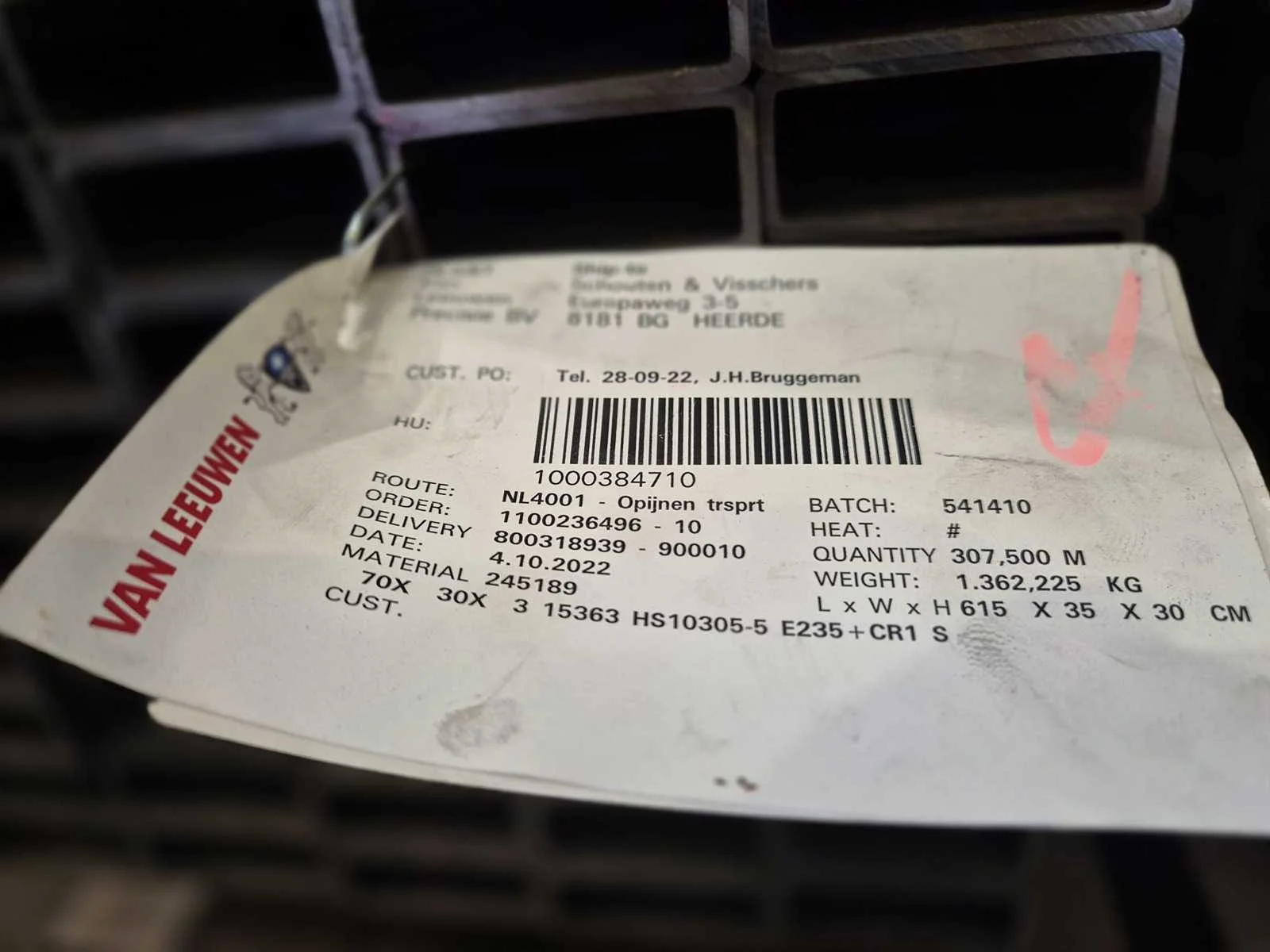 Stalen kokerprofielen E235 + CR1 S2, afmeting 70x30x3mm Lengte 6150mm, leverancier van Leeuwen Precisie BV, aantal bundels: 1, gewicht per bundel ca 1362kg totaal: 1362kg No Type: E235 + CR1 S2