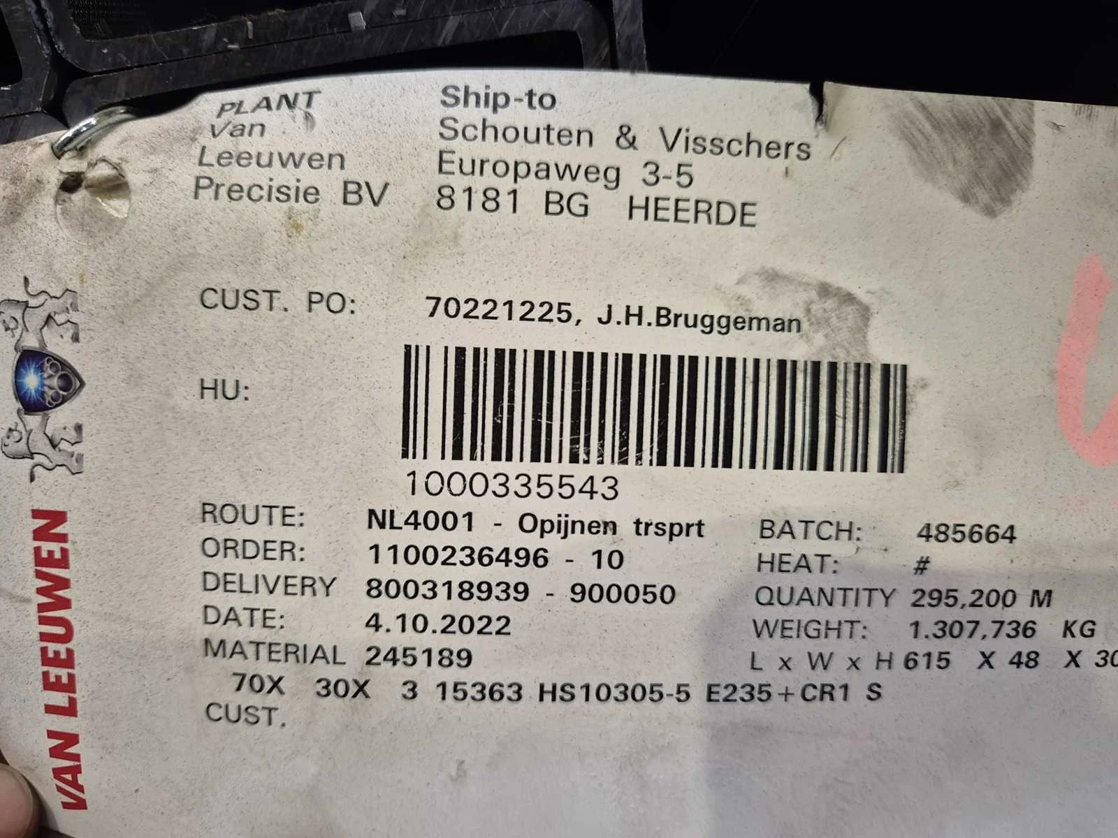 Stalen kokerprofielen E235 + CR1 S2, afmeting 70x30x3mm Lengte 6150mm, leverancier van Leeuwen Precisie BV, aantal bundels: 1, gewicht per bundel ca 1307kg totaal: 1307kg No Type: E235 + CR1 S2