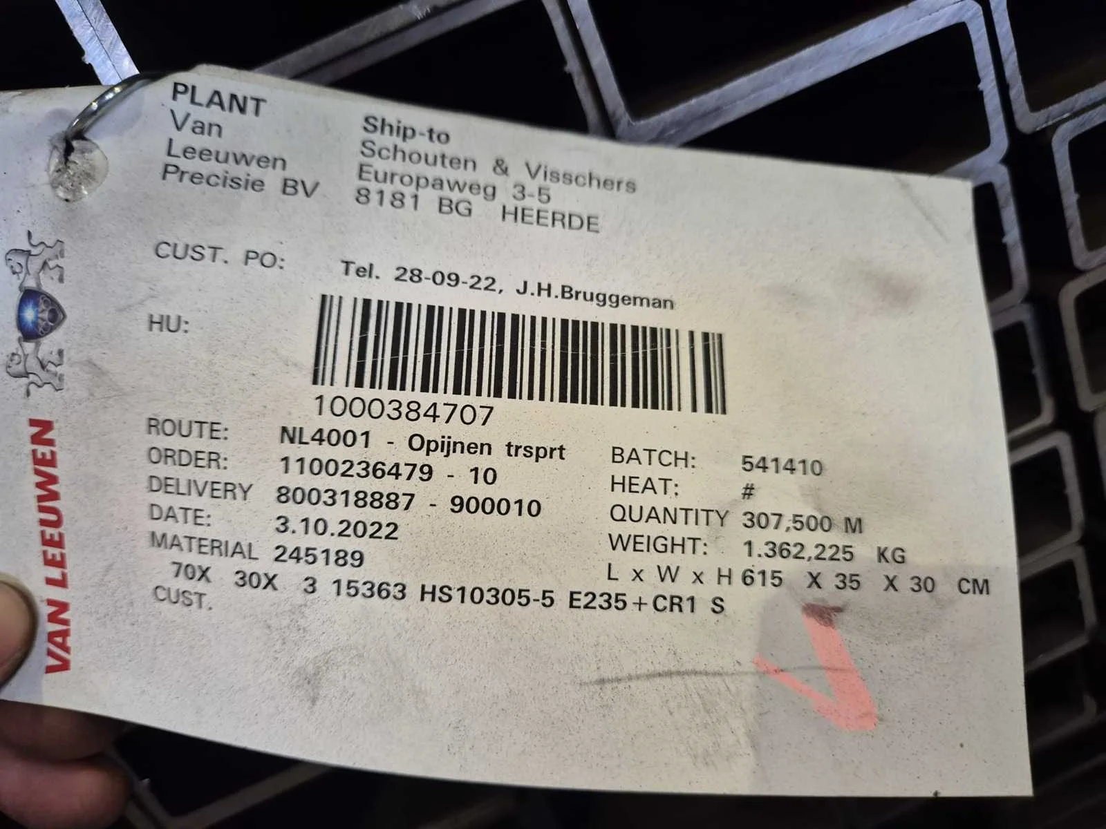 Stalen kokerprofielen E235 + CR1 S2, afmeting 70x30x3mm Lengte 6150mm, leverancier van Leeuwen Precisie BV, aantal bundels: 1, gewicht per bundel ca 1362kg totaal: 1362kg No Type: E235 + CR1 S2