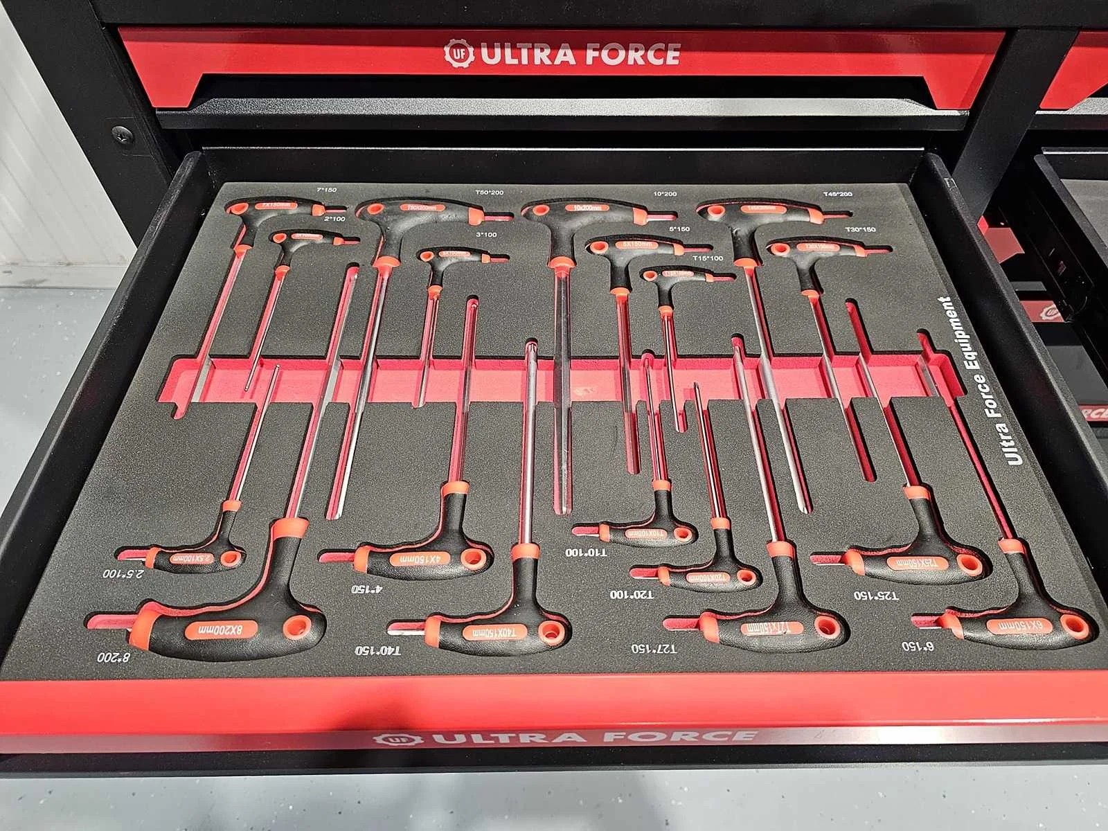 Gereedschapswagen met 12 stevige gereedschapsladen waarvan 10 laden volledig gevuld 2 zwenkwielen met rem Nee Merk: Ultra Force Equipment Type: Redline XL Bouwjaar: 2025 Aantal laden: 12 Met inhoud: true Eigen gewicht: 130kg Totale afmeting L: 445mm Totale afmeting Breedte: 1080mm Totale afmeting Hoogte: 965mm