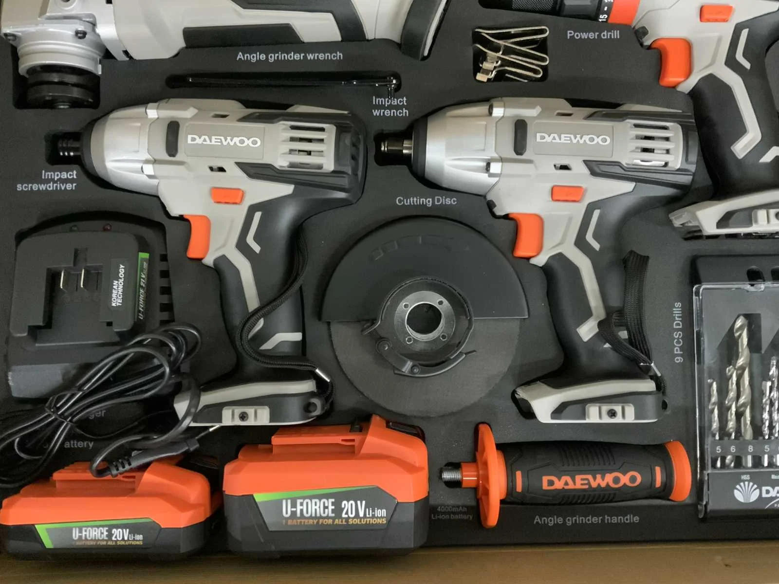 4 delige accu gereedschapset 2 accu’s 20V schroef-boormachine haakse slijper met inlay 4 slijpschijven slag moer machine moerklopper set boortjes accu lader Nee Merk: Daewoo Type: U force 4 in 1 Bouwjaar: 2025 Model: 4 delige accugereedschapset Kleur: grijs Lengte: 560cm Breedte: 420cm Hoogte: 120cm Accu lader: true