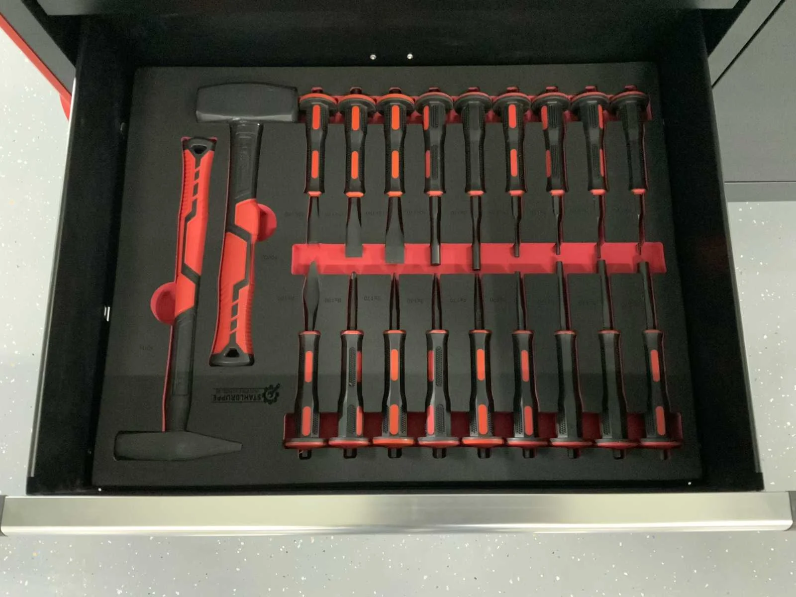 13 Laden, 9 gevuld, 327 pcs gereedschap. Kar met afneembare topbox Top box met 8 laden en boven klep Kar met 5 laden en kast met dubbele openslaande deuren Hoeken schuin afgewerkt met bumpers Stevig kunststof handvaten 2 zwenkwielen waarvan 2 geremd Hoge kwaliteit cilinder sloten Mat zwart afgewerkt met rode accenten Nee Merk: Stahlgruppe Type: XL PRO Deluxe Bouwjaar: 2025 Aantal laden: 13 Met inhoud: true