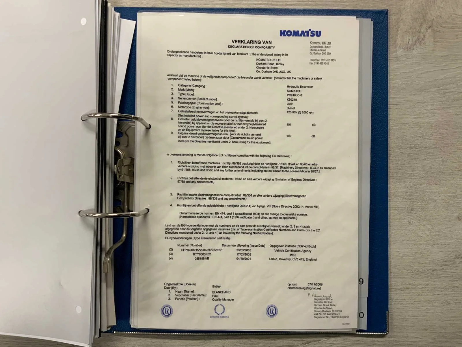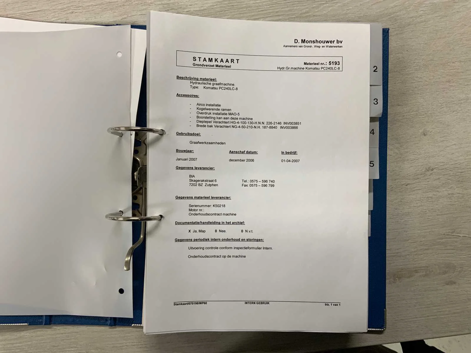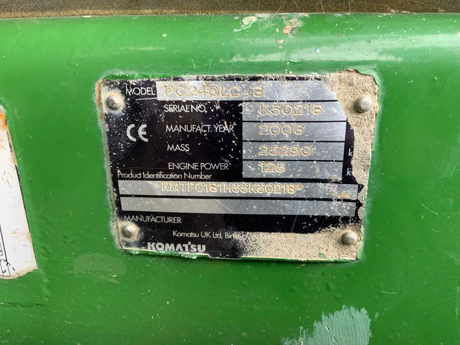 VIN nummer KMTPC161H55K50216 * Hydrauliek Extra functies * voorzien van snelkoppeling * voorzien van CCU-controller * voorzien van Verachtert graafbak 1,3M3 * voorzien van camera’s * voorzien van documentatie, gebruikershandleiding en onderhoudshistorie Nee Merk: Komatsu Type: PC240LC-8 Bouwjaar: 2006 Serienummer: K50218 Merk motor: Komatsu SAA6D107E-1, 6-cil. turbo-diesel Motorvermogen (kW): 125kW Brandstof: Diesel Max. werkbereik: 10970mm Max. graafdiepte: 7230mm Met graafbak: true Graafbak afm. l: 2060mm Graafbak afm. b: 1300mm Graafbak afm. h: 1050mm Rups breedte: 900mm Cabine: true Afgelezen urenstand: 16043 Eigen gewicht: 25290kg