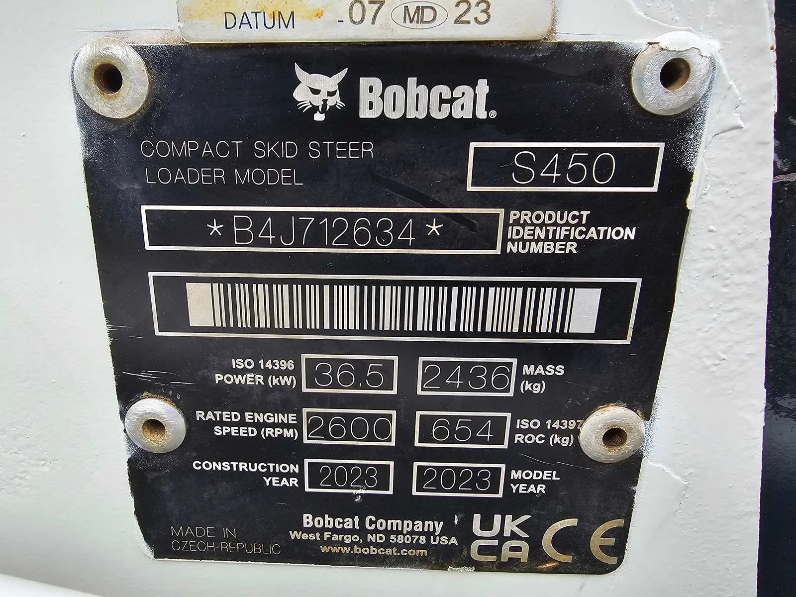 Capaciteit: 654 kg. Voorzien van: cabine, info display, werkverlichting en nieuwe banden. Nee Merk: Bobcat Type: S450 Bouwjaar: 2023 Serienummer: B4J712634 Merk motor: Bobcat Motorvermogen (kW): 36.5kW Brandstof: diesel Bedrijfsgewicht: 2221kg Bandenmaat: 10-16.5 Graafbak afm. b: 1500mm Afgelezen urenstand: 1014 Eigen gewicht: 2436kg Totale afmeting L: 2499mm Totale afmeting Breedte: 1575mm Totale afmeting Hoogte: 1976mm Leveringsvoorwaarden: Geladen op vrachtwagen