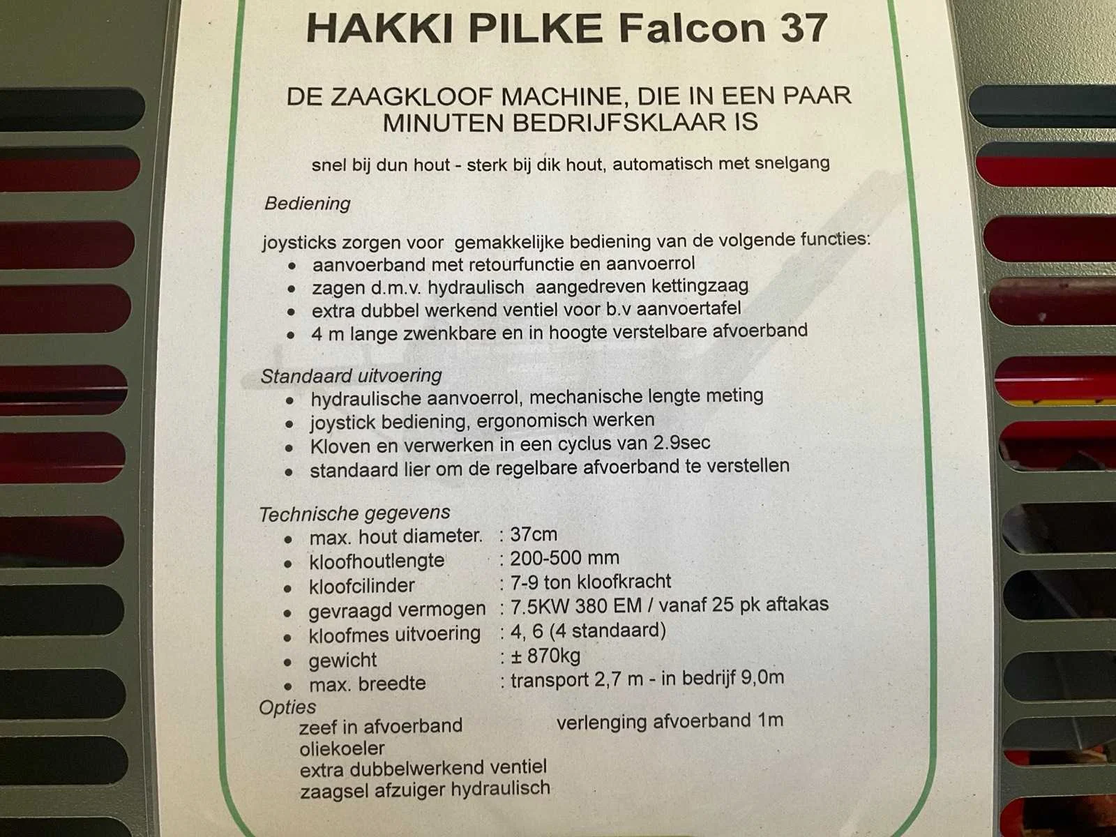 Voorzien van maximale invoer 37 cm; max kloof lengte: 200-500 mm; pro aangedreven; joystick bediening;invoerband/ afvoerband met zeef; hydraulische aangedreven; zwenkbare; hydraulisch aangedreven zaag; No Merk: Hakki pilke Type: Falcon 37 Bouwjaar: 2024 Serienummer: 3524258 Capaciteit: 9t Bloklengte max.: 500mm Eigen gewicht: 885kg