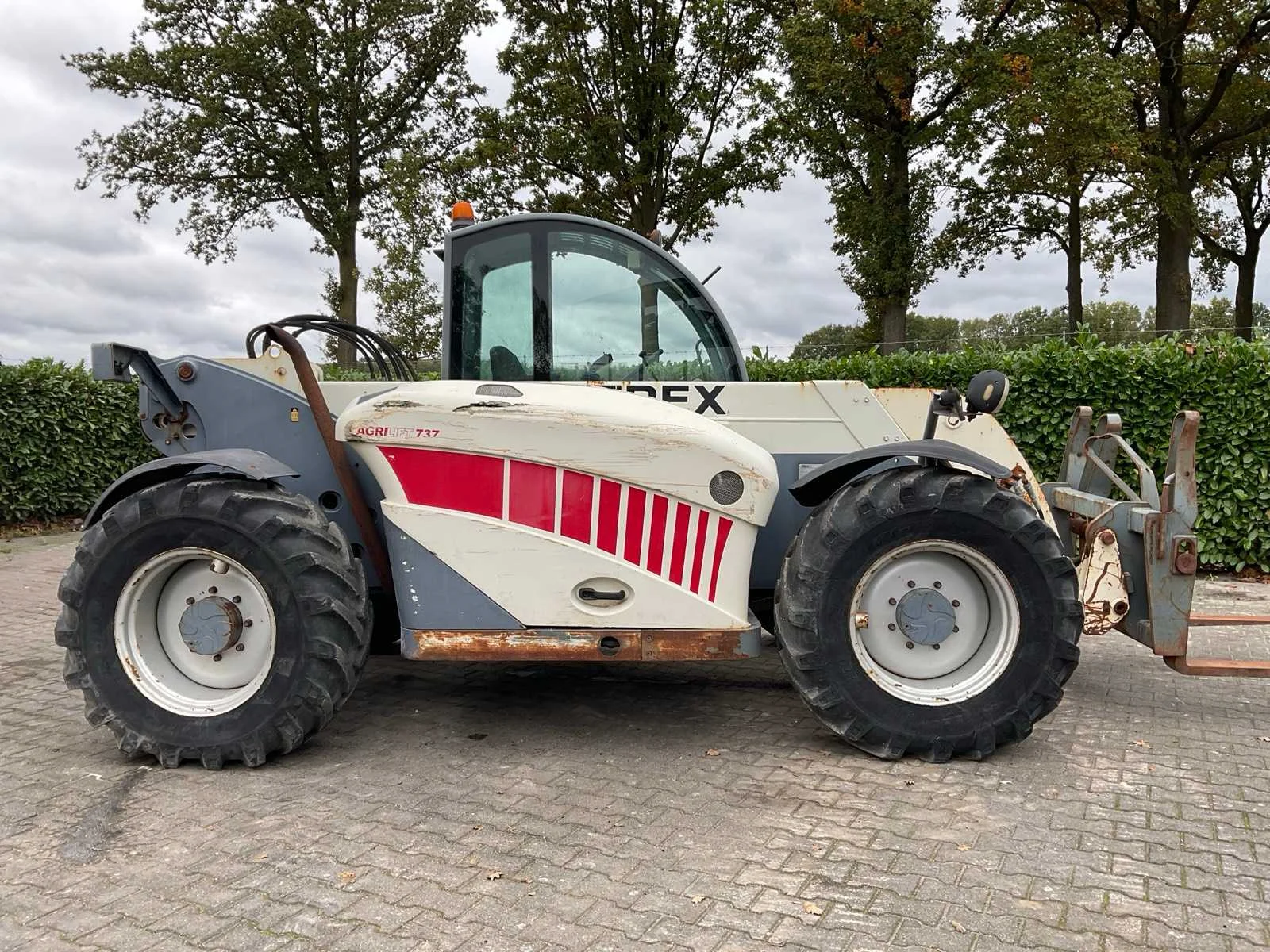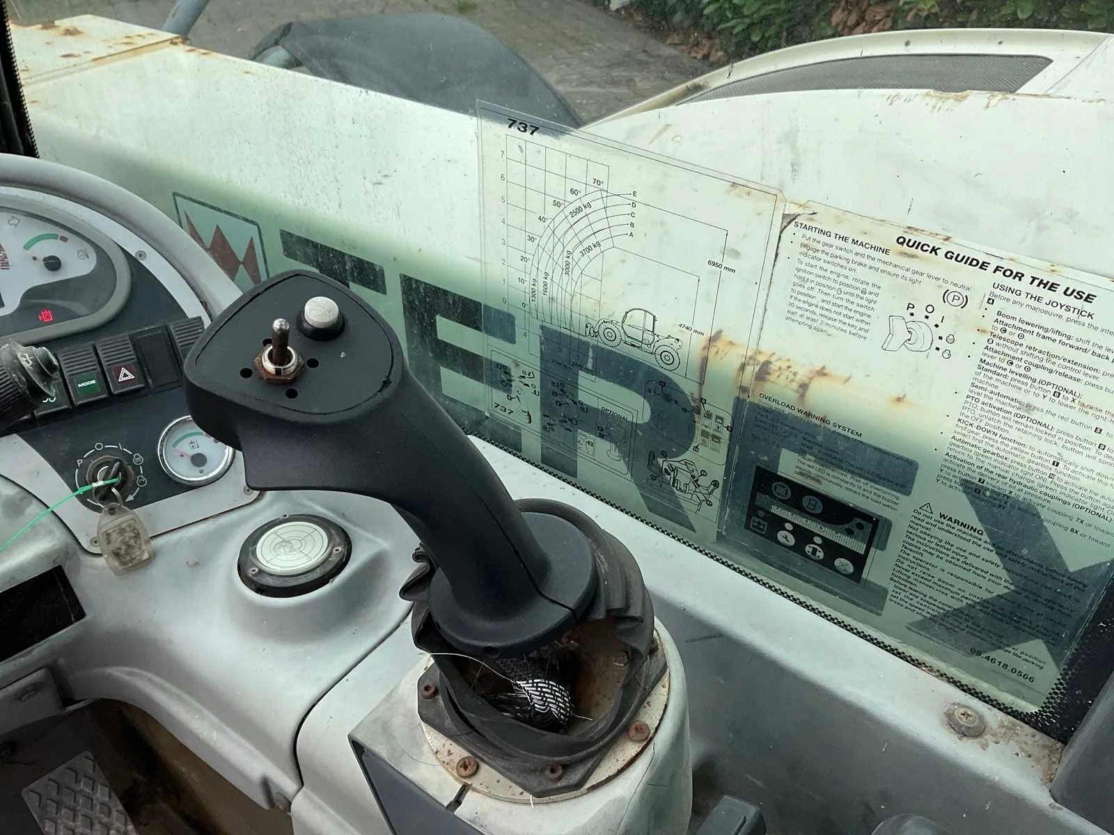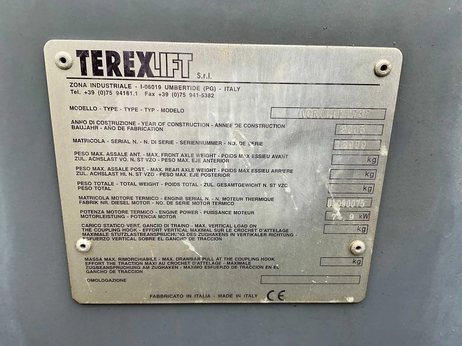 Voorzien van: hydraulische snelwissel, hydraulische functie op mast, Alliance 17.5-34 banden, 2x dubbelwerkende hydraulische functie achterzijde, trekhaak achter, Deutz 4-cilinder dieselmotor (Storing op uitschuiven mast, aansturing stuurschuif defect, werkt mechanisch wel) (geen kentekenregistratie) Nee Merk: Terex Type: Agrilift 737 Bouwjaar: 2005 Serienummer: 12900 Motorvermogen (kW): 75kW Hefvermogen: 3700kg Hefhoogte: 7000mm Cabine: true Vierwielaandrijving 4x4: true Lepellengte: 1200mm Afgelezen urenstand: 2253 Totale afmeting L: 6000mm Totale afmeting Breedte: 2400mm Totale afmeting Hoogte: 2400mm